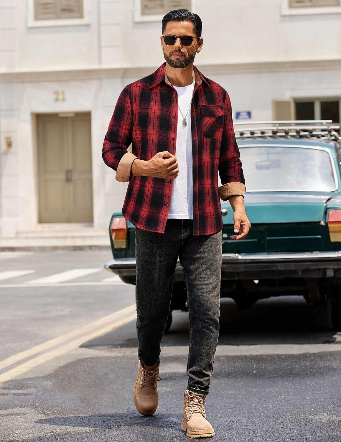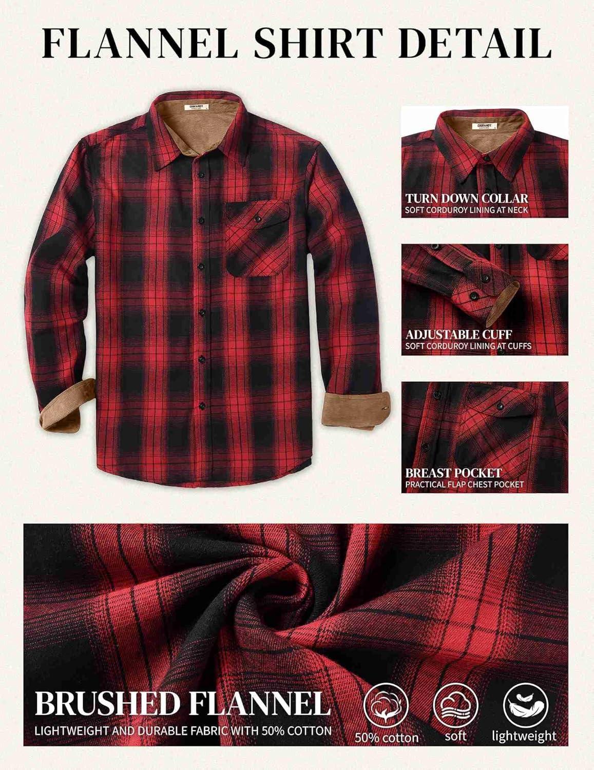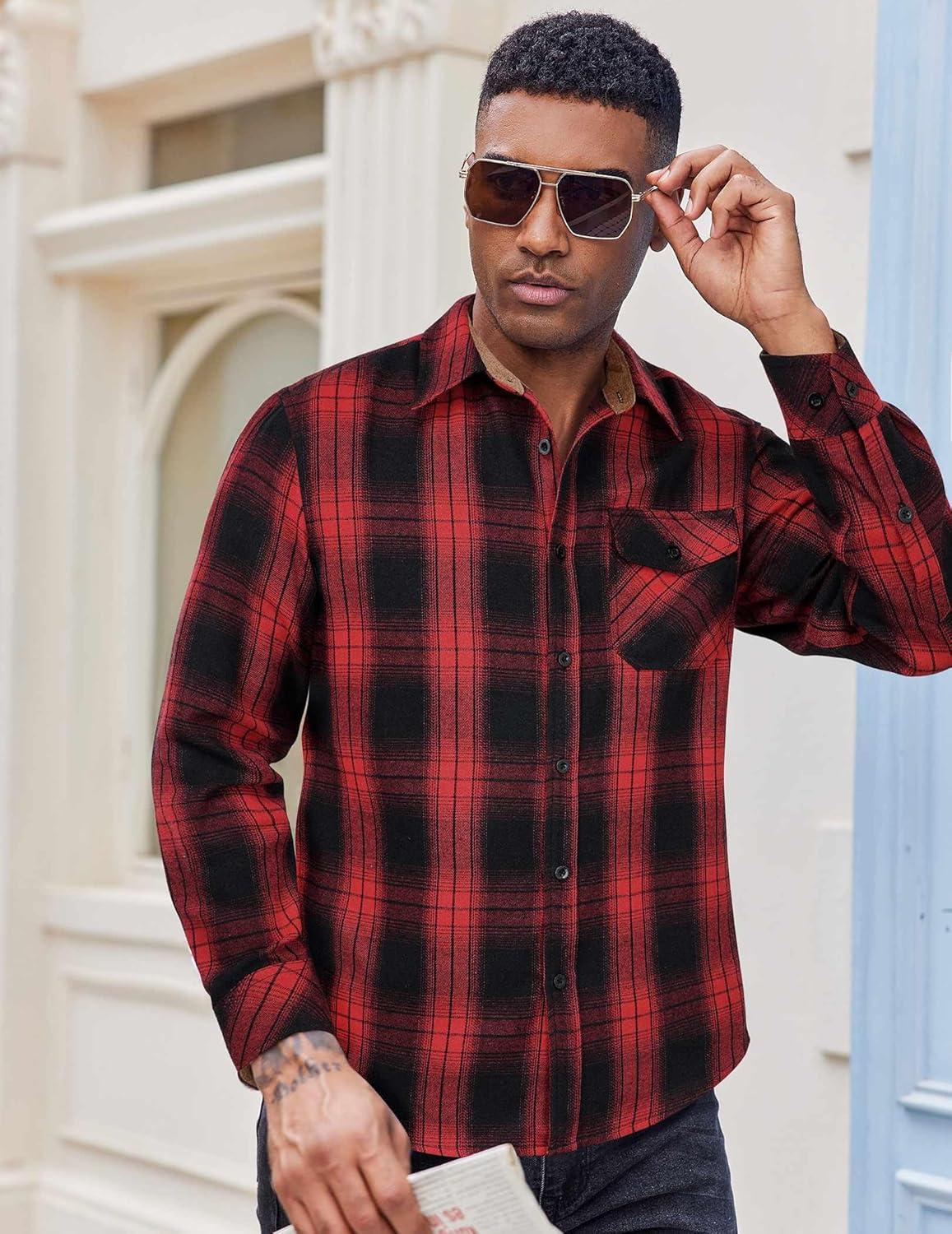 COOFANDY Mens Flannel Shirts Long Sleeve Button Down Shirt Casual Plaid Shirts with Pocket(Red Black Plaid)
