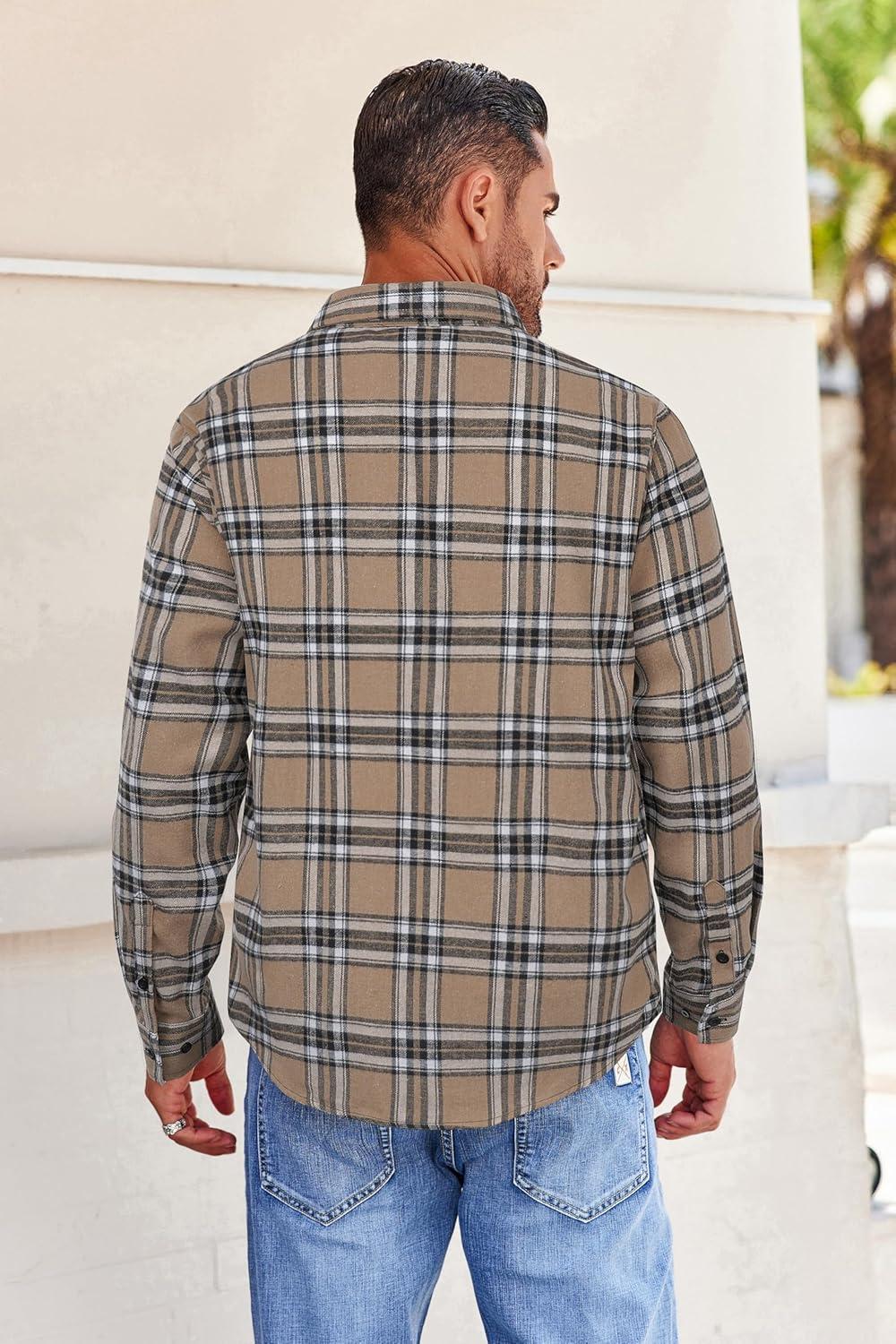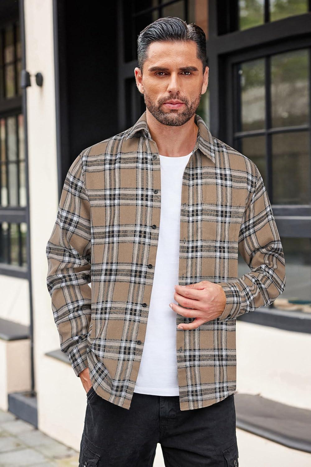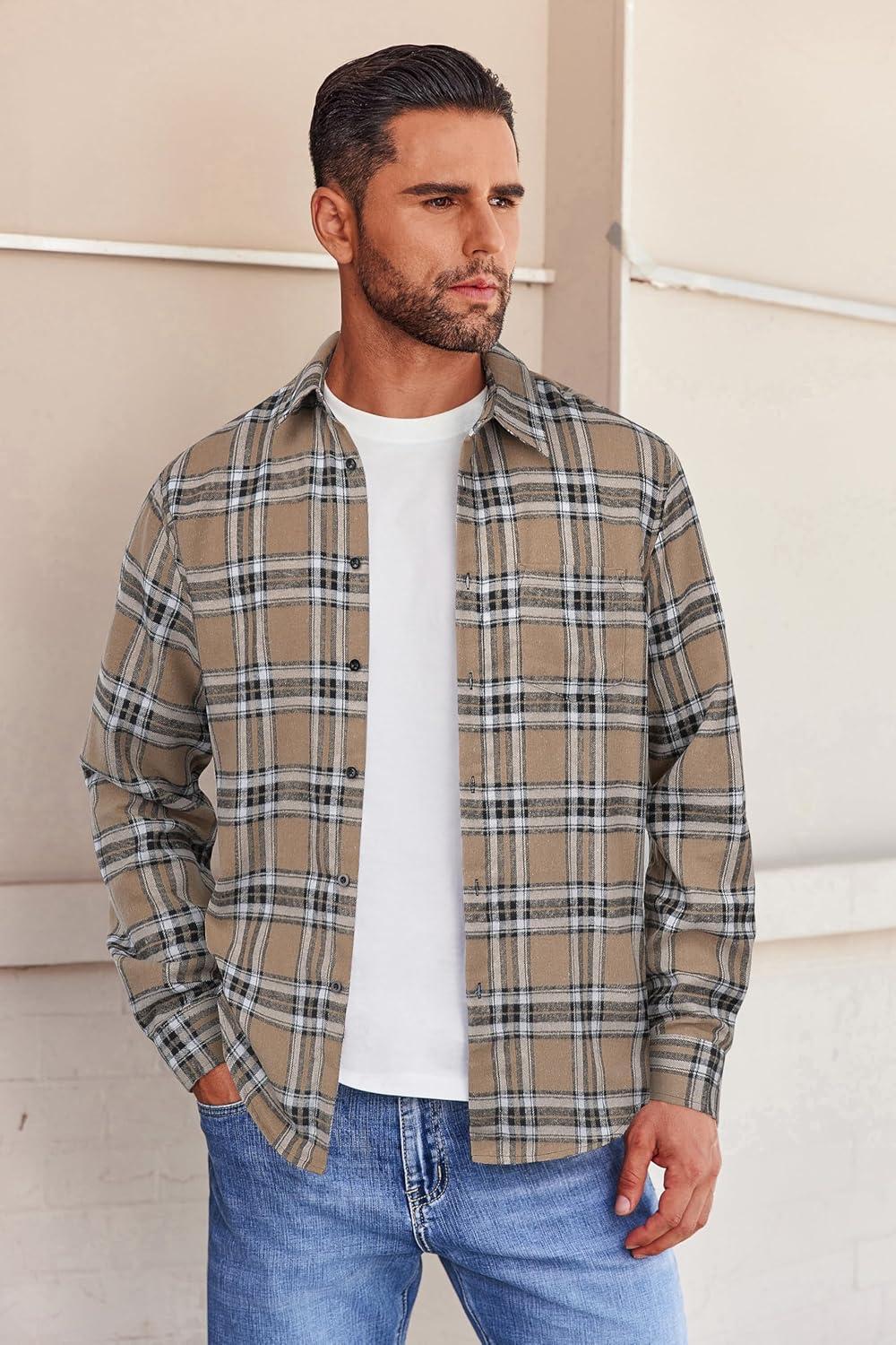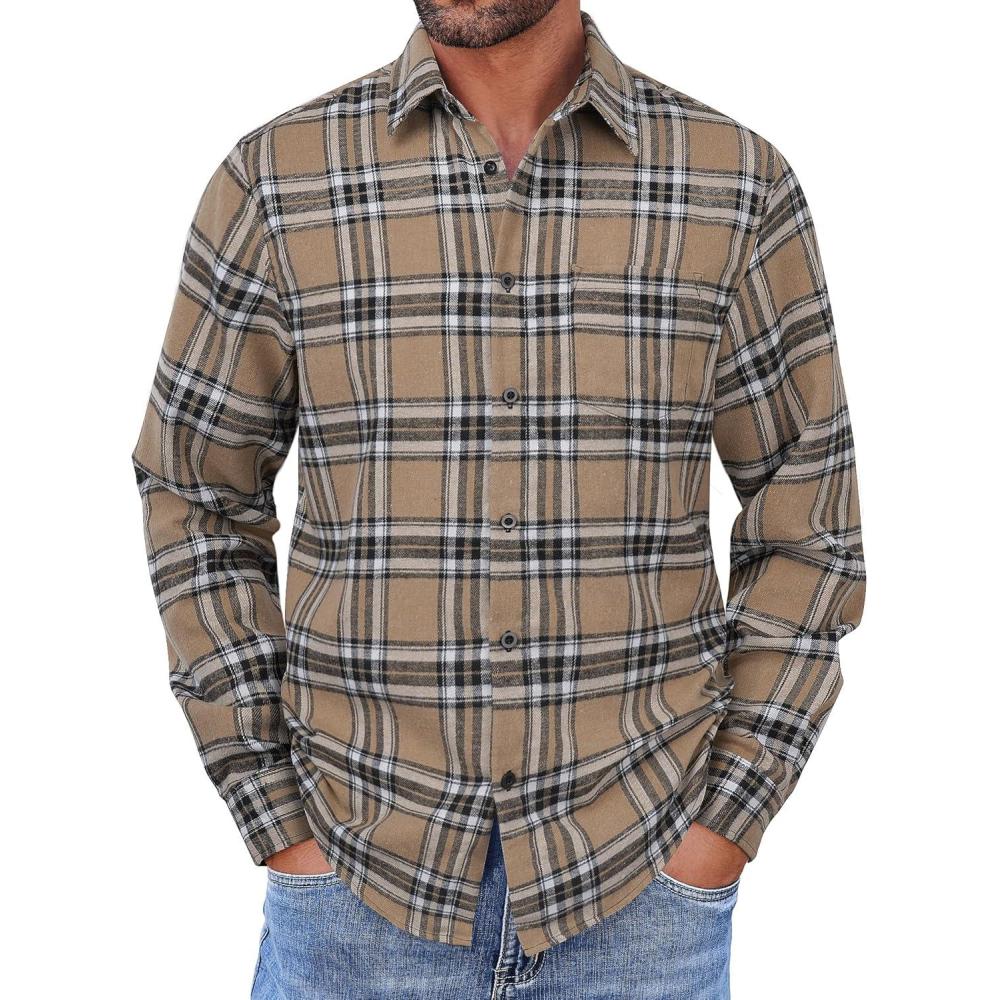 COOFANDY Mens Flannel Shirts Long Sleeve Button Down Shirt with Pocket Casual Shirts Work Shirts for Men(Khaki Plaid)