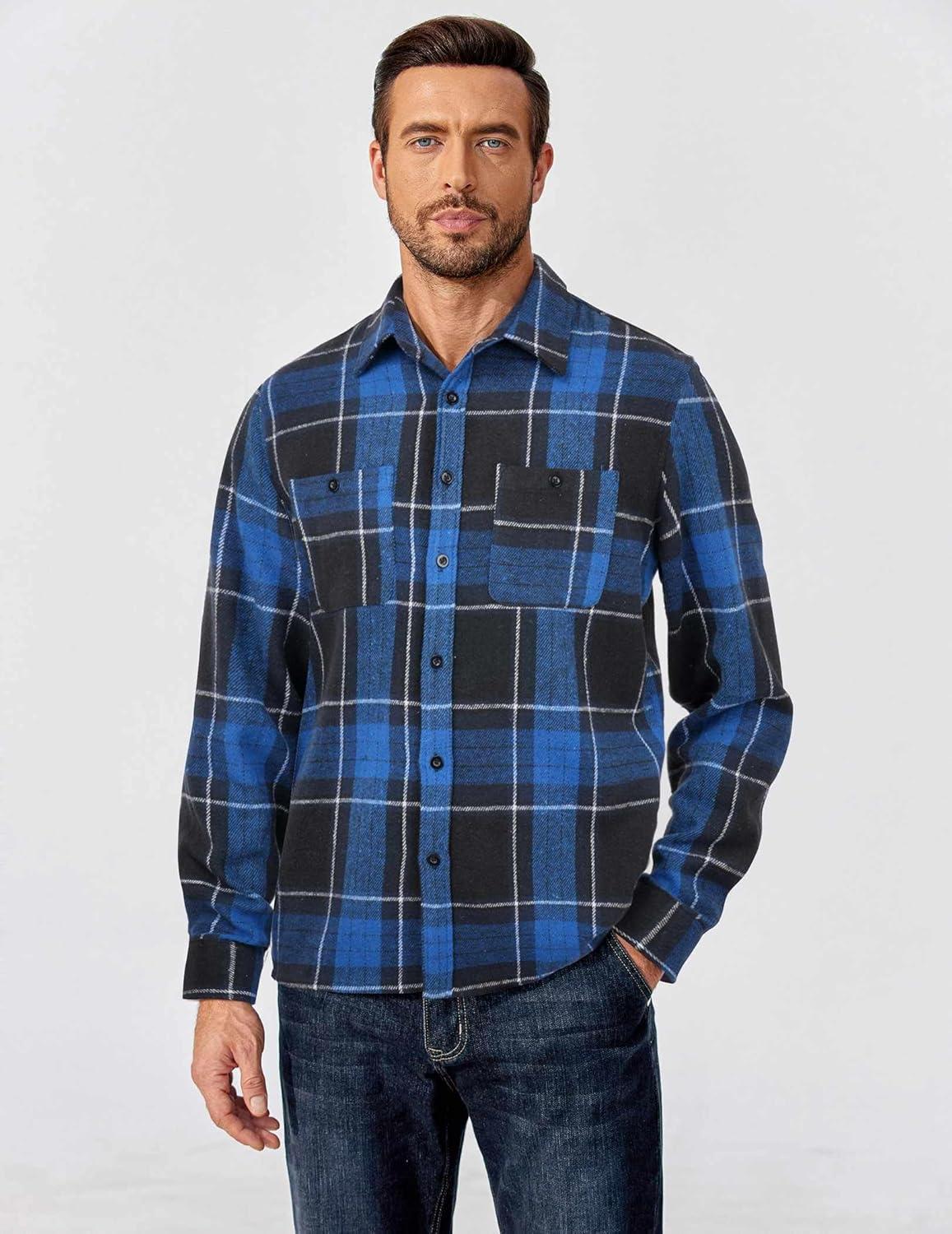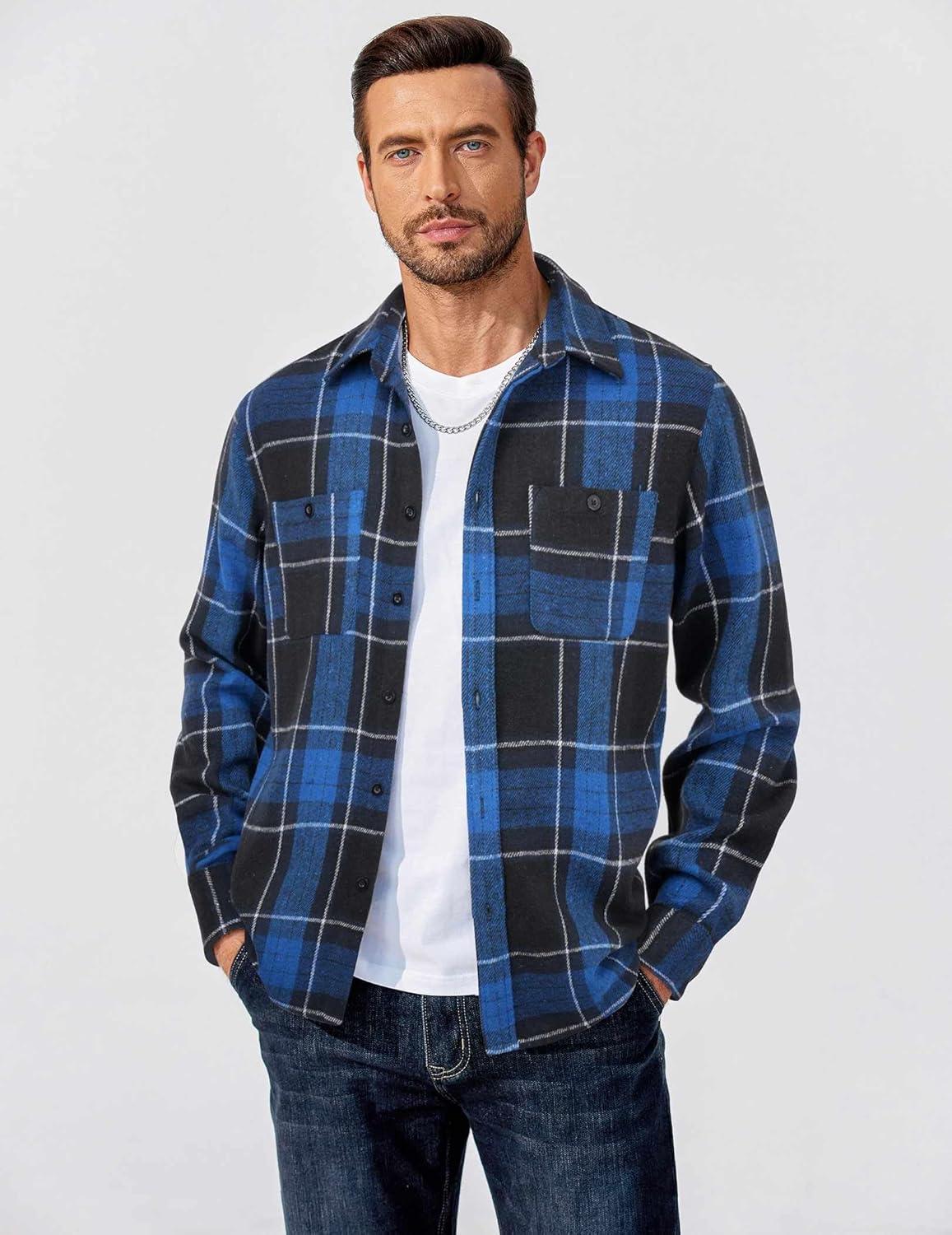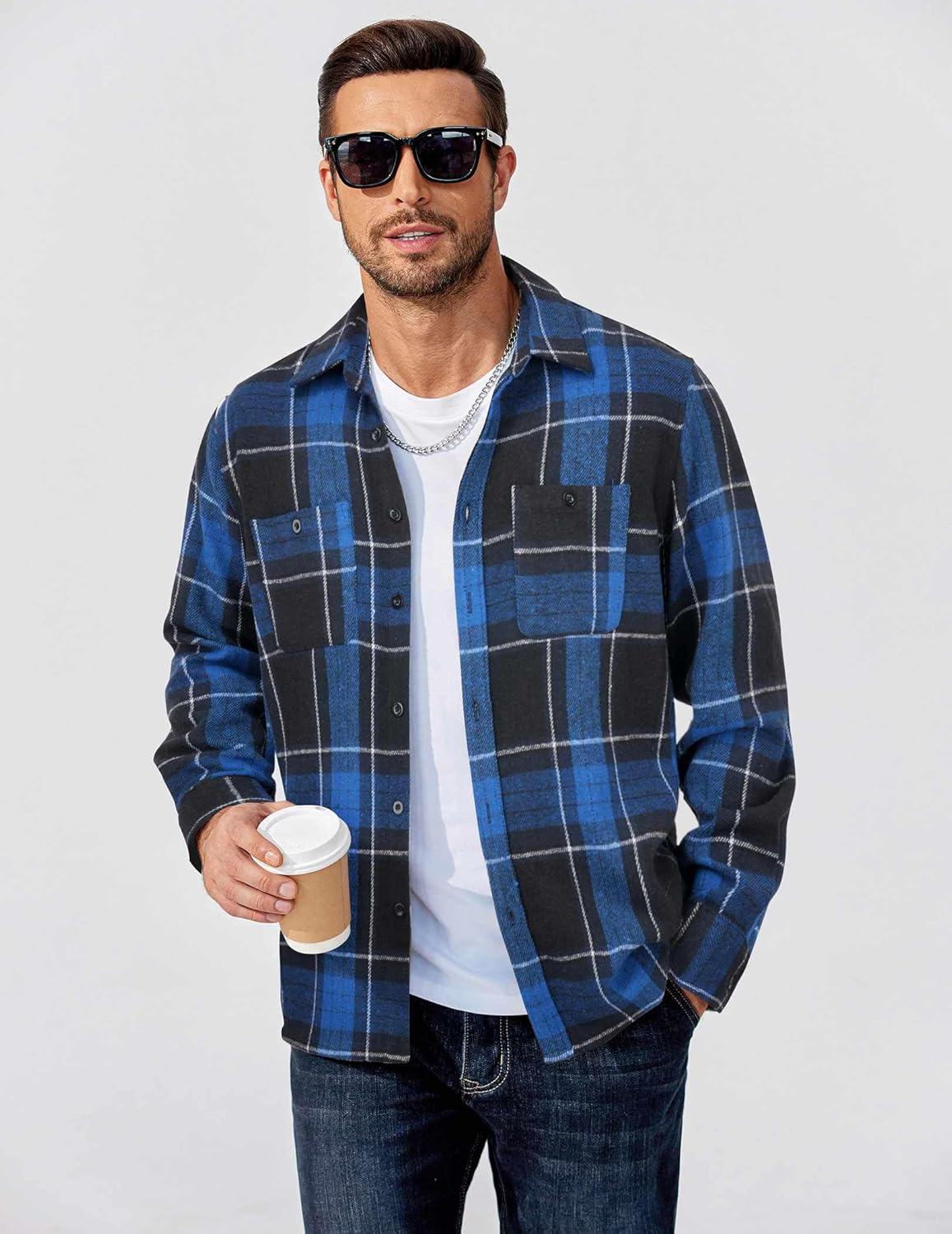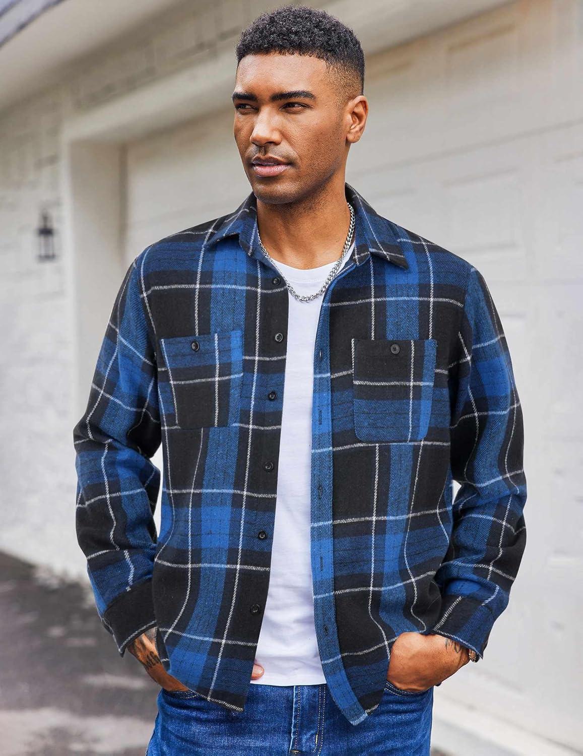 COOFANDY Men’s Flannel Shirts Long Sleeve Casual Cotton Plaid Button Down Shirt Jacket with Pockets(Black-blue Plaid)