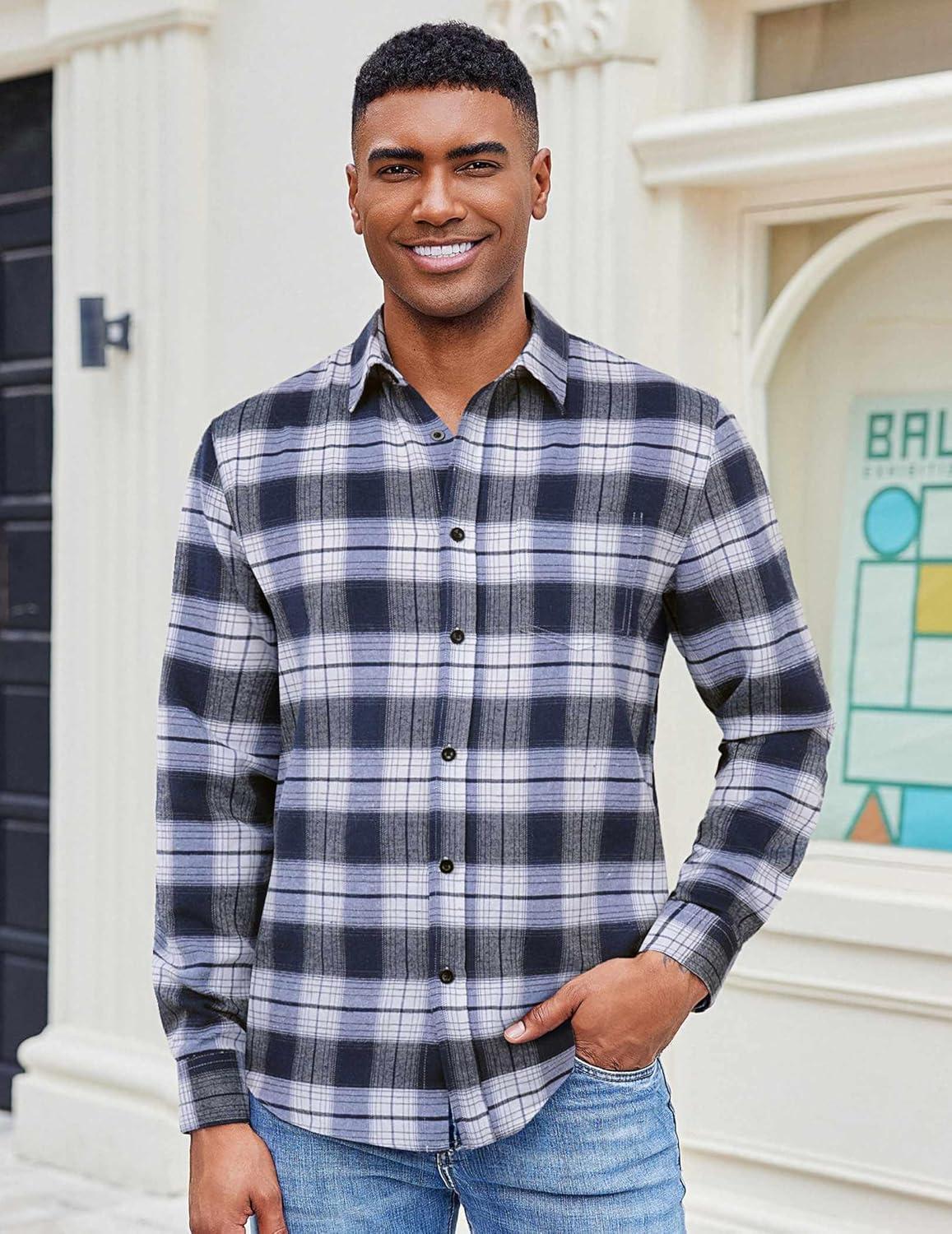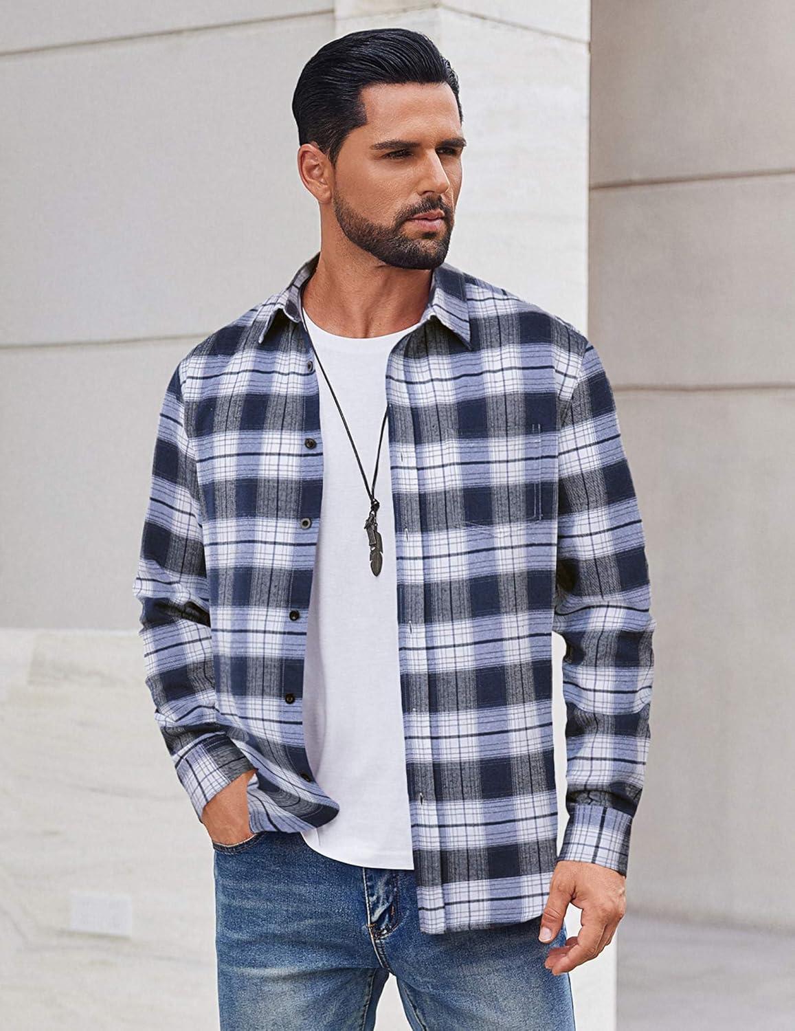 COOFANDY Mens Flannel Shirts Long Sleeve Casual Plaid Shirt for Men Button Up Shirt Jackets with Pocket(Plaid – Navy White)