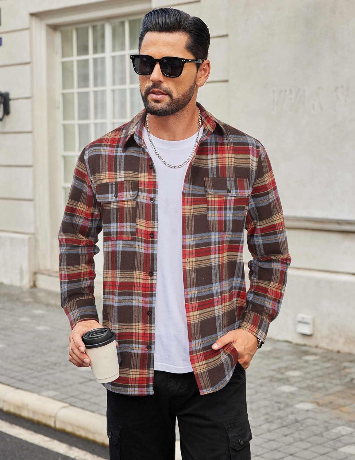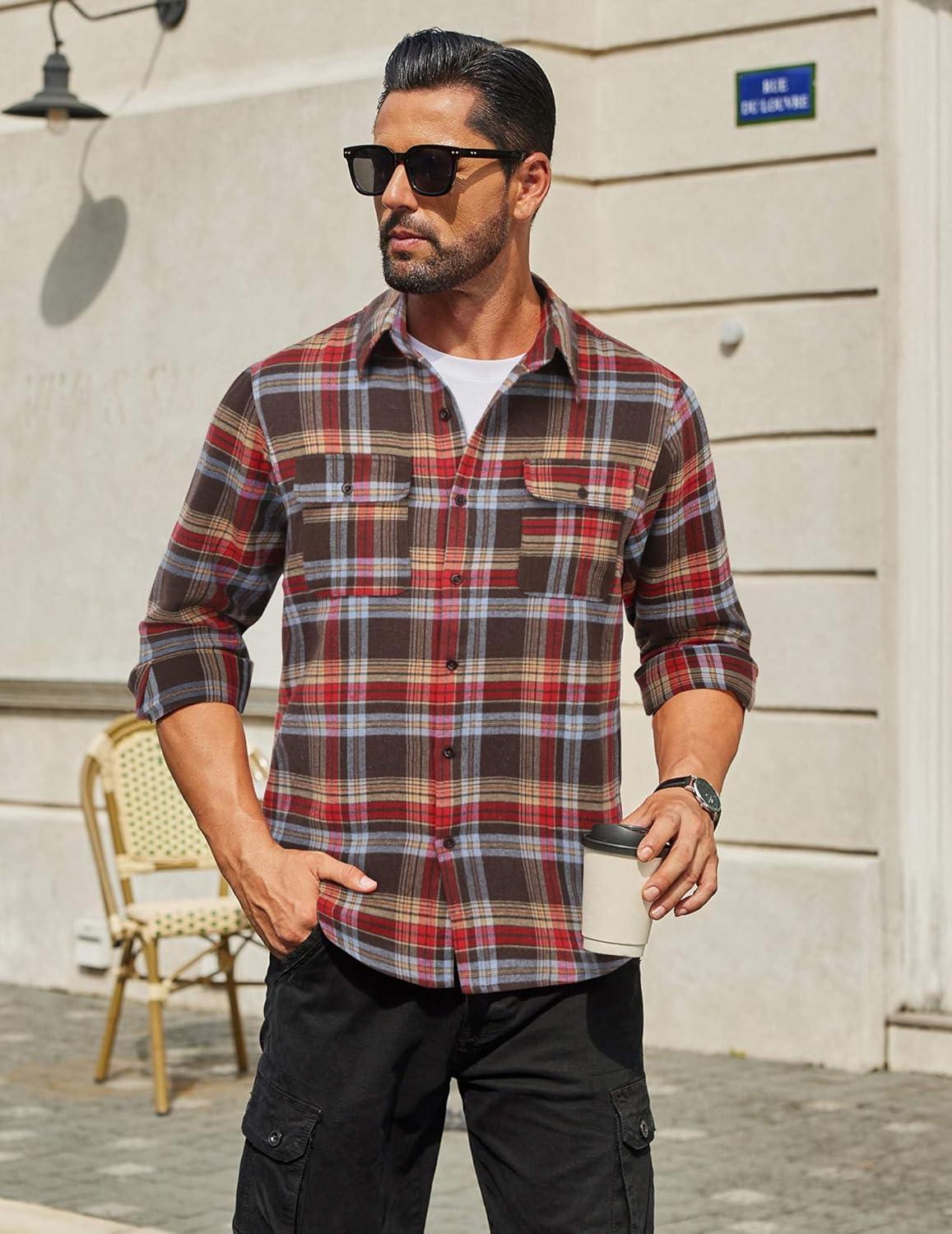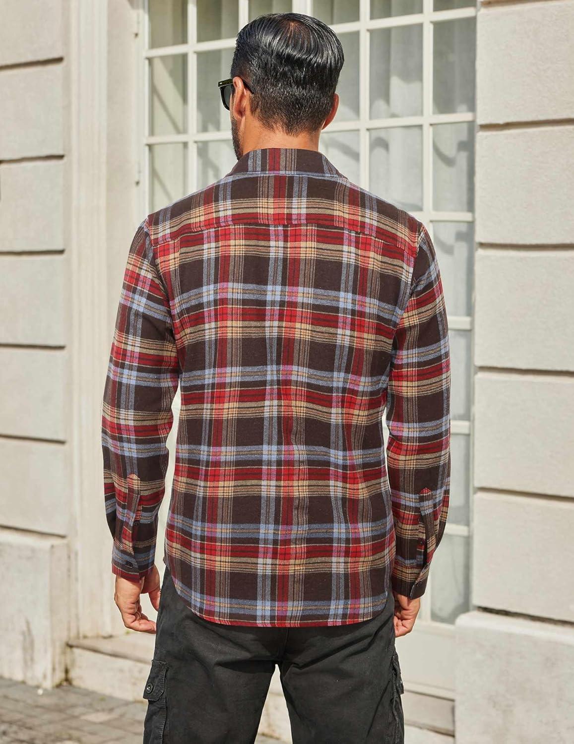 COOFANDY Mens Flannel Shirts Long Sleeve Plaid Button Down Shirt Cotton Casual Work Shirts with Pockets(Brown Red)