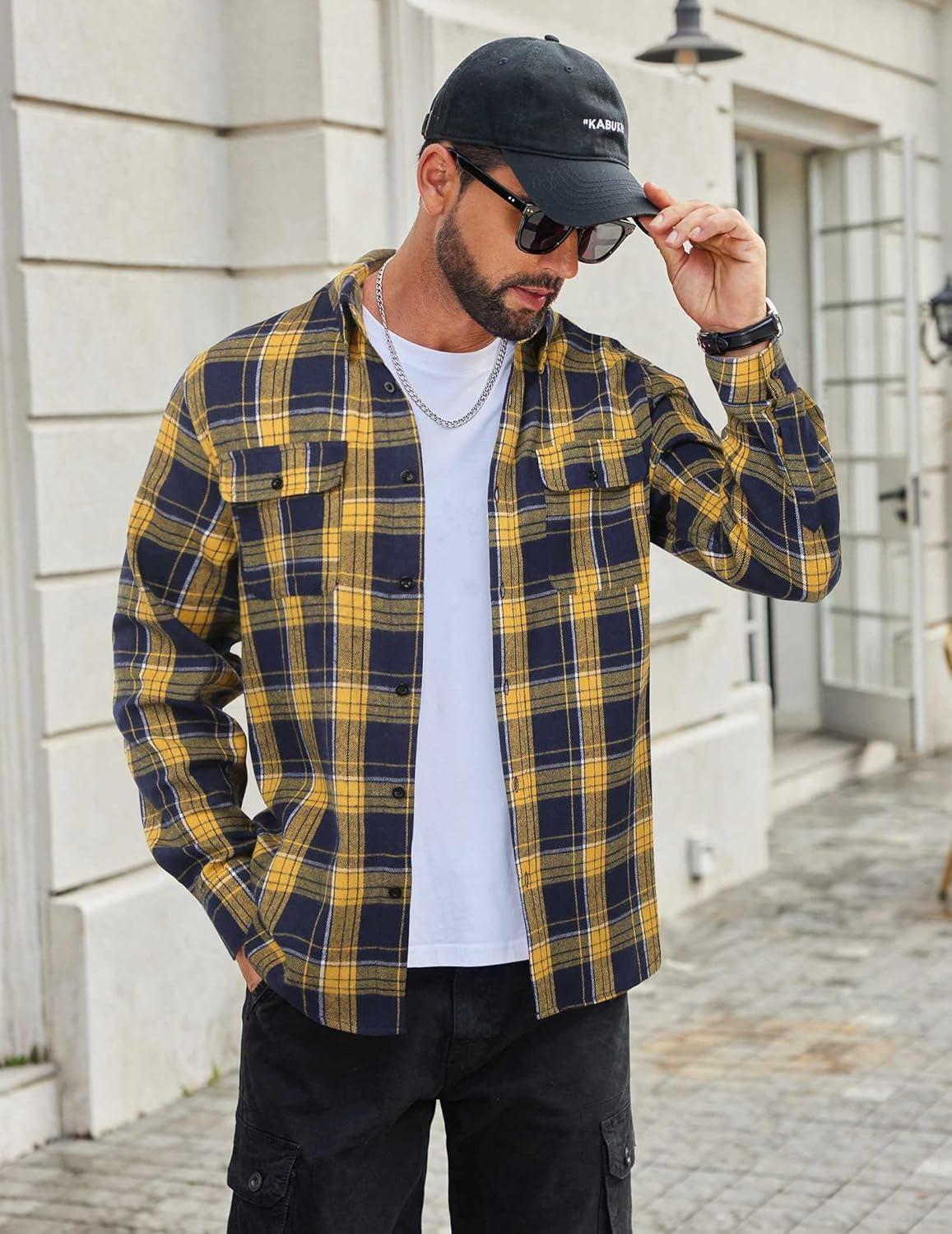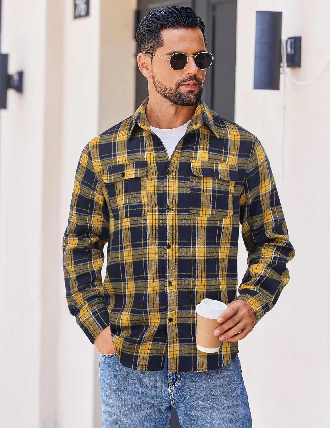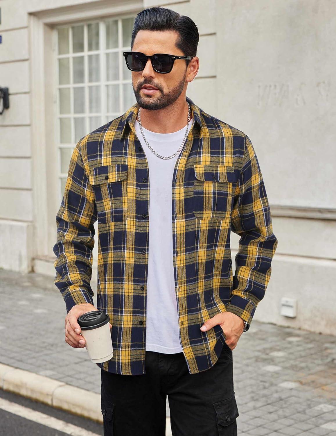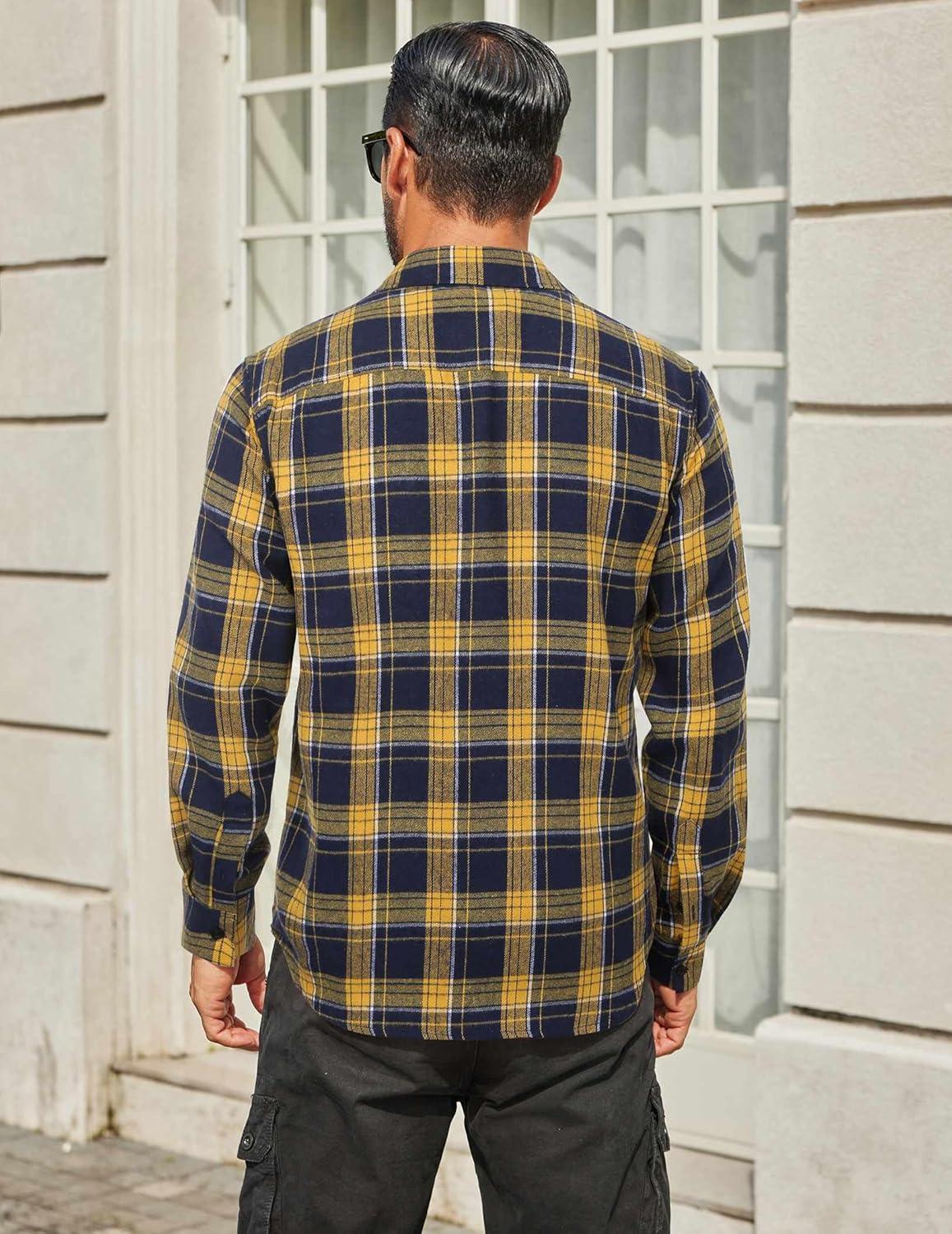 COOFANDY Mens Flannel Shirts Long Sleeve Plaid Button Down Shirt Cotton Casual Work Shirts with Pockets(Yellow Navy)