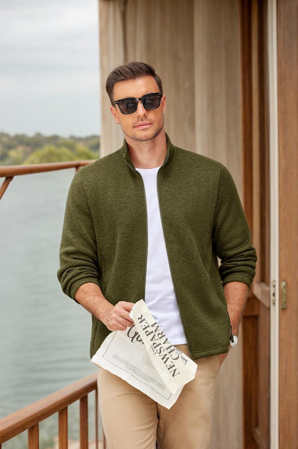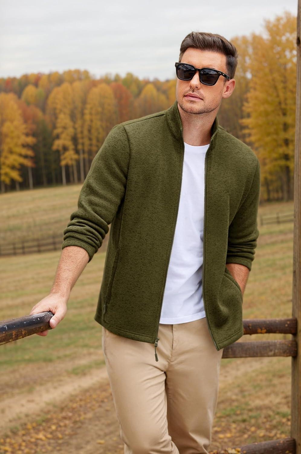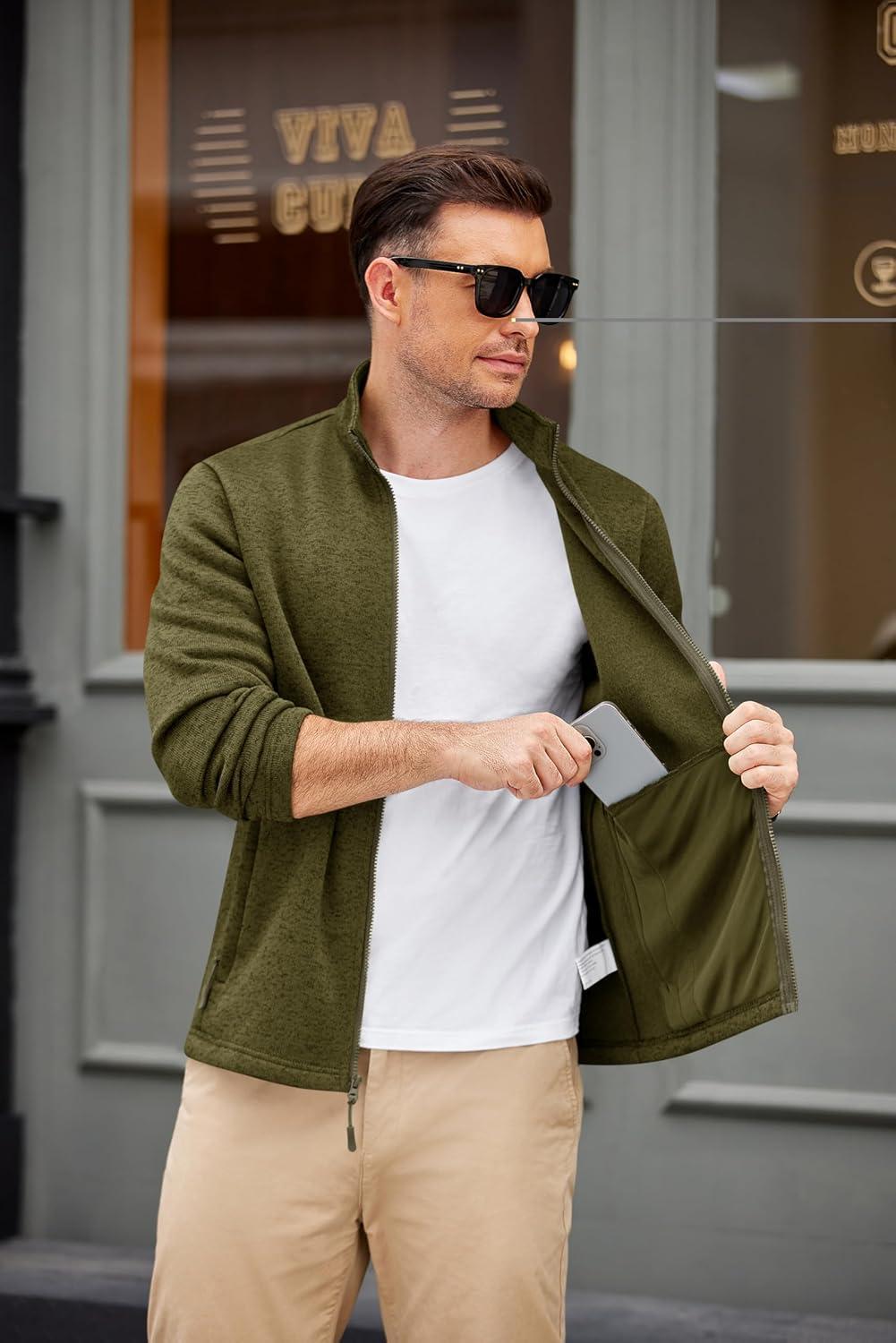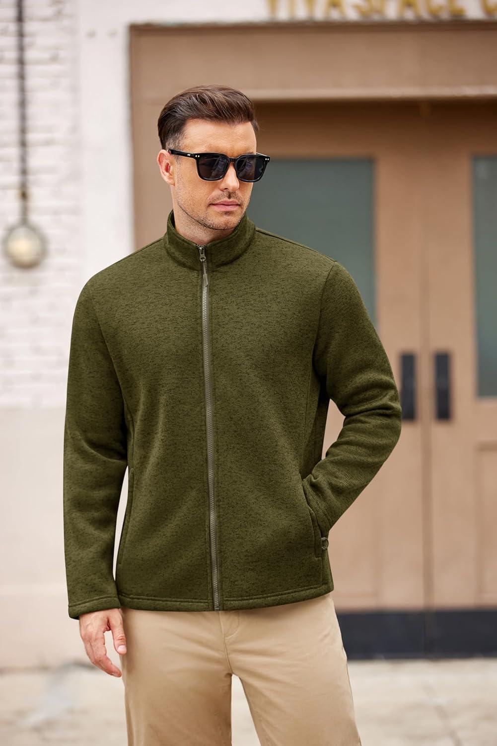 COOFANDY Mens Fleece Jacket Zip Up Lightweight Sweater Jackets Casual Warm with Pockets for Home Office Hiking(Army Green)
