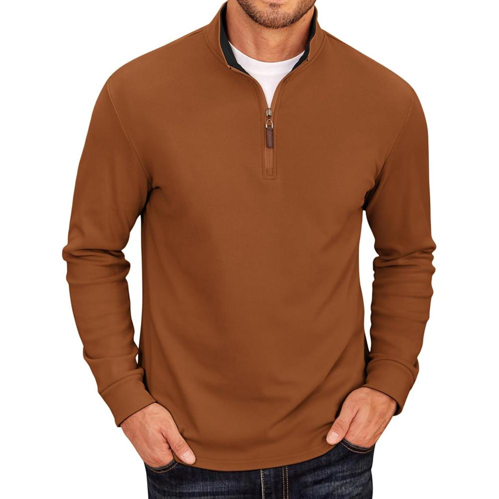 COOFANDY Men’s Fleece Quarter Zip Pullover Long Sleeve Mock Neck Sweatshirt(Light Brown)