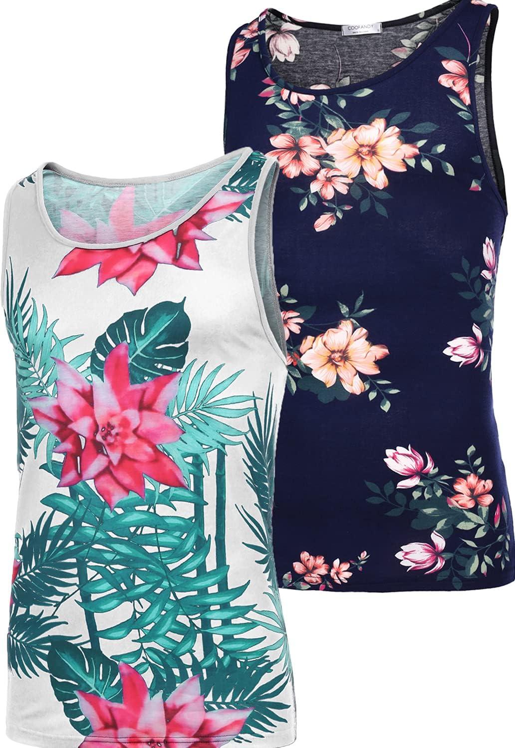 COOFANDY Men’s Floral Tank Top Sleeveless Tees All Over Print Casual Sport T-Shirts Hawaii Beach Vacation(2 Pack-black(b)/White)