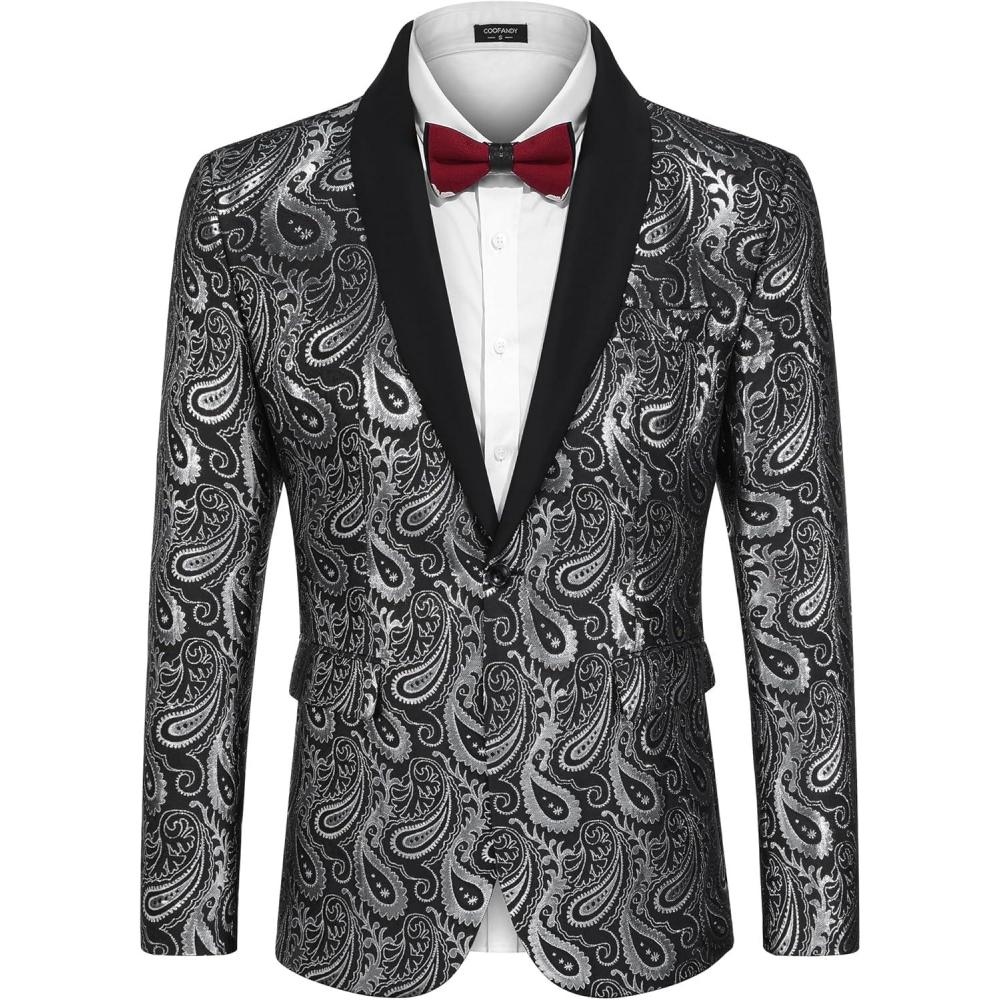 COOFANDY Mens Floral Tuxedo Jacket Paisley Shawl Lapel Suit Blazer Jacket for Dinner,Prom,Wedding(Blacksilver)