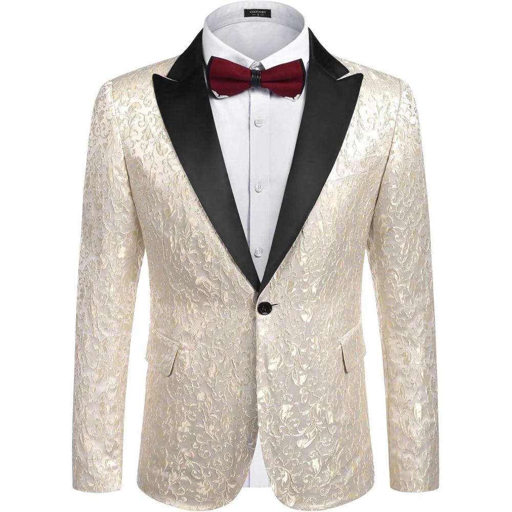 COOFANDY Mens Floral Tuxedo One Button Luxury Shiny Blazer Dinner Party Prom Wedding Suit Jacket(1 – Beige White)