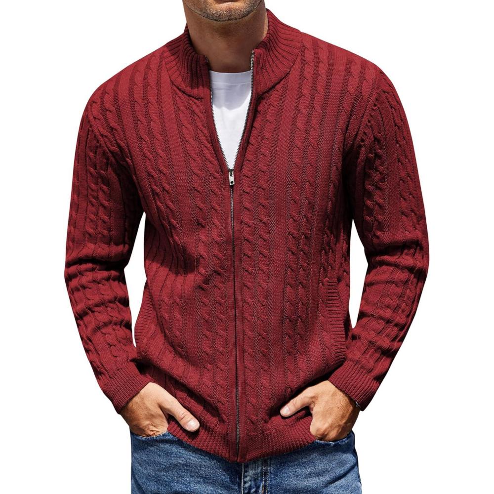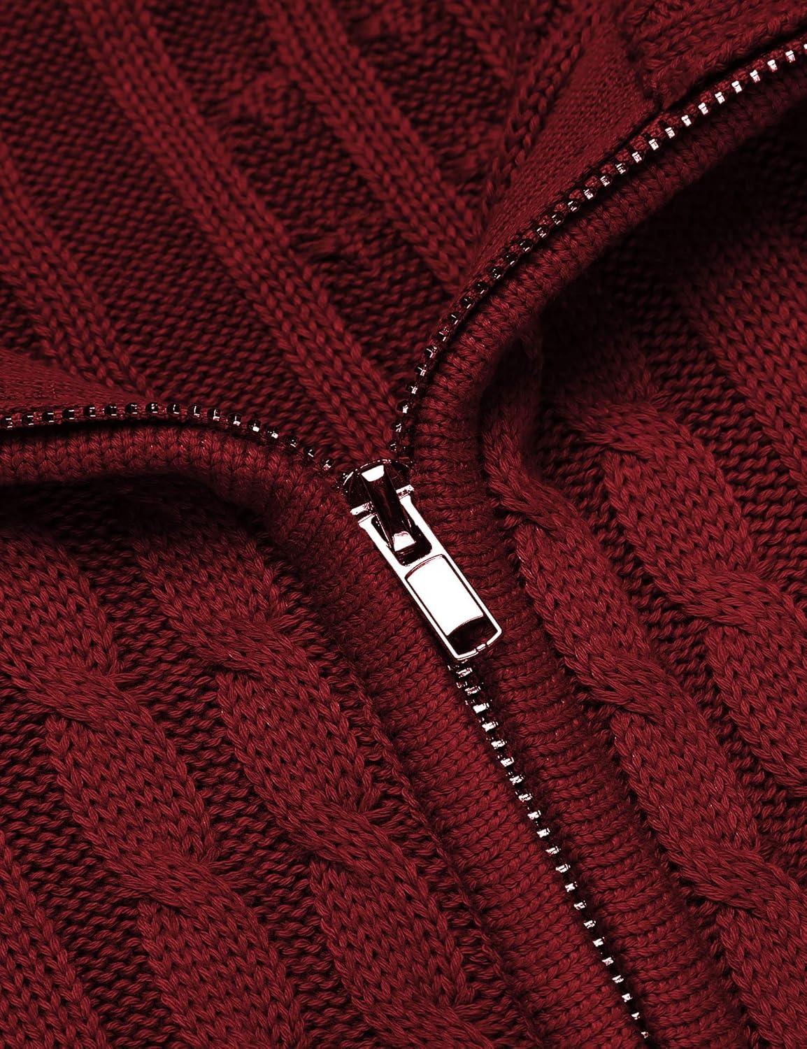 COOFANDY Men’s Full Zip Cardigan Sweater Slim Fit Cable Knitted Zip Up Sweater with Pockets(Wine Red)