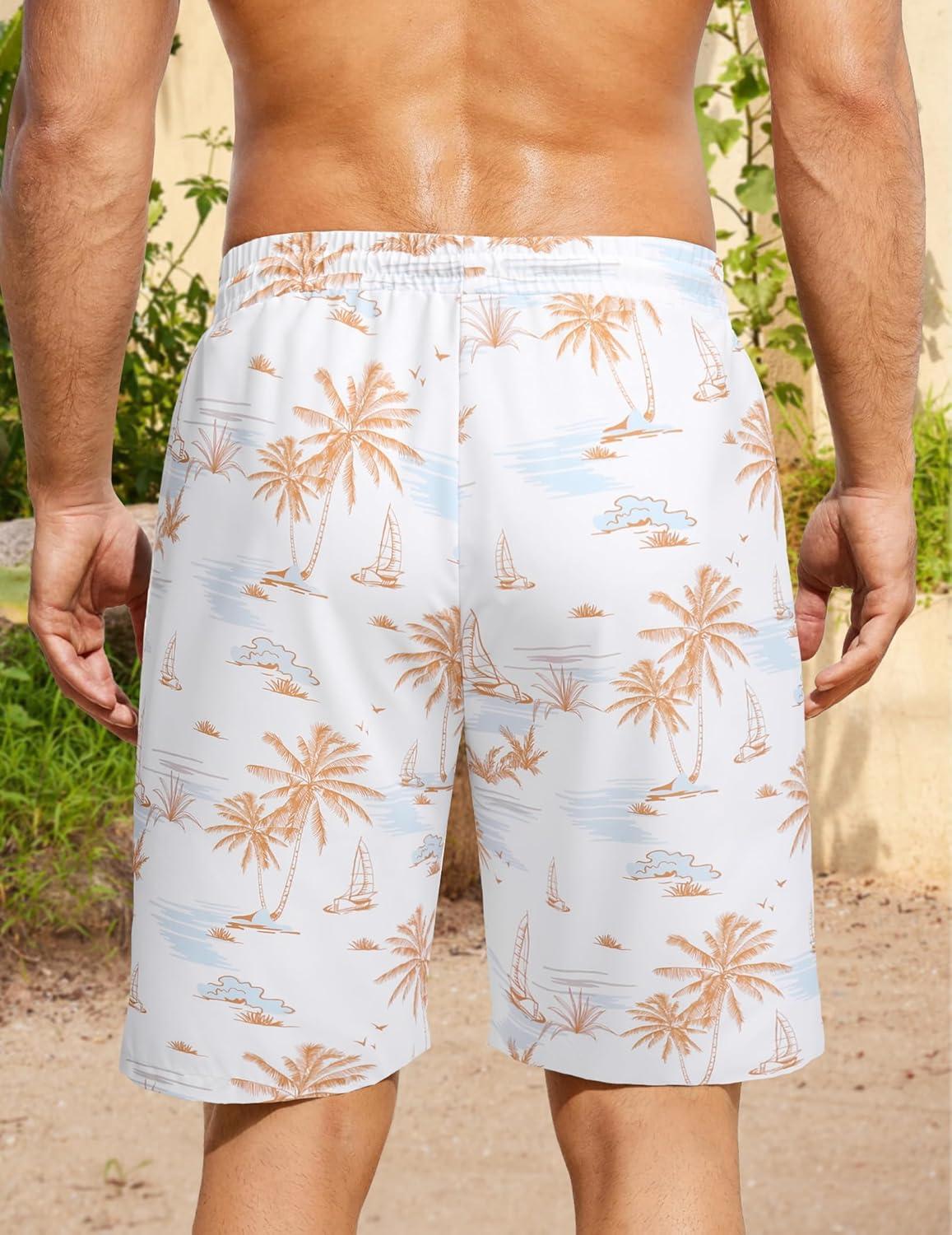 COOFANDY Men’s Hawaiian Beach Shorts Elastic Waist Drawstring Lightweight Summer Casual Shorts with Pocket(White-island)