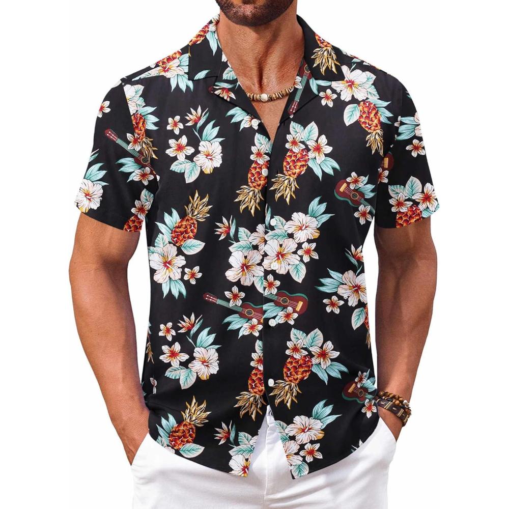 COOFANDY Men’s Hawaiian Floral Shirts Short Sleeve Button Down Shirts Tropical Summer Beach Shirts(Floral Pineapple-black)