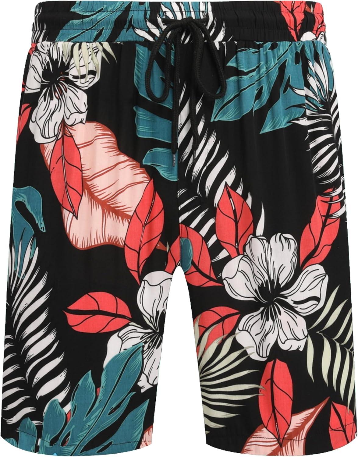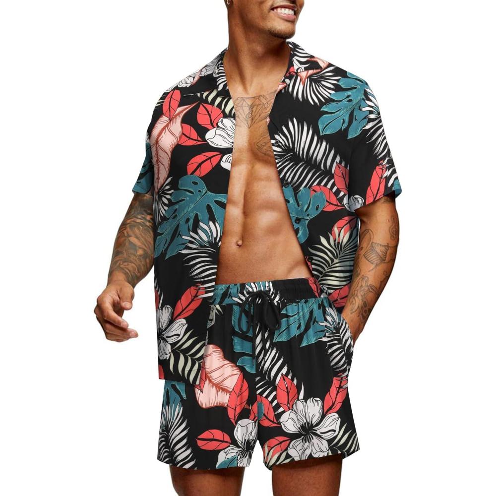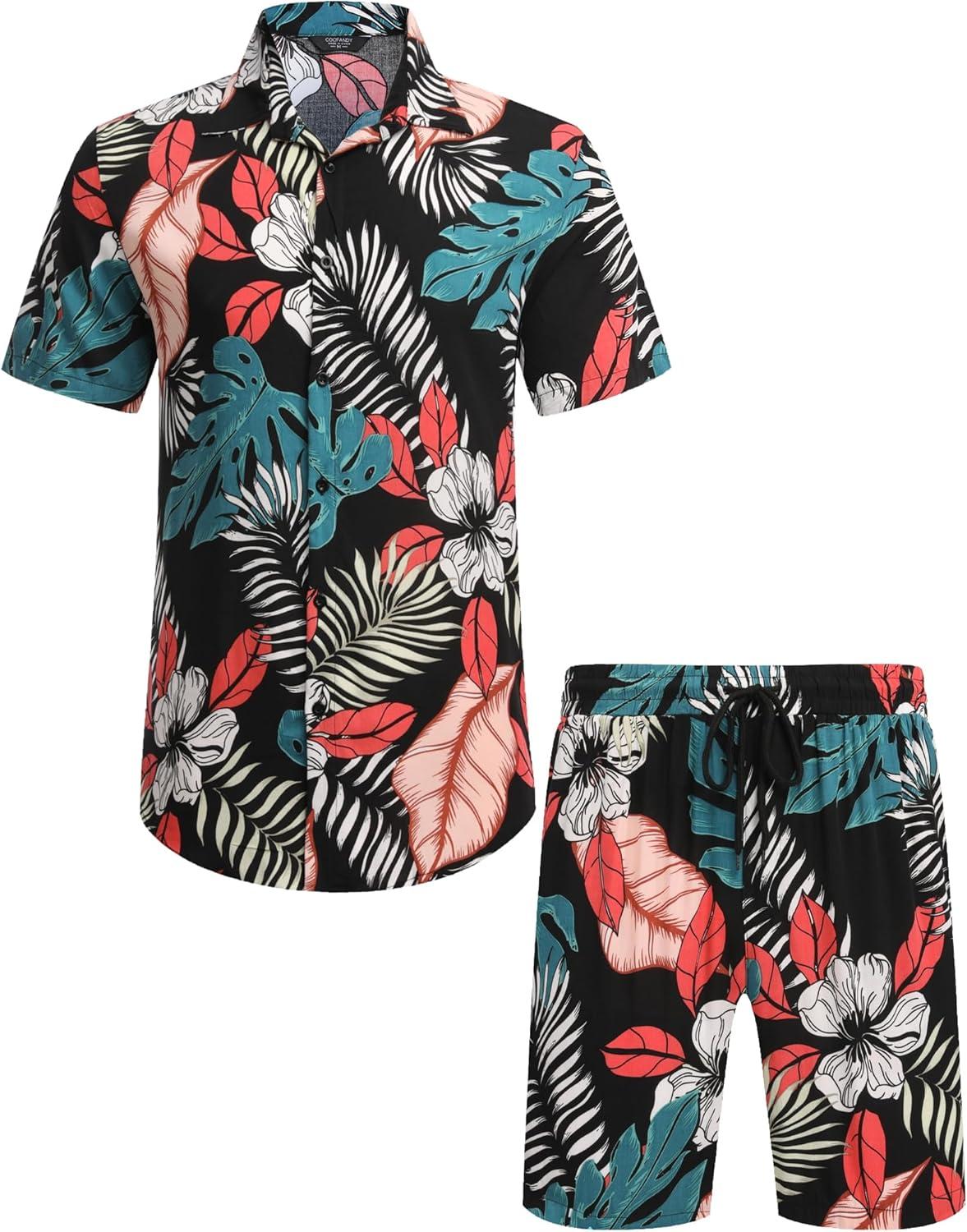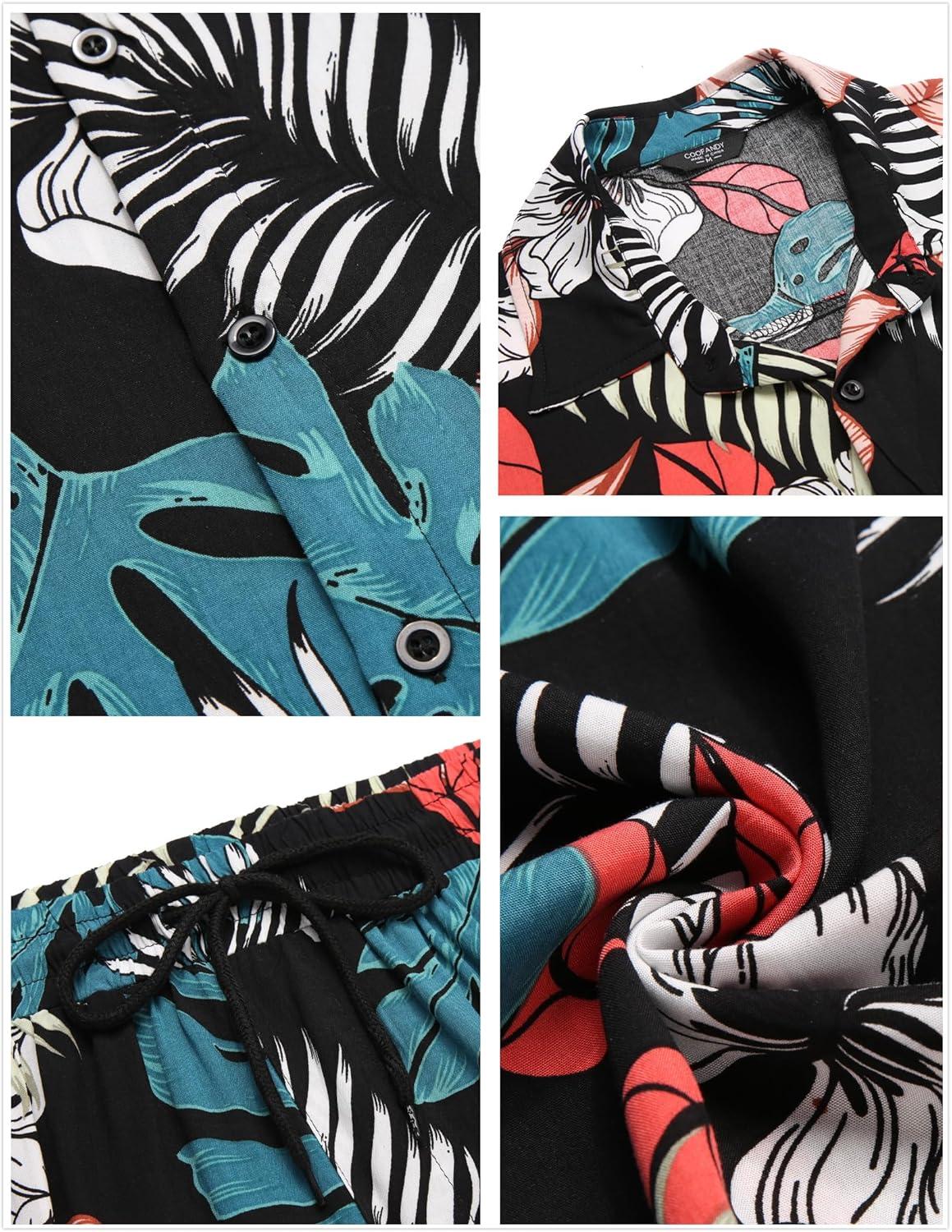 COOFANDY Men’s Hawaiian Matching Set Summer Beach 2 Piece Outfits Flower Button Down Shirts and Shorts Vacation Outfits(Classic Black Leaf)