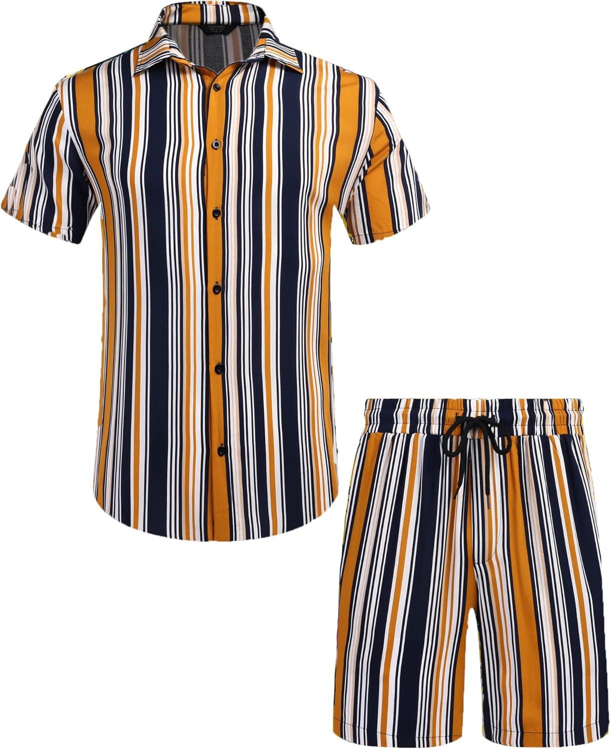 COOFANDY Men’s Hawaiian Matching Set Summer Beach 2 Piece Outfits Flower Button Down Shirts and Shorts Vacation Outfits(Dark Yellow Stripes)
