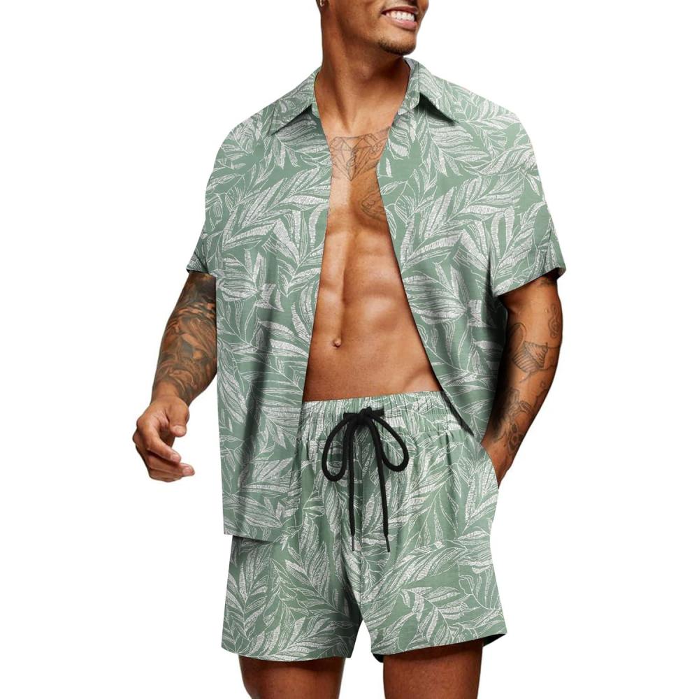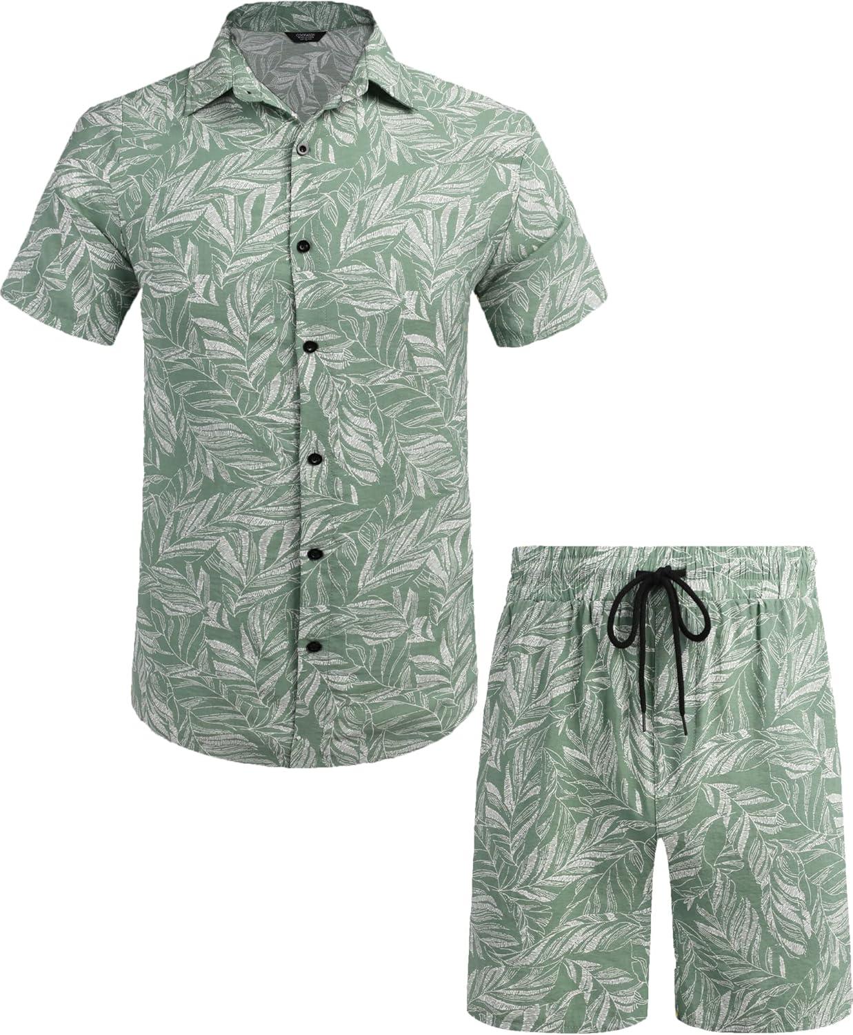COOFANDY Men’s Hawaiian Matching Set Summer Beach 2 Piece Outfits Flower Button Down Shirts and Shorts Vacation Outfits(Green Leaves)