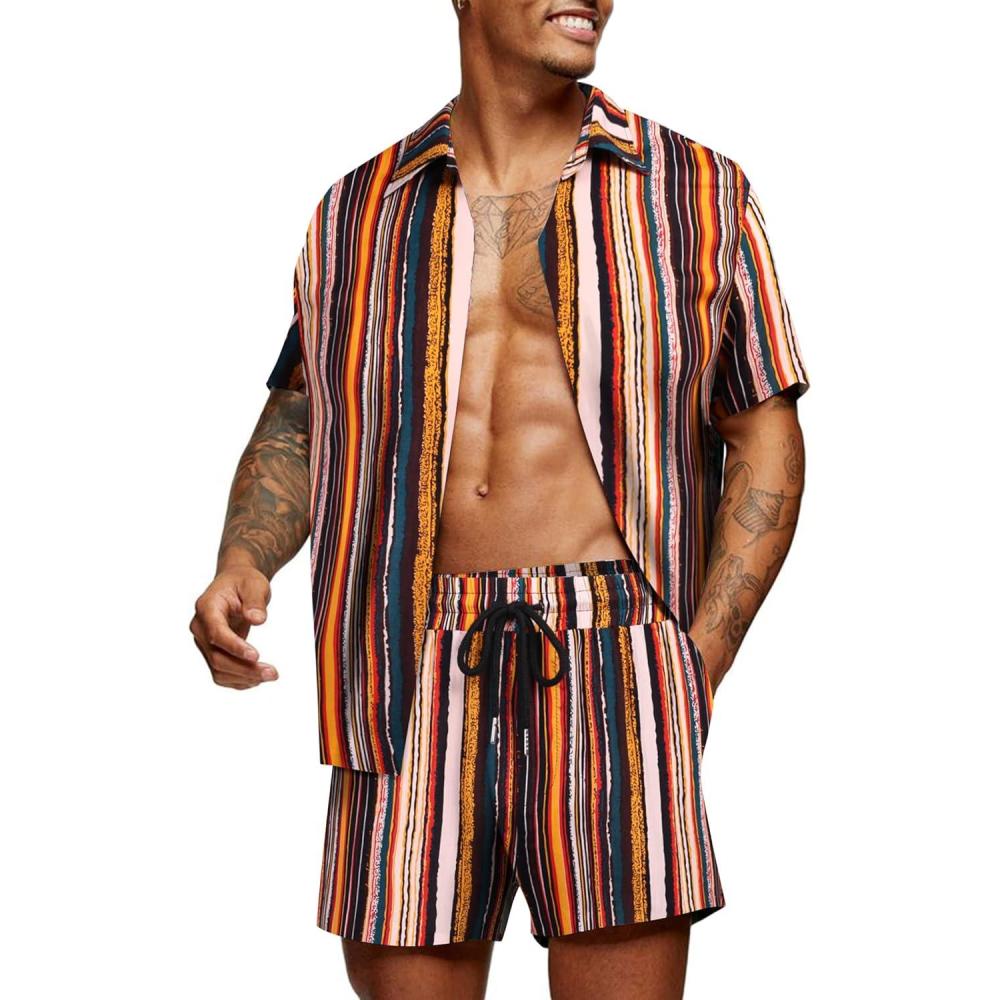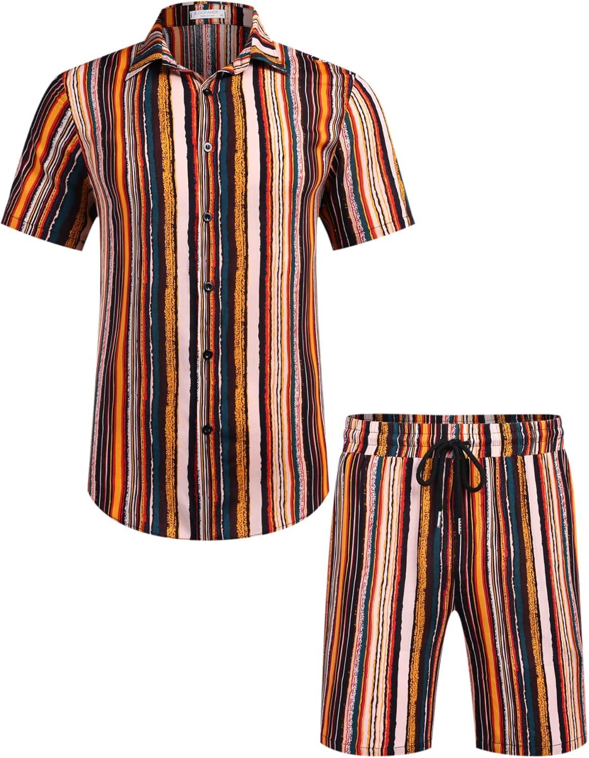 COOFANDY Men’s Hawaiian Matching Set Summer Beach 2 Piece Outfits Flower Button Down Shirts and Shorts Vacation Outfits(Multicolor Stripes)