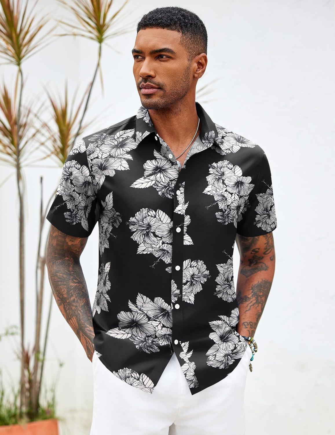 COOFANDY Mens Hawaiian Shirt Short Sleeve Button Down Shirts Tropical Floral Summer Beach Shirts(Black- White Flower)