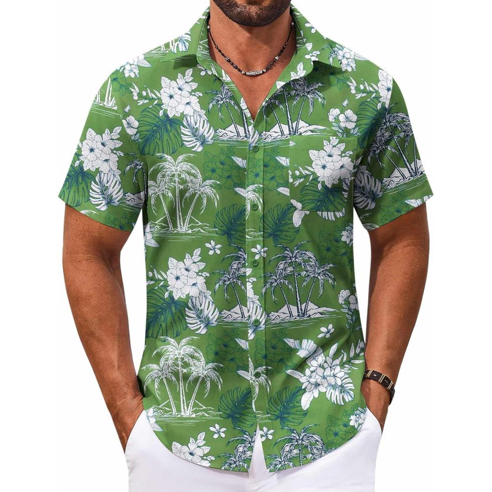 COOFANDY Mens Hawaiian Shirt Short Sleeve Button Down Shirts Tropical Floral Summer Beach Shirts(Green-white Flowers)