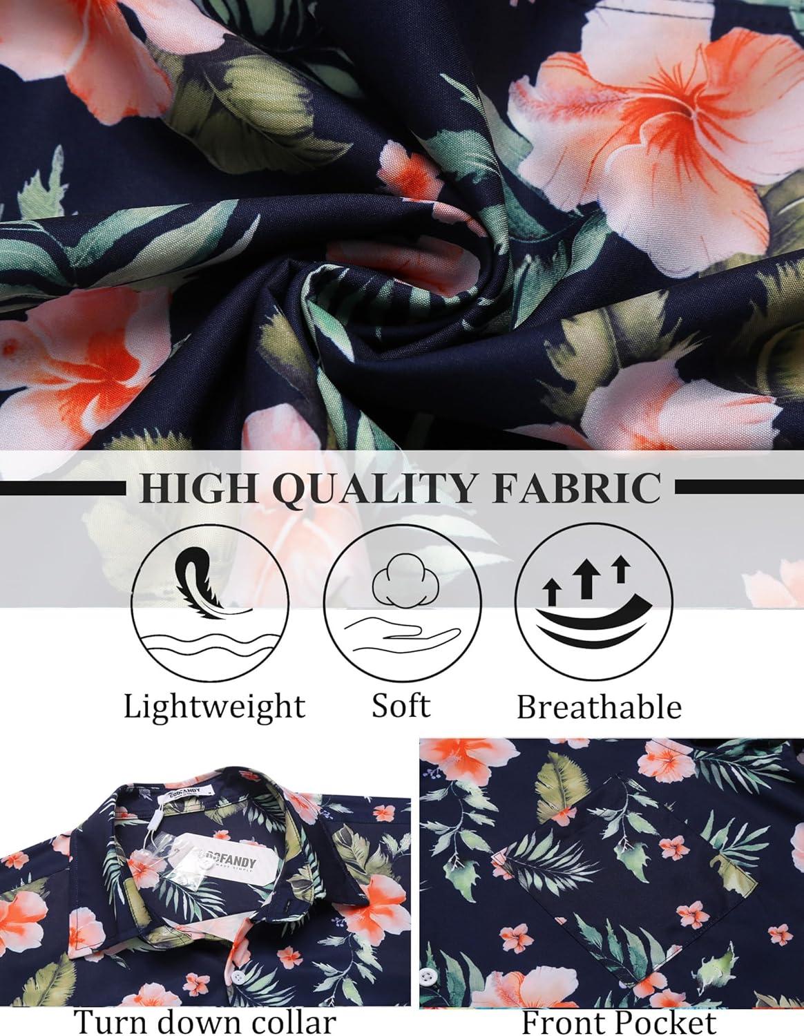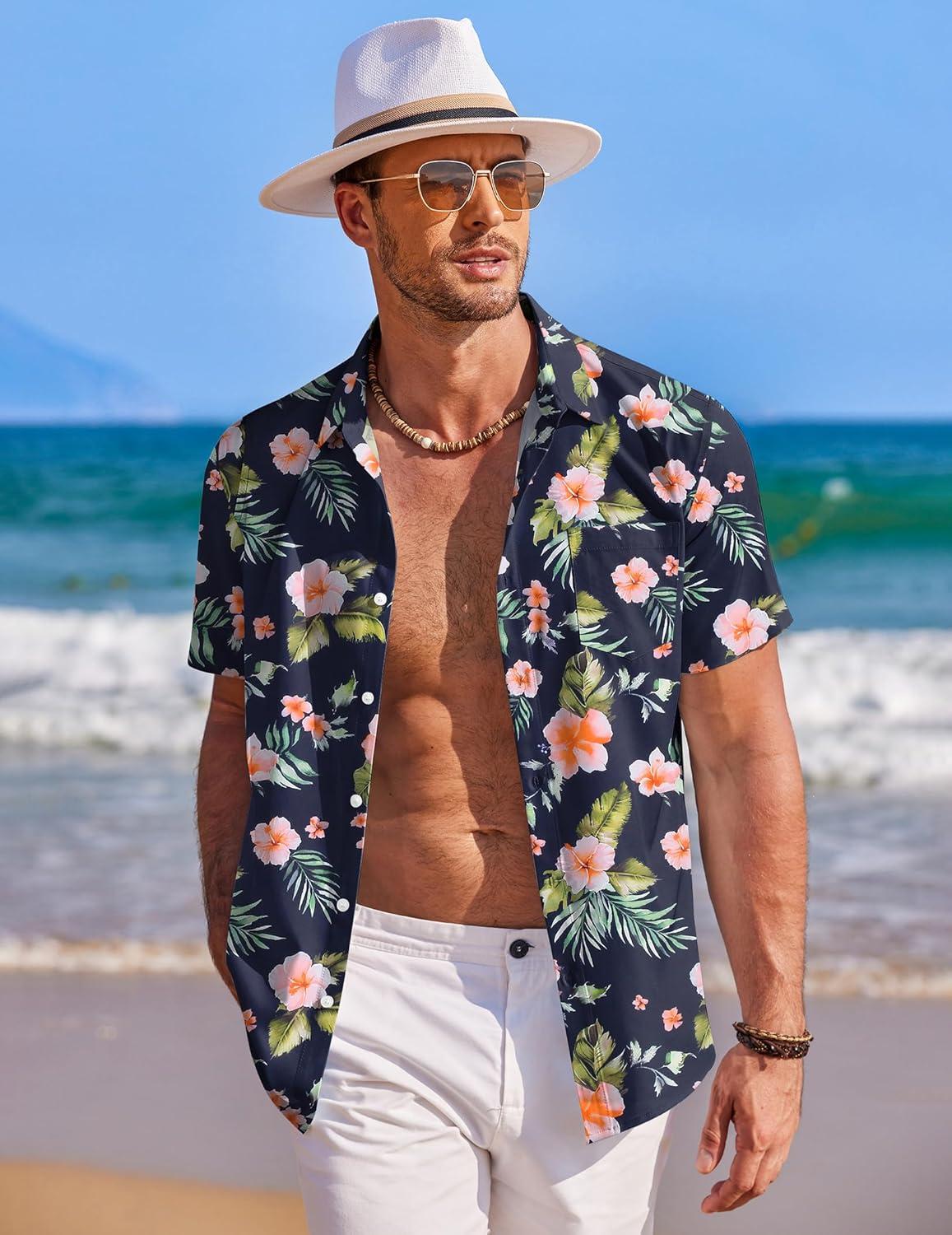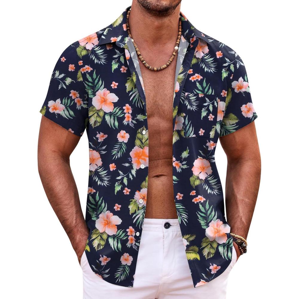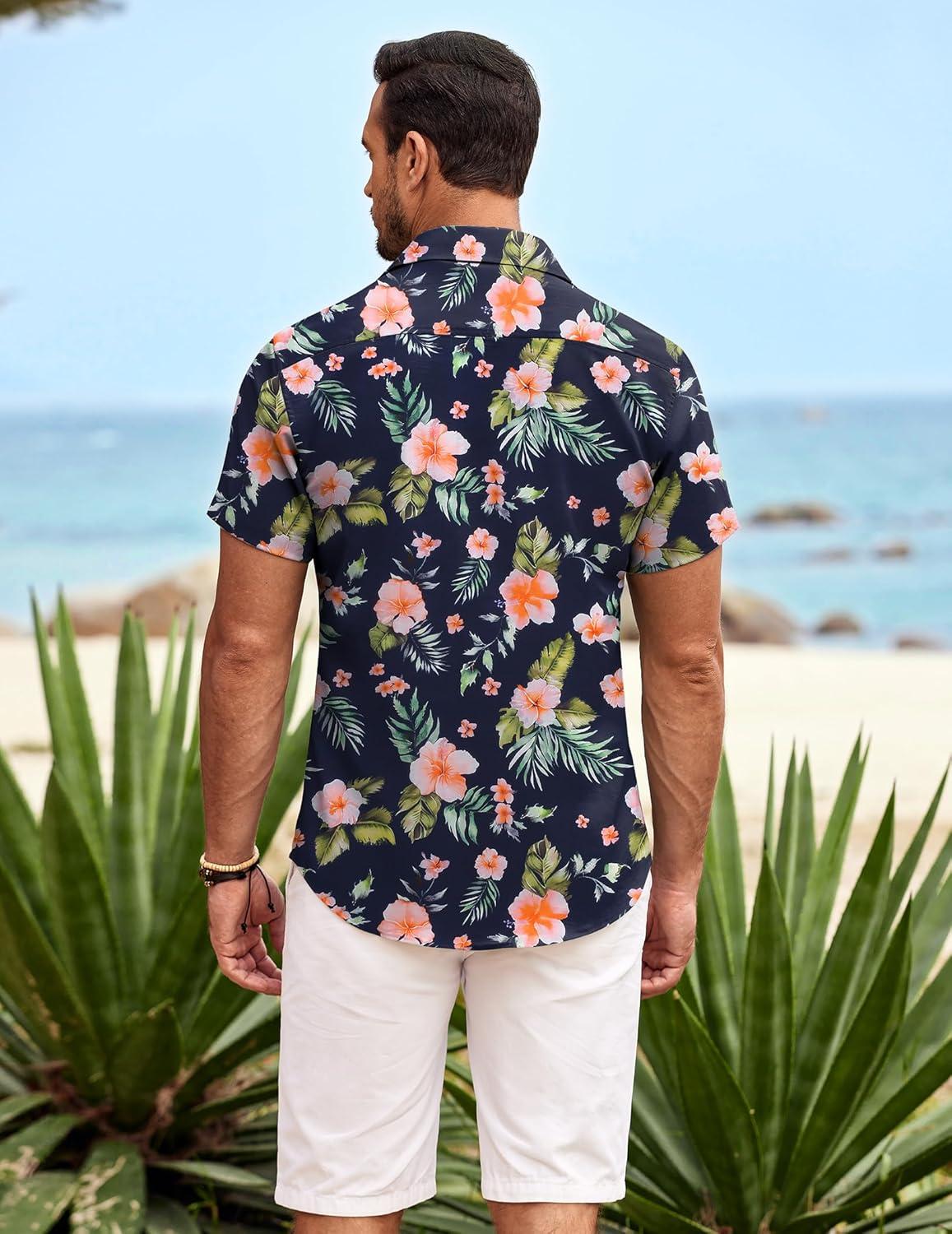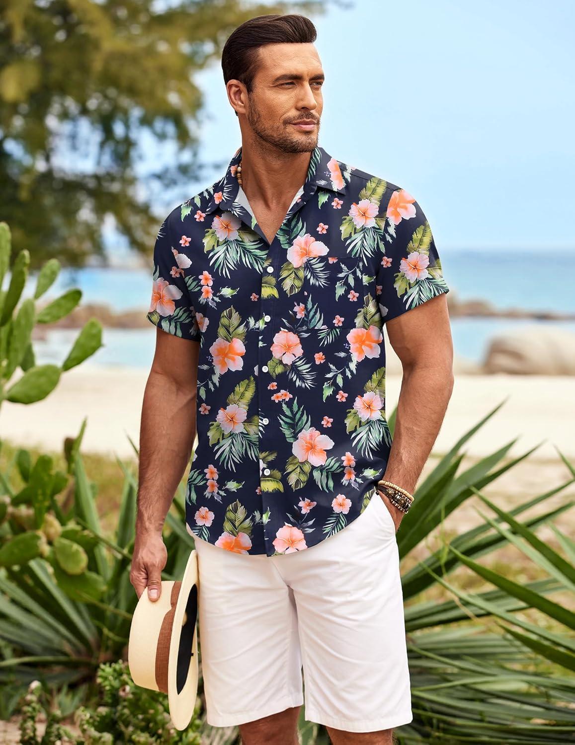 COOFANDY Mens Hawaiian Shirt Short Sleeve Button Down Shirts Tropical Summer Beach Shirts Casual Floral Aloha Shirts(Navy-pink Flower)