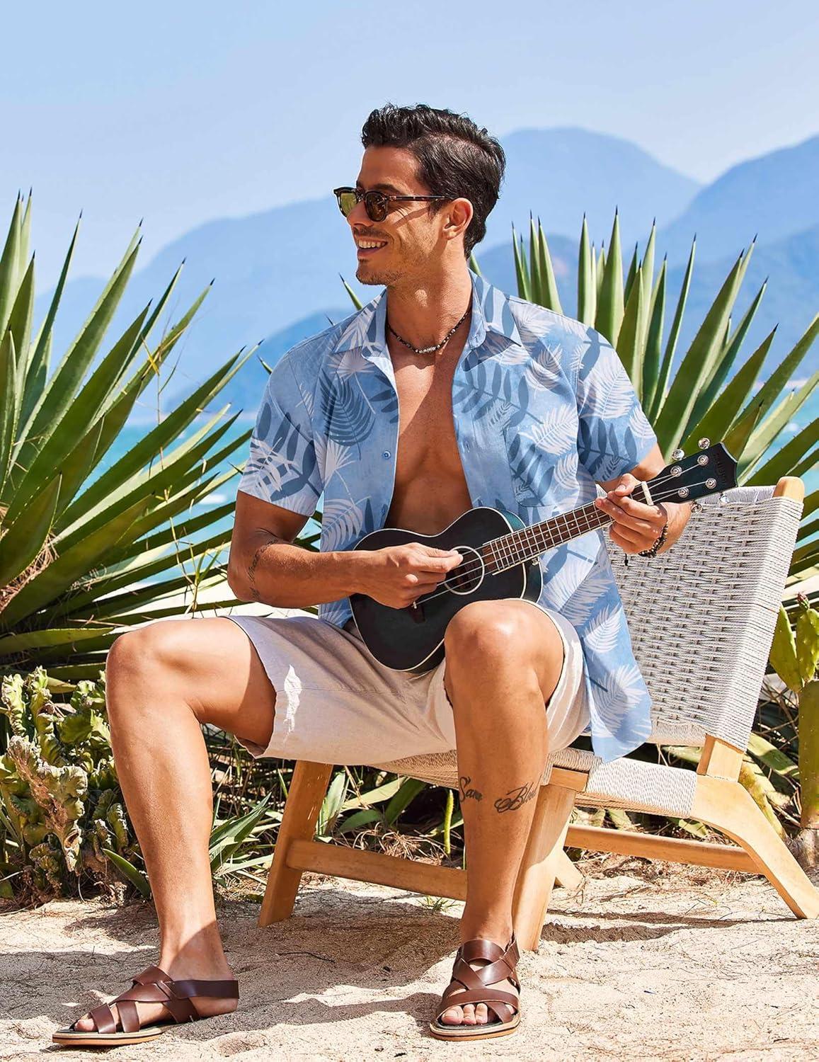 COOFANDY Men’s Hawaiian Shirt Short Sleeve Casual Button Down Tropical Summer Beach Aloha Shirts(Blue-white Leaves)