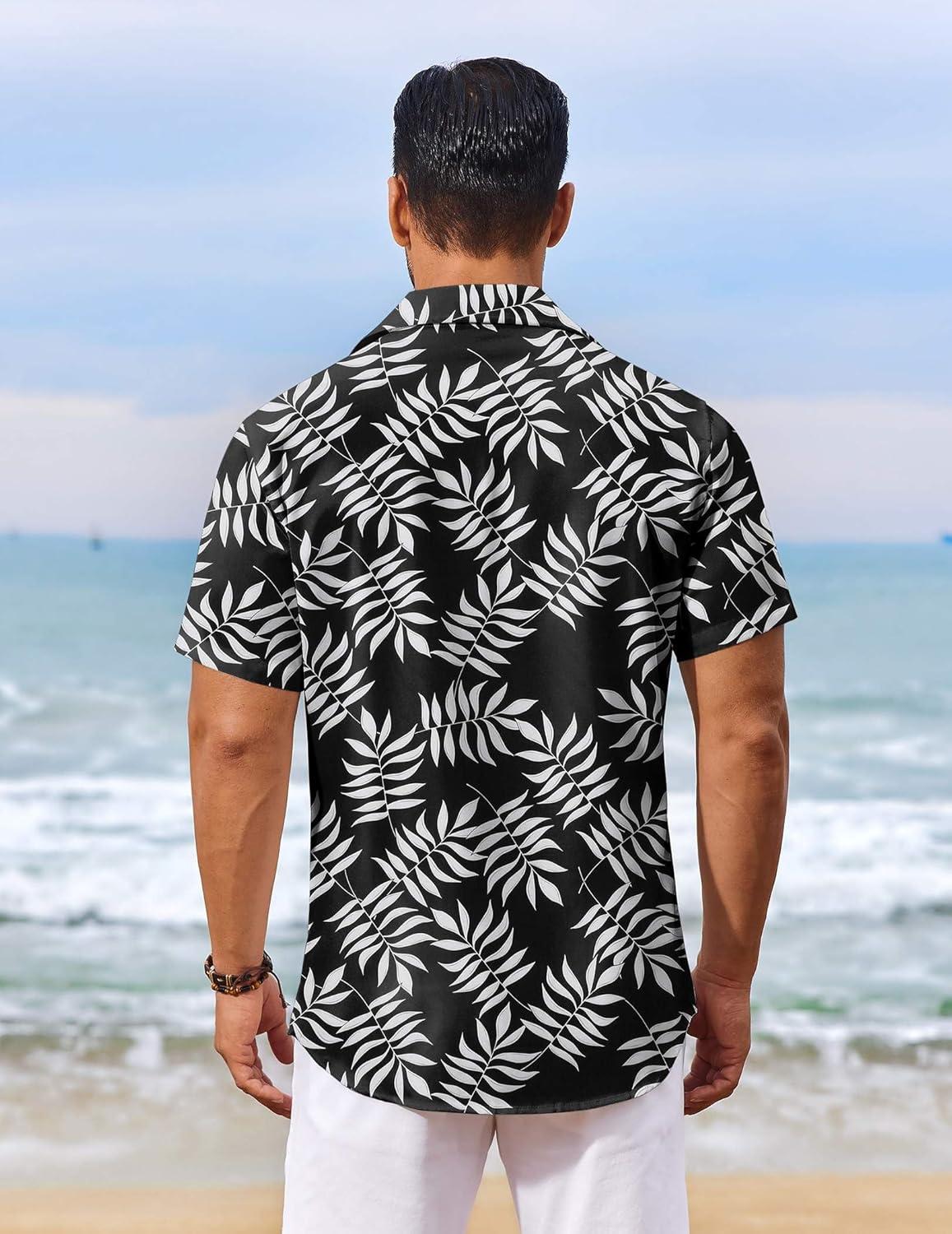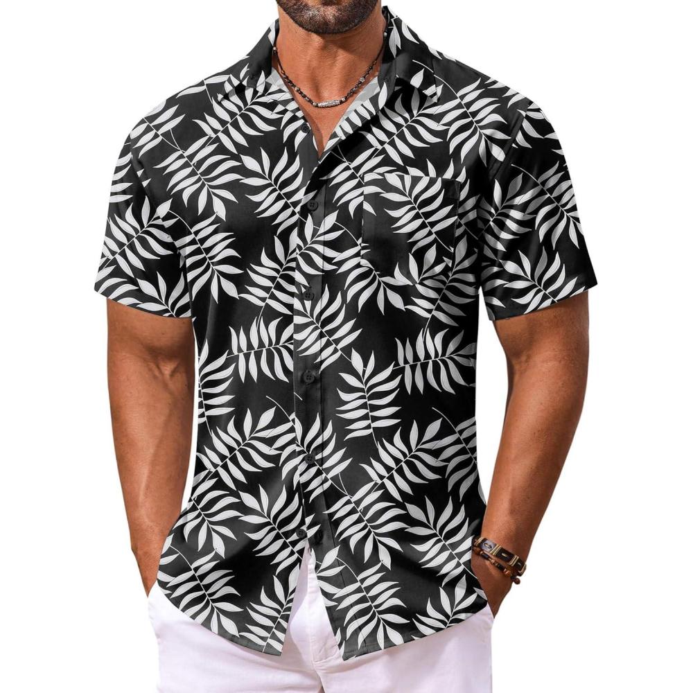 COOFANDY Men’s Hawaiian Shirt Short Sleeve Floral Button Down Shirts Tropical Vacation Beach Shirts with Pocket(Black – White Leaf)