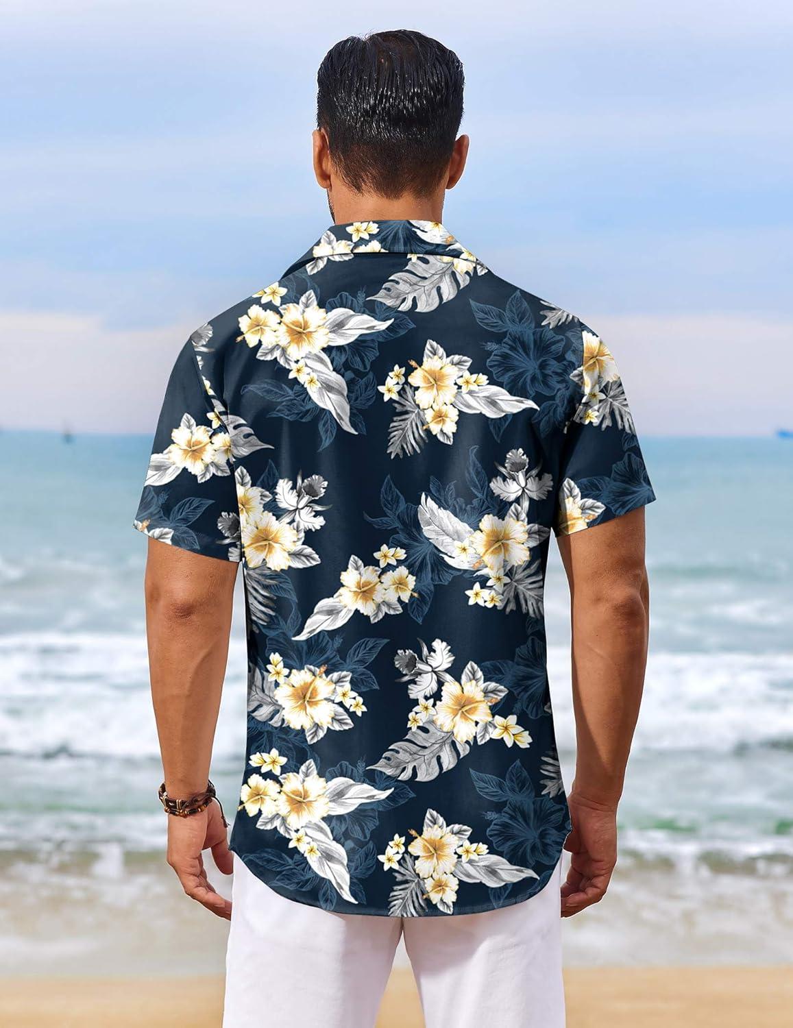 COOFANDY Men’s Hawaiian Shirt Short Sleeve Floral Button Down Shirts Tropical Vacation Beach Shirts with Pocket(Navy Blue – Flower)