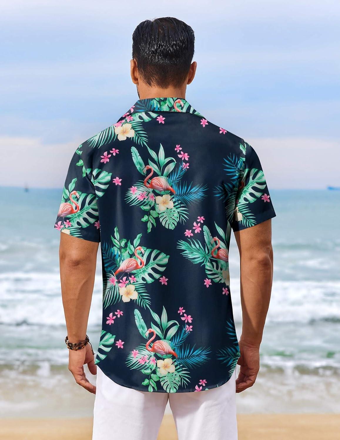 COOFANDY Men’s Hawaiian Shirt Short Sleeve Floral Button Down Shirts Tropical Vacation Beach Shirts with Pocket(Navy – Flamingo)