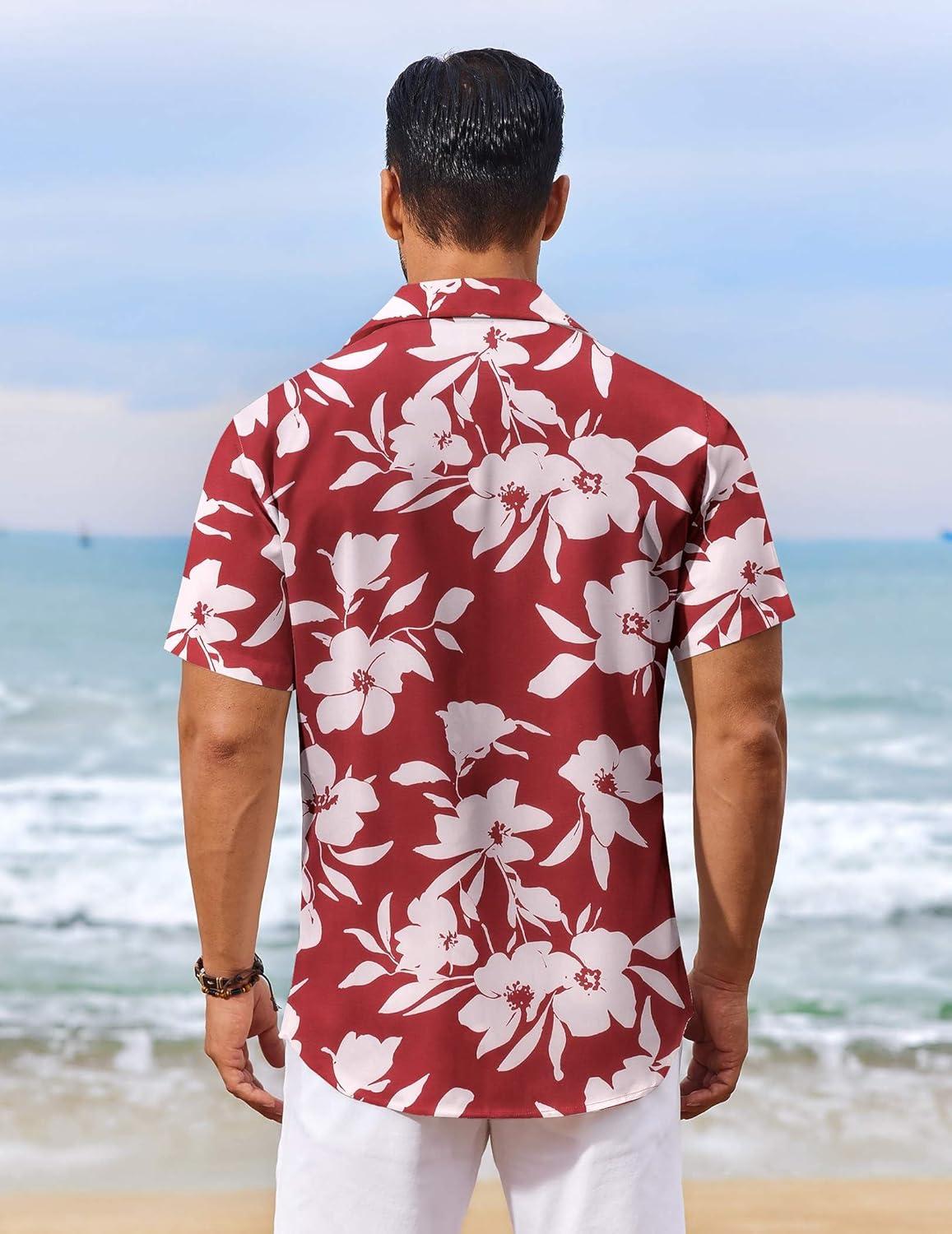 COOFANDY Men’s Hawaiian Shirt Short Sleeve Floral Button Down Shirts Tropical Vacation Beach Shirts with Pocket(Wine Red – White Flower)