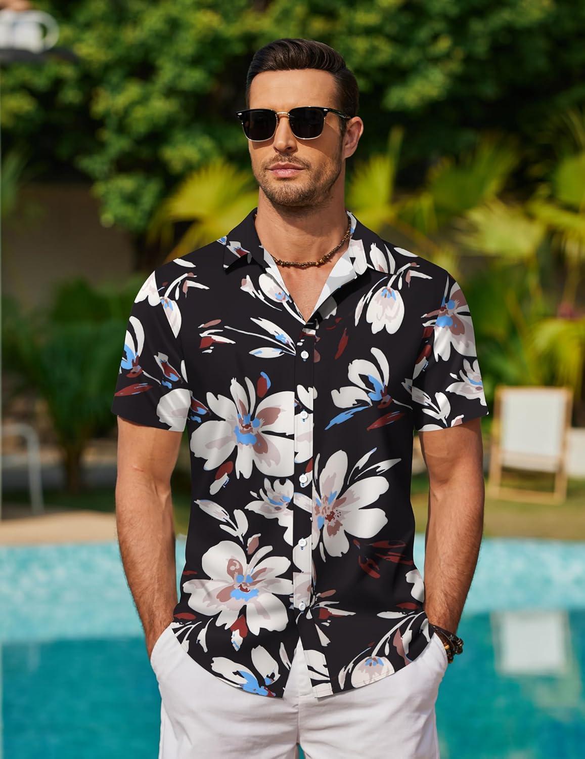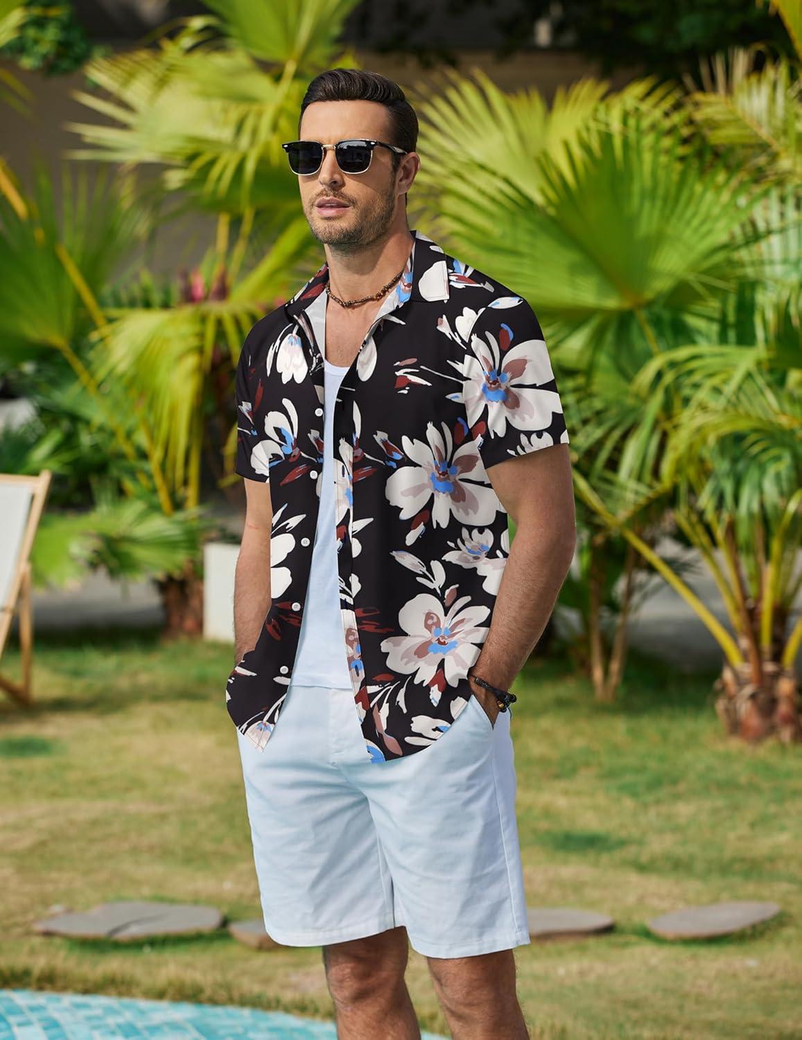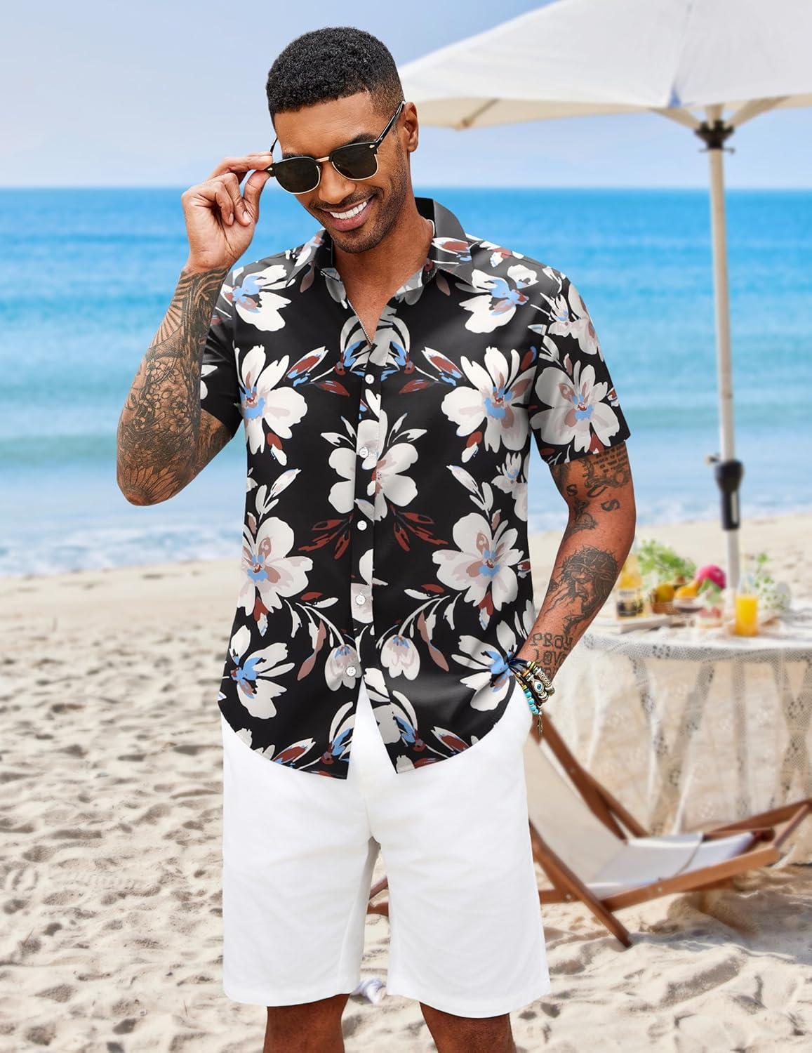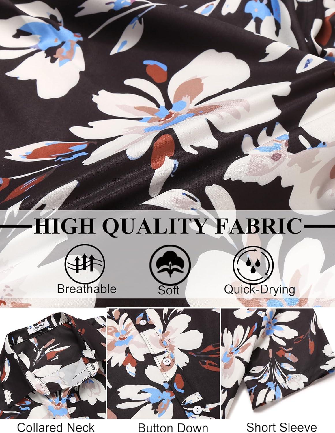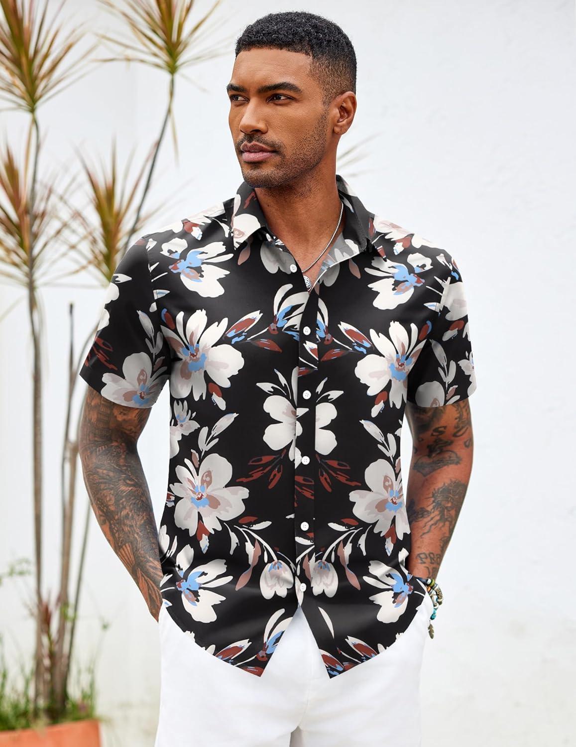 COOFANDY Mens Hawaiian Shirts Short Sleeve Button Down Aloha Shirt Casual Beach Clothes(Black- Beige Flower)