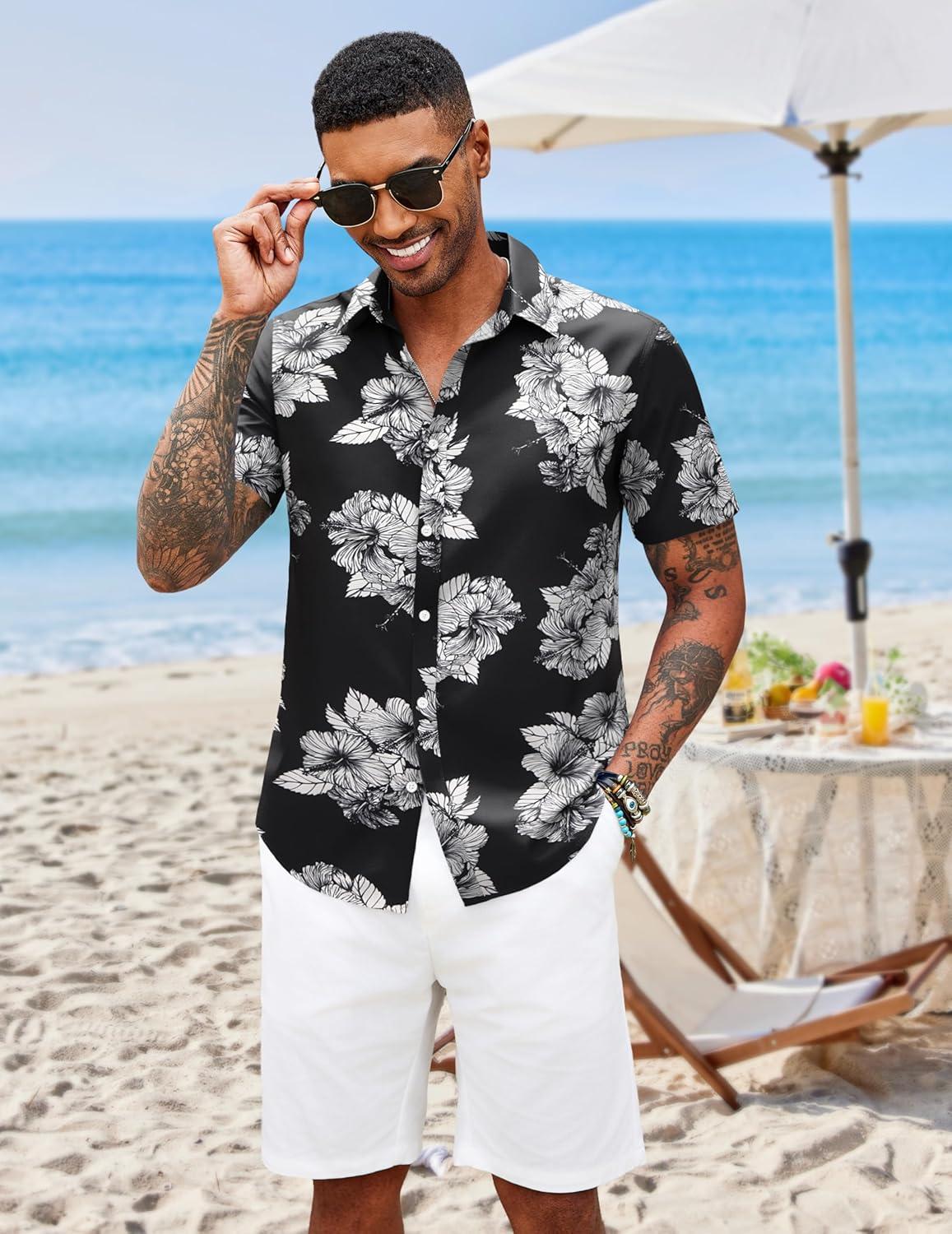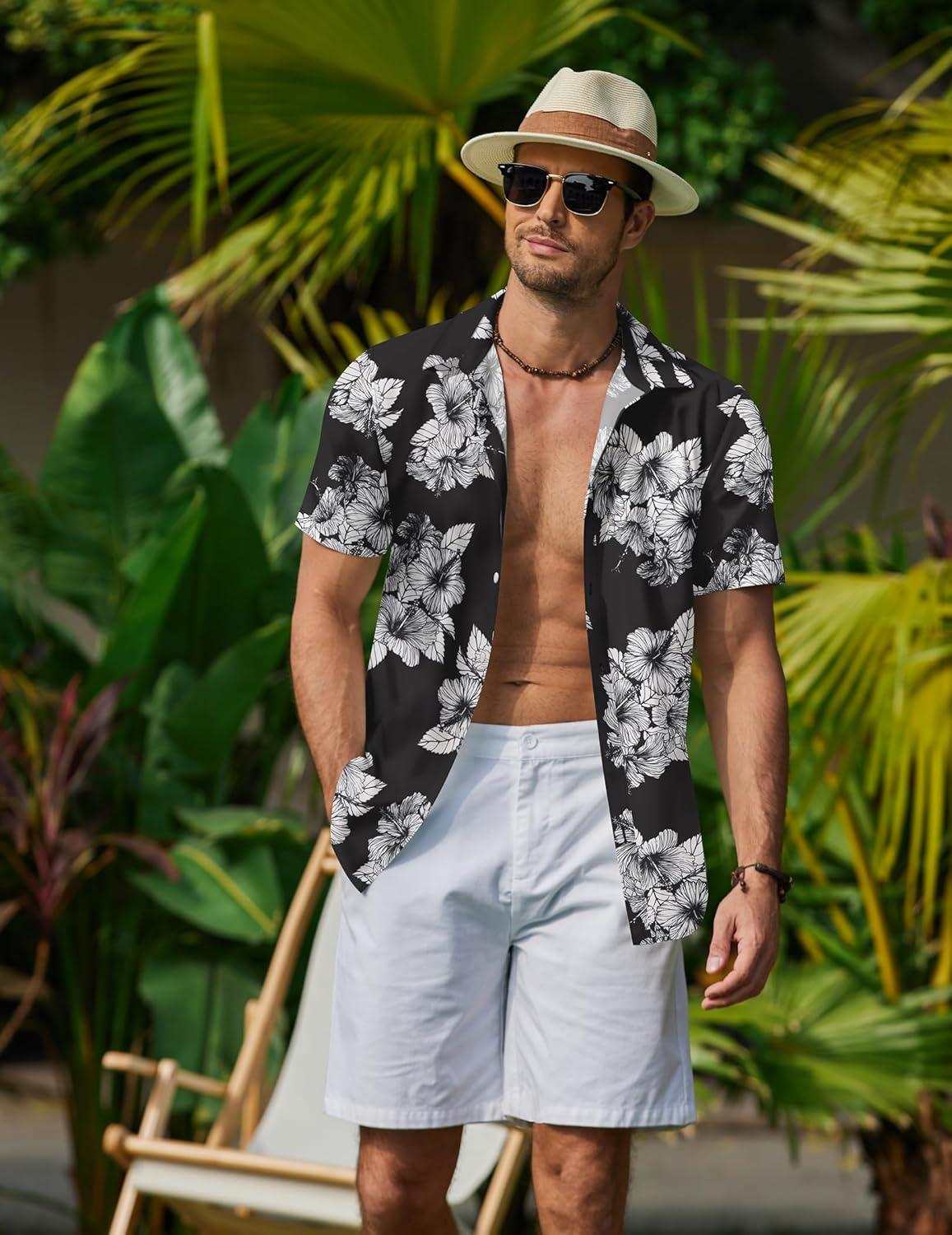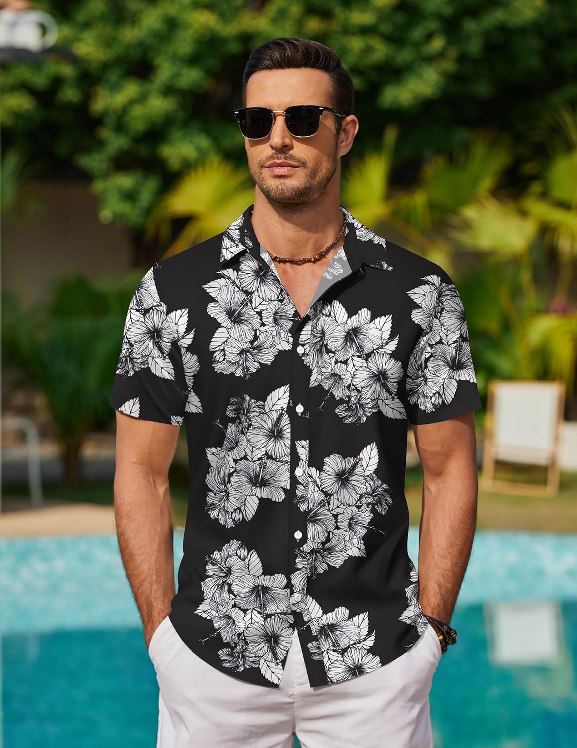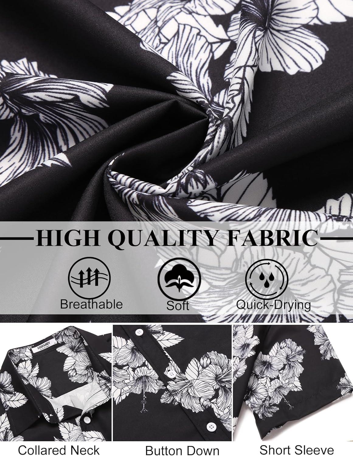 COOFANDY Mens Hawaiian Shirts Short Sleeve Button Down Aloha Shirt Casual Beach Clothes(Black- White Flower)