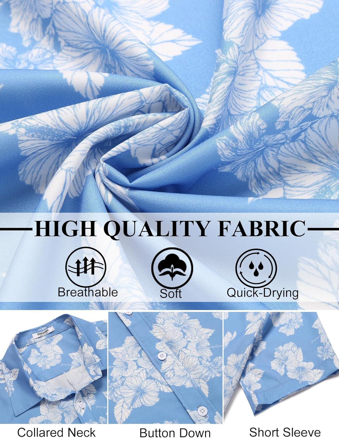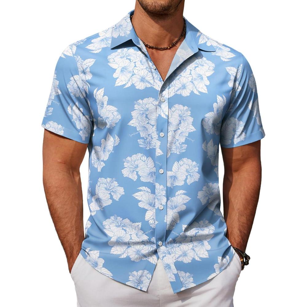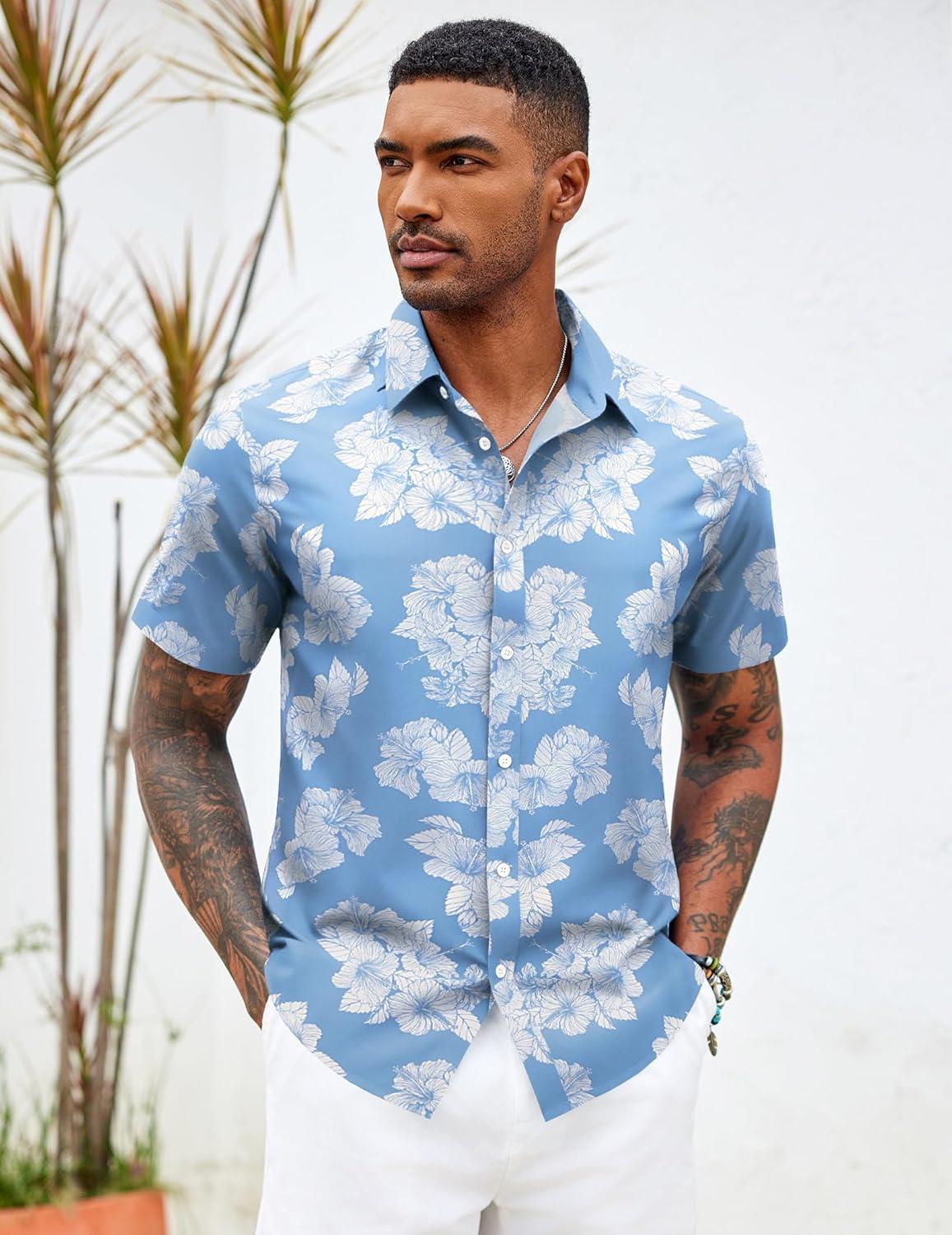 COOFANDY Mens Hawaiian Shirts Short Sleeve Button Down Aloha Shirt Casual Beach Clothes(Blue- White Flower)