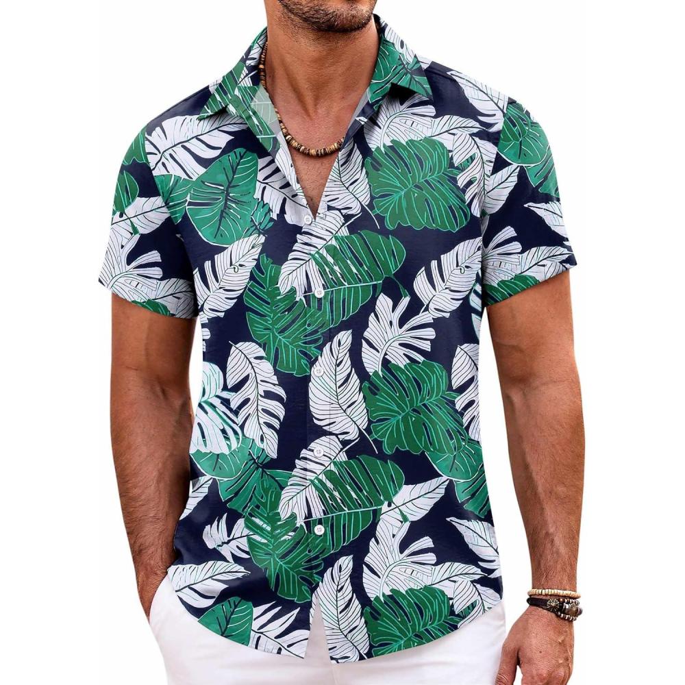COOFANDY Mens Hawaiian Shirts Short Sleeve Casual Button Down Beach Vacation Summer Shirt(Navy Blue-green White Leaf)