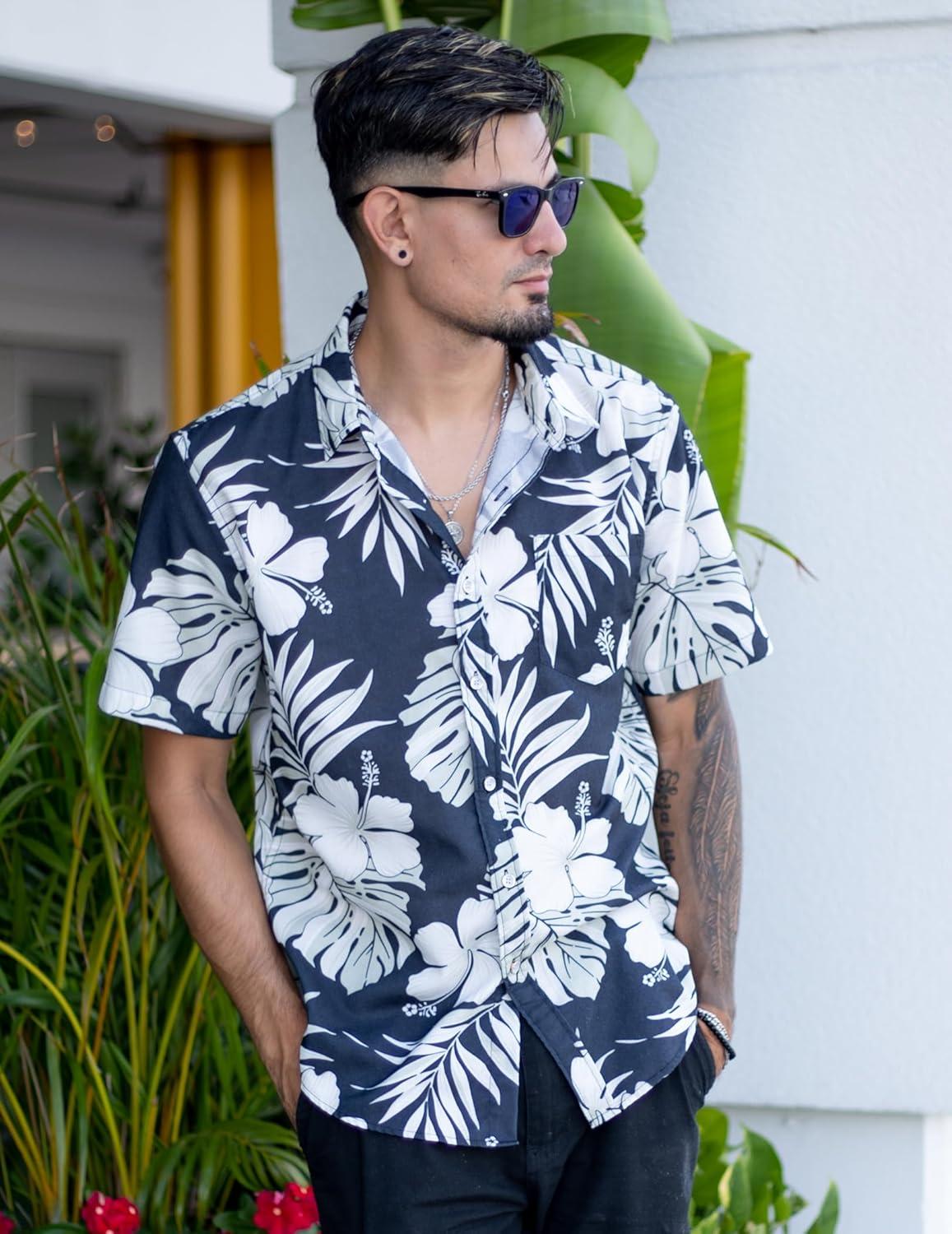 COOFANDY Mens Hawaiian Shirts Short Sleeve Casual Button Down Tropical Beach Shirt(Black / White Leaf)