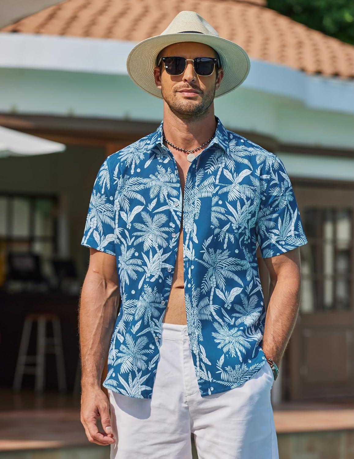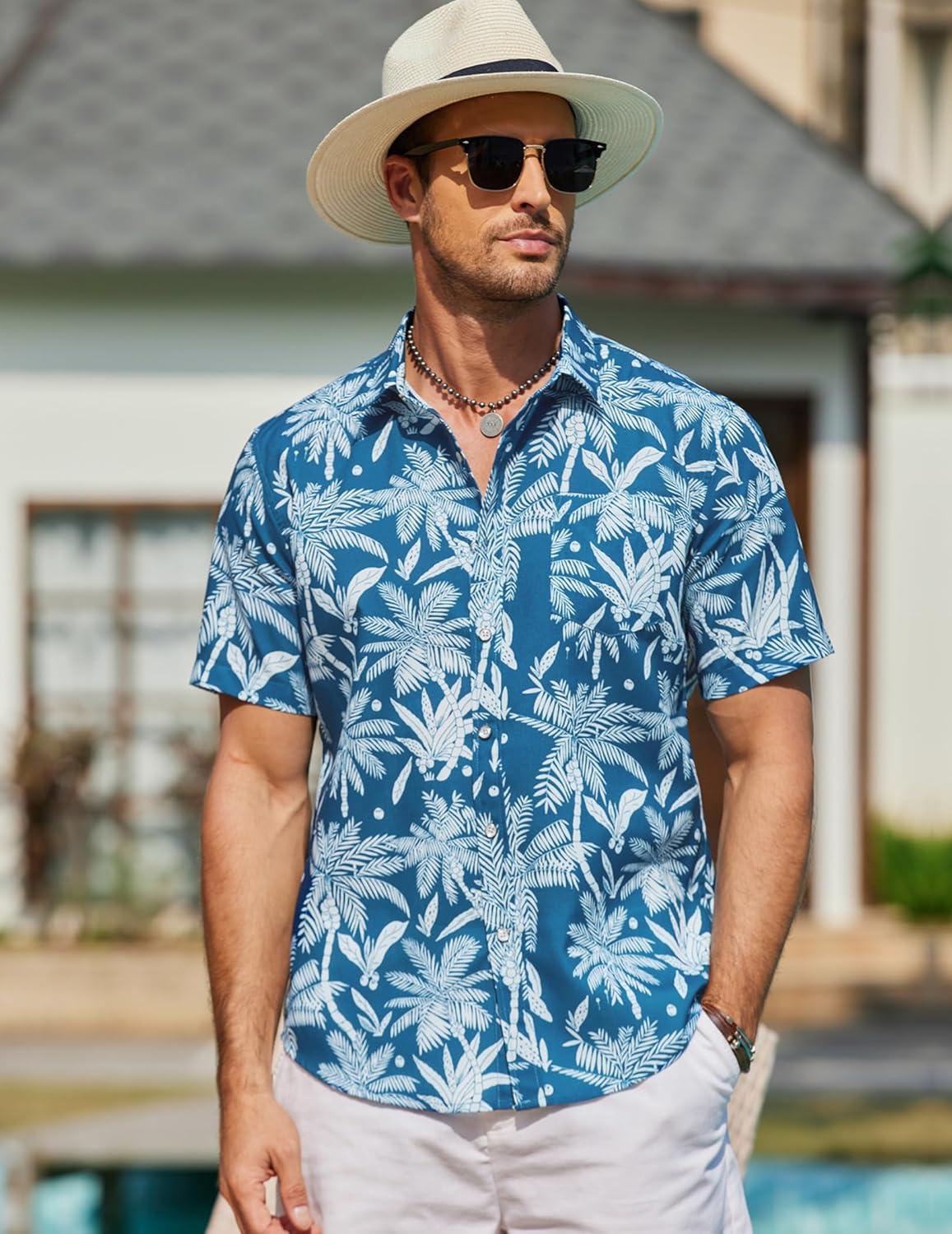 COOFANDY Mens Hawaiian Shirts Short Sleeve Casual Button Down Tropical Beach Shirt(Blue / White Plam Leaf)