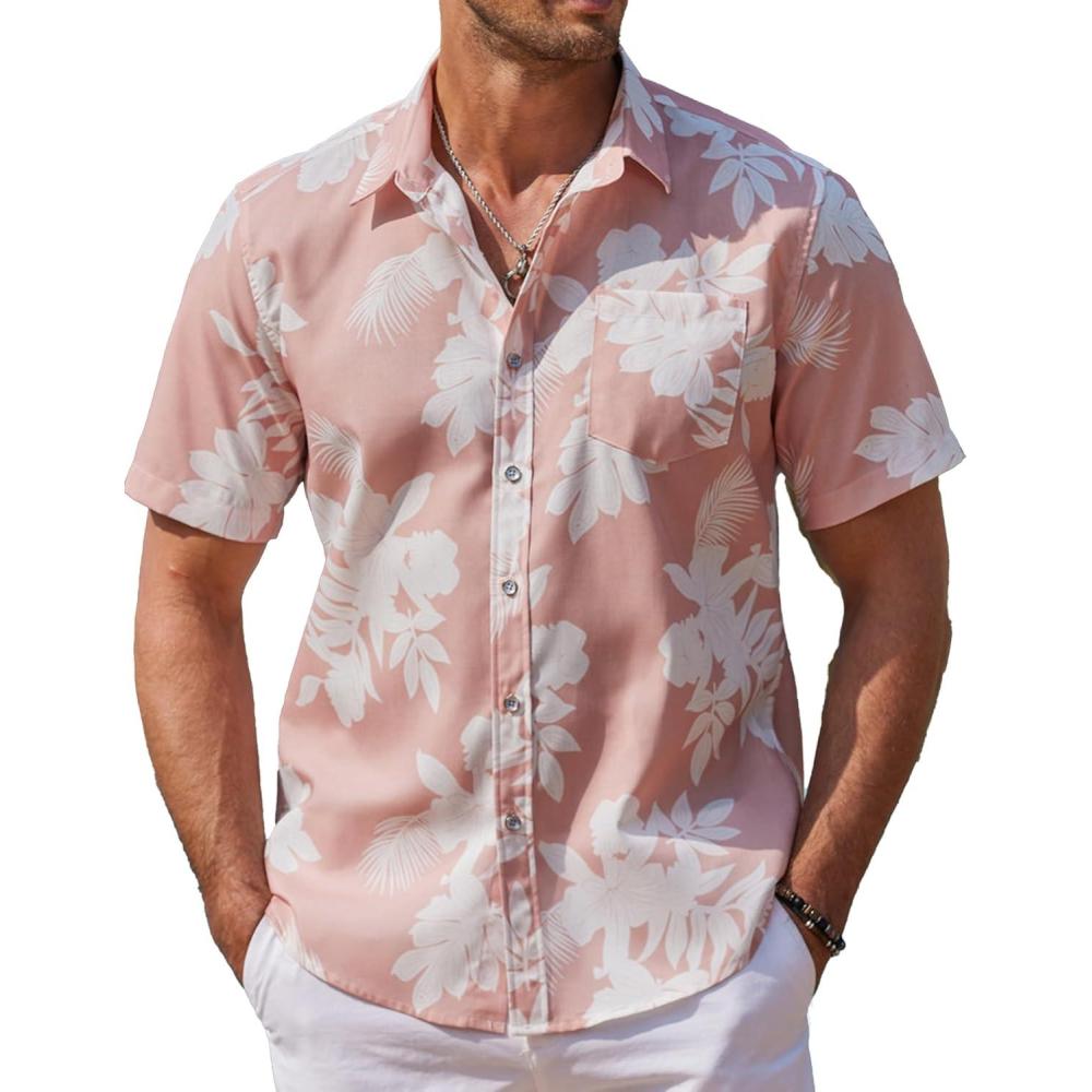 COOFANDY Mens Hawaiian Shirts Short Sleeve Casual Button Down Tropical Beach Shirt(Pink / White Floral)