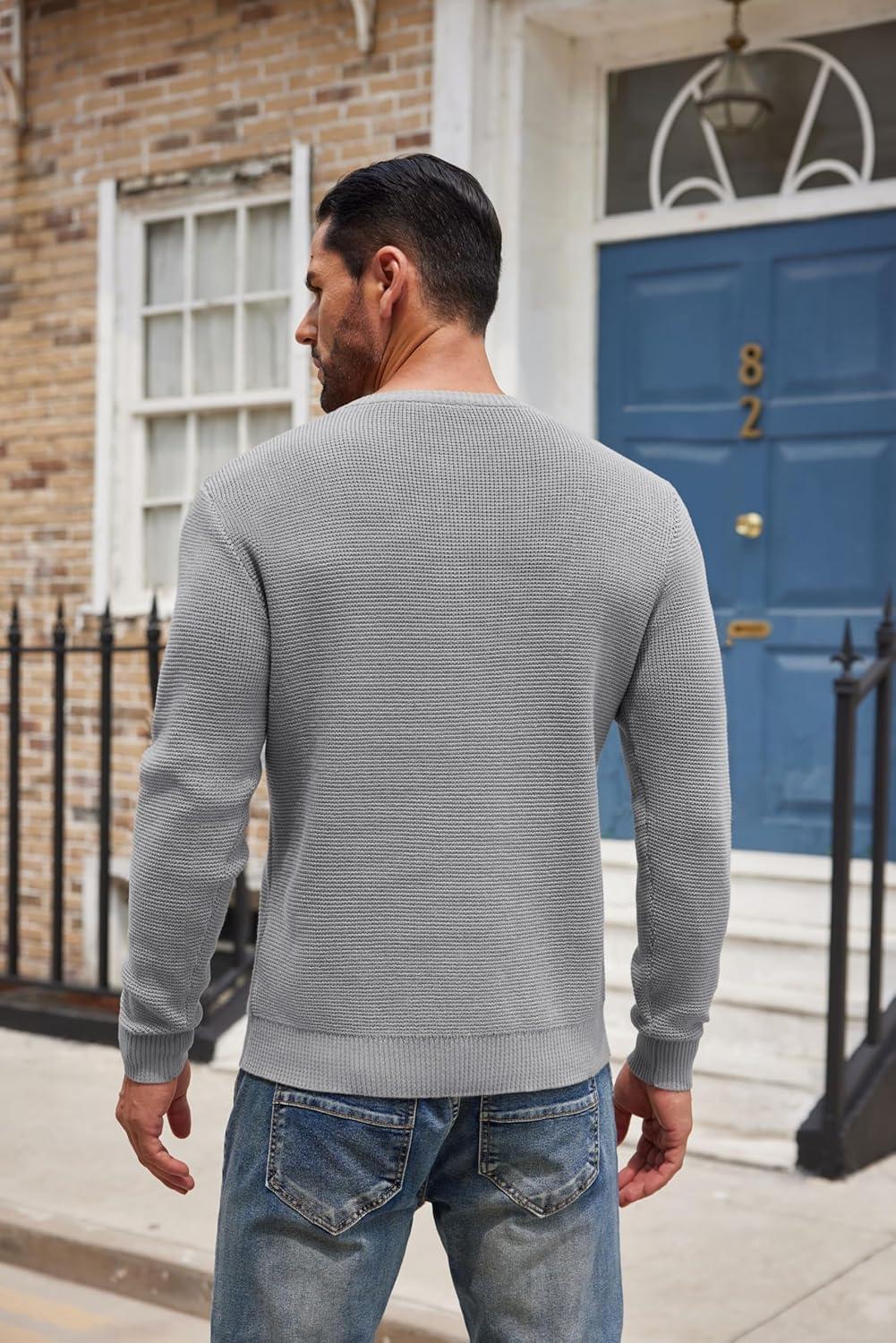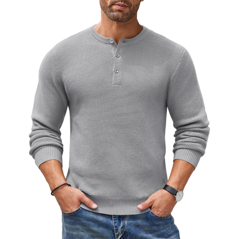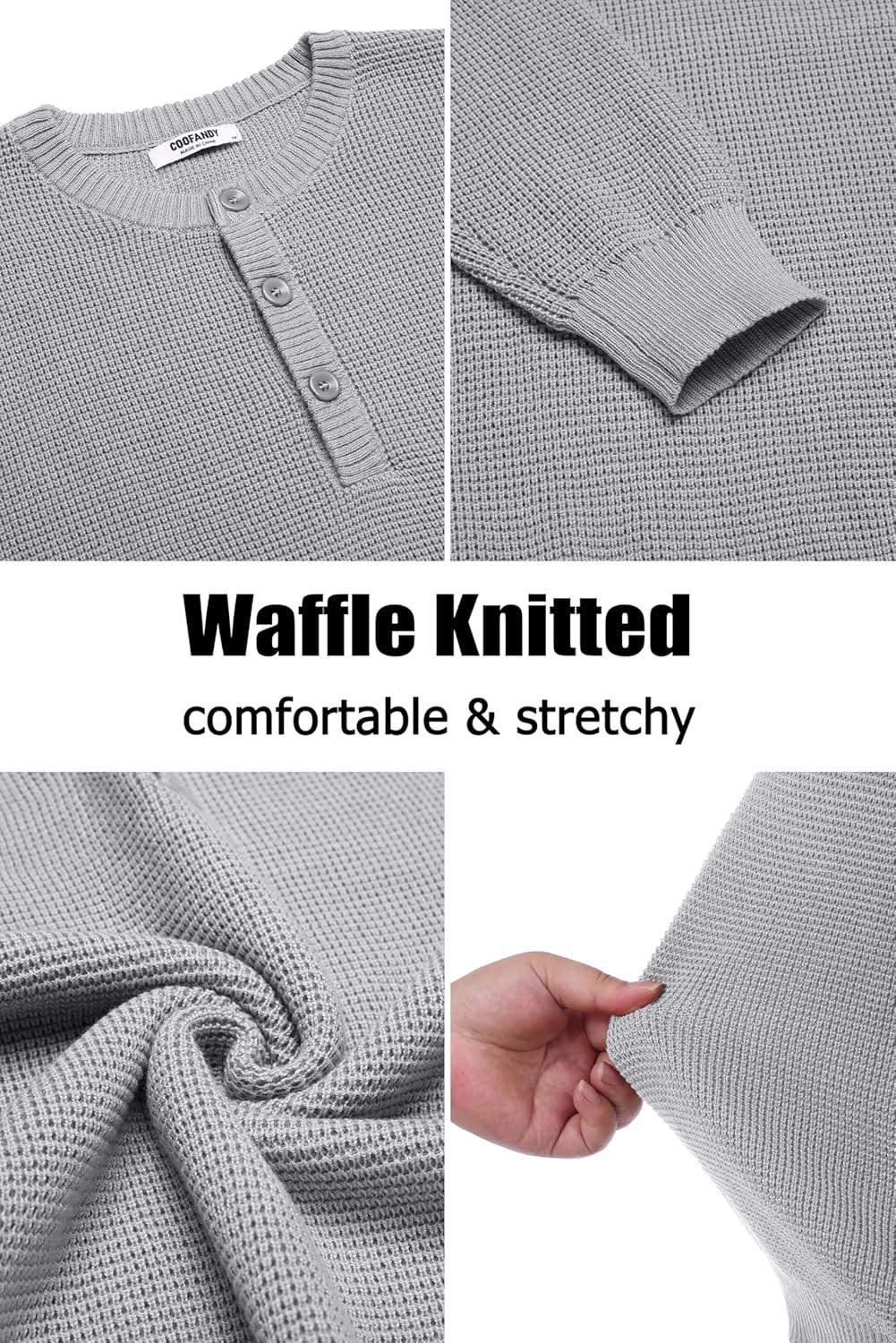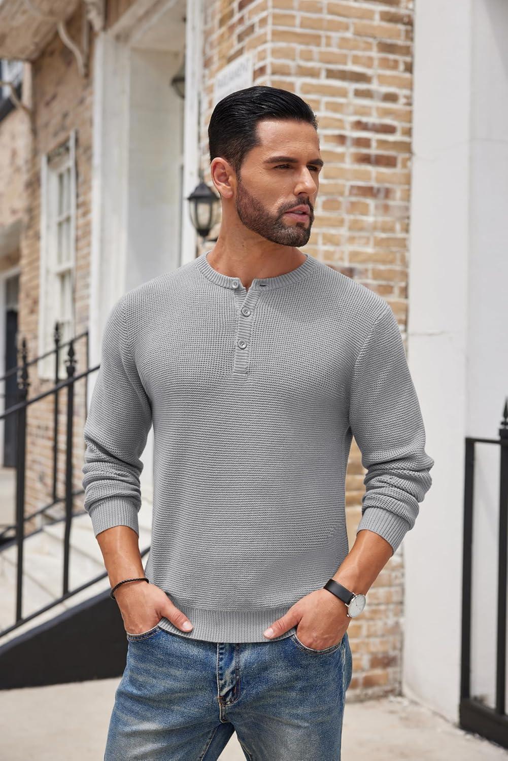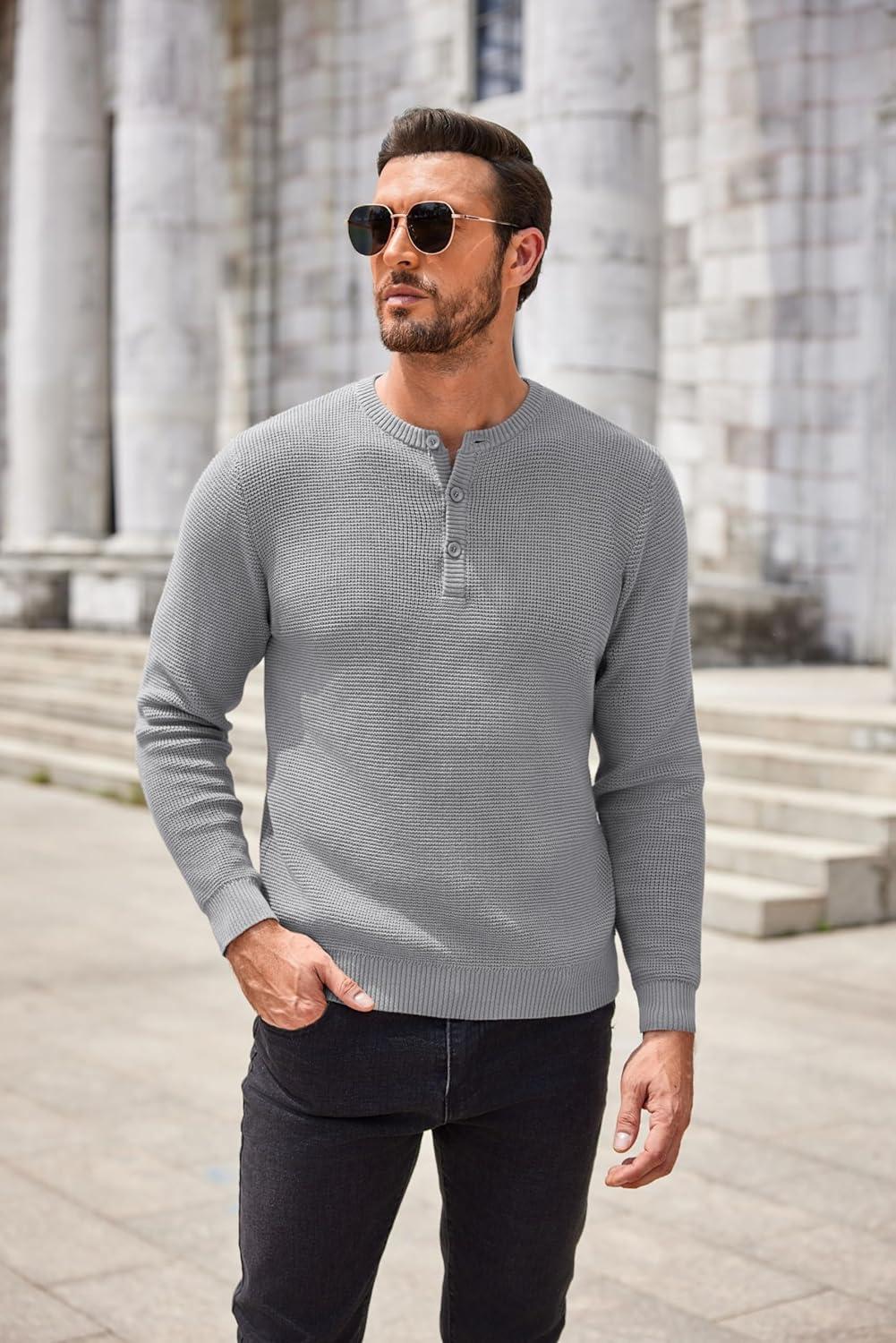 COOFANDY Men’s Henley Knit Sweater Long Sleeve Button Pullover Sweater Casual Waffle Texture Fashion Henley Sweater(Light Grey)