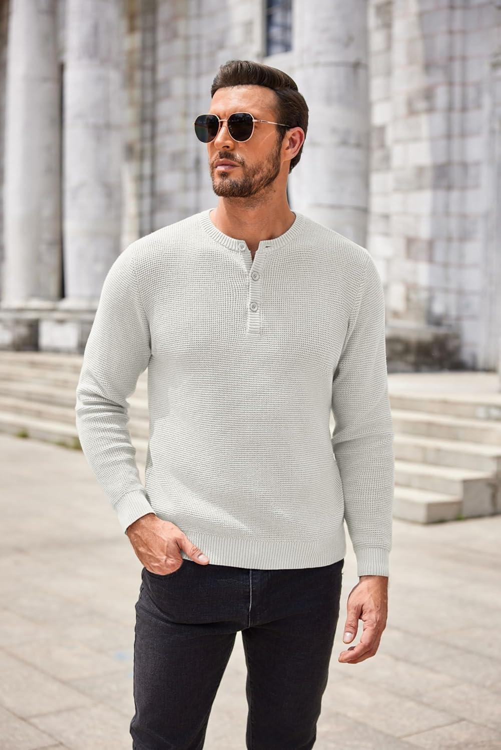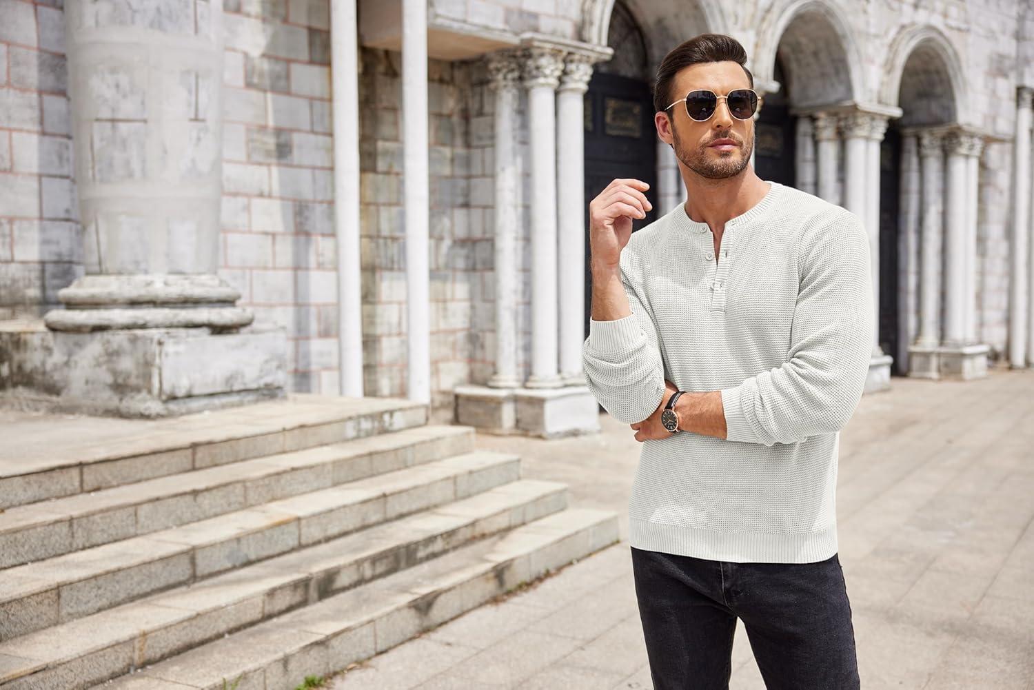 COOFANDY Men’s Henley Knit Sweater Long Sleeve Button Pullover Sweater Casual Waffle Texture Fashion Henley Sweater(White)