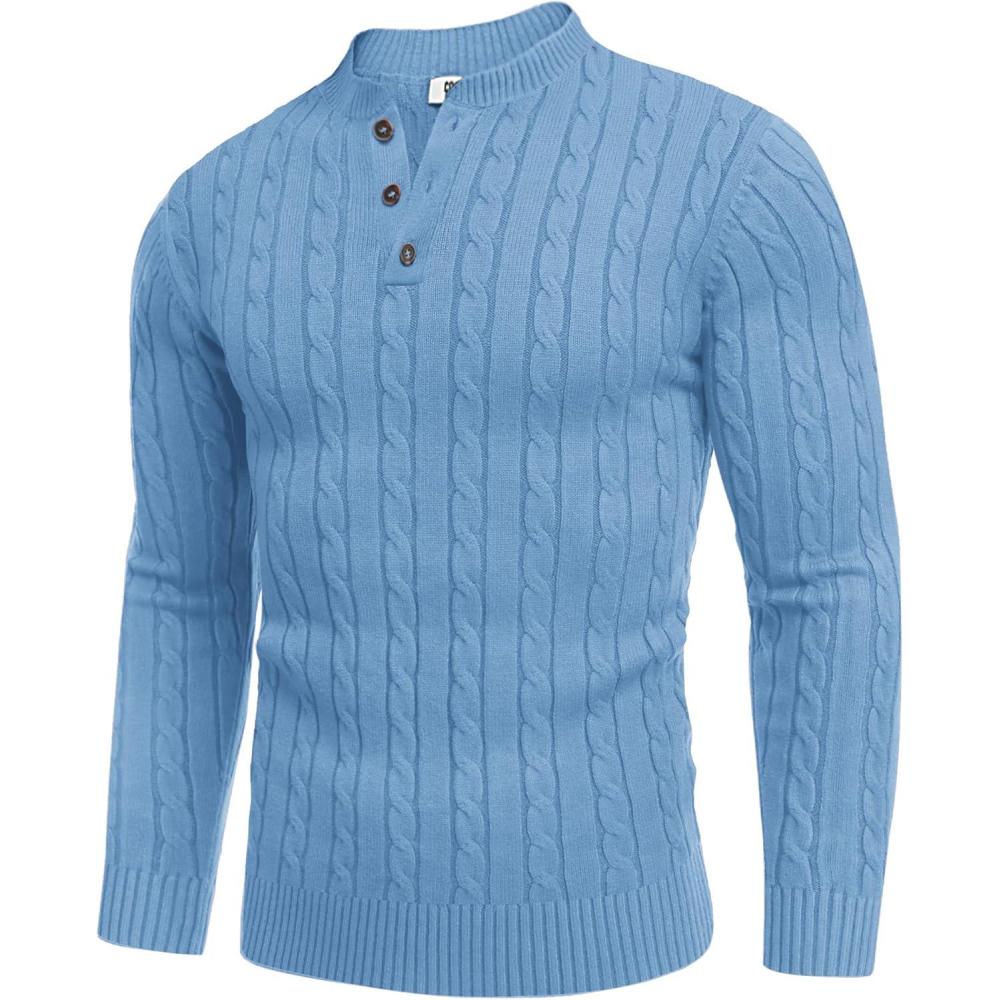 COOFANDY Men’s Henley Knit Sweater Long Sleeve Mid-Weight Soft Pullover Shirt with Chest Pocket(Light Blue)