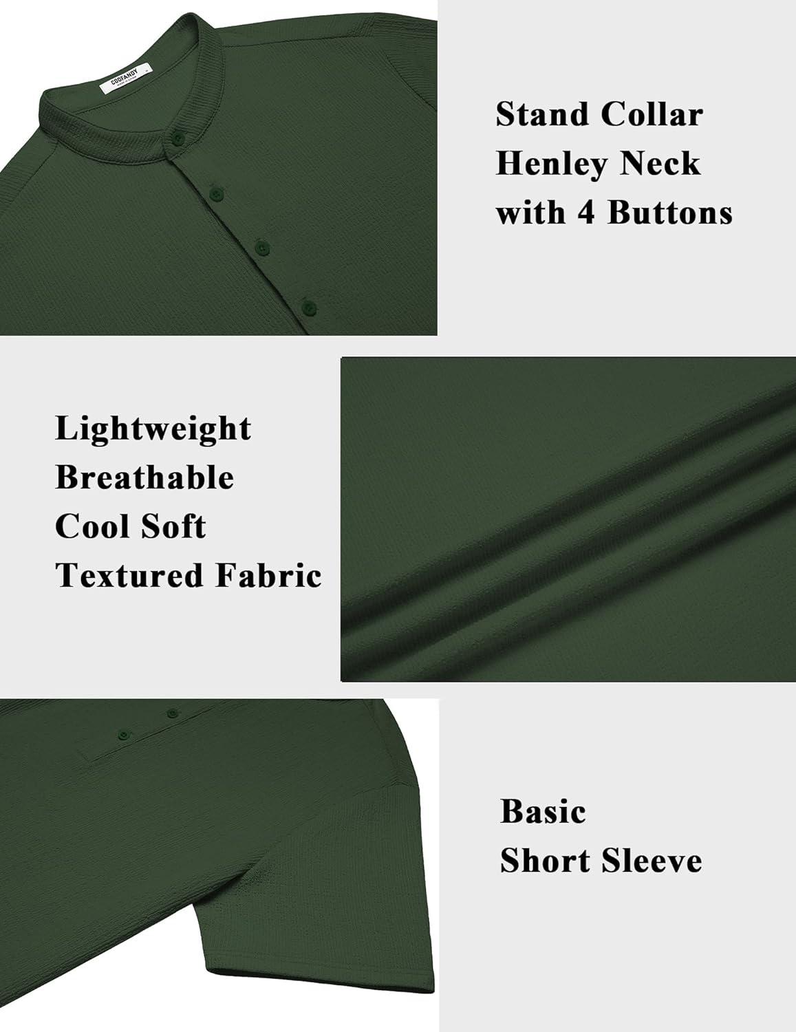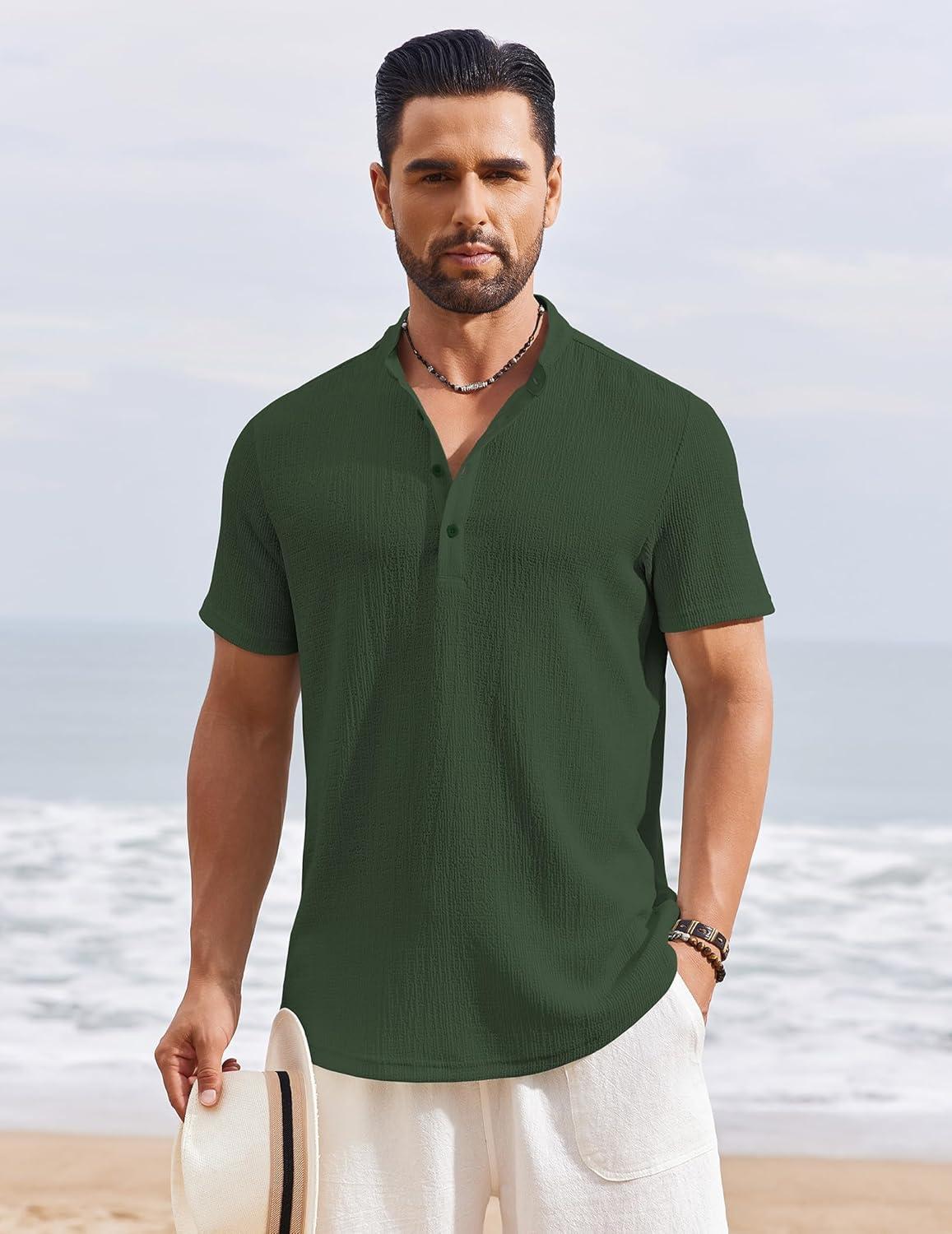 COOFANDY Men’s Henley Shirt Short Sleeve Stand Collar Summer Casual Beach Hippie T-Shirts(Army Green)