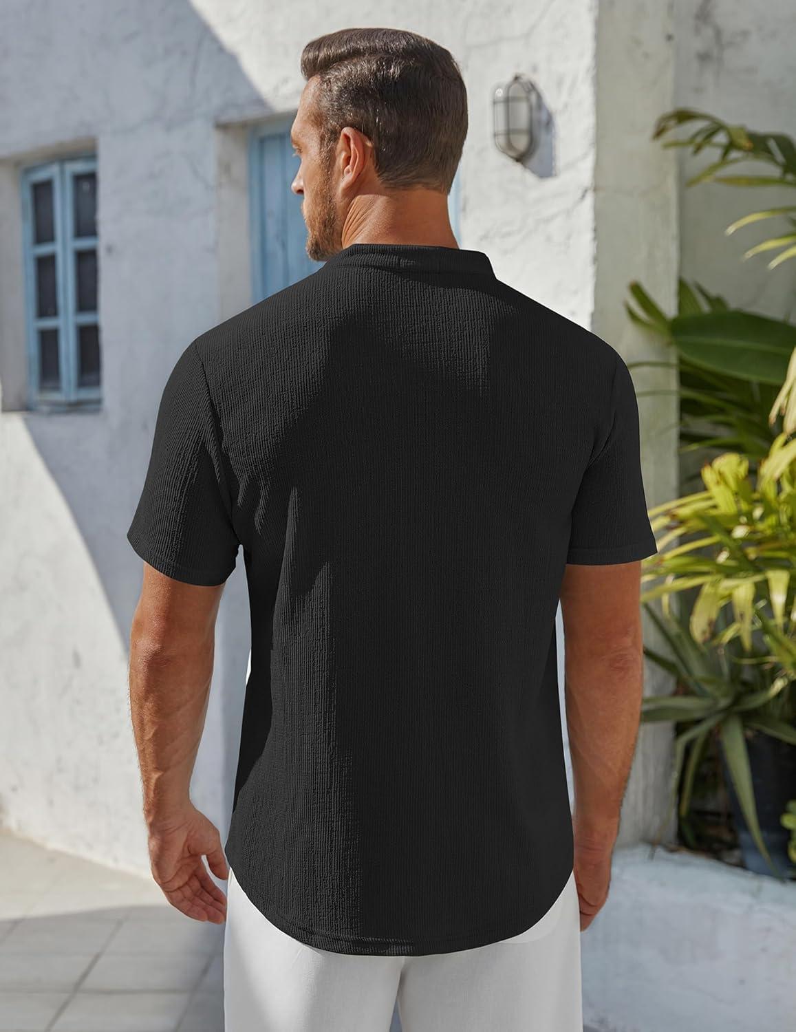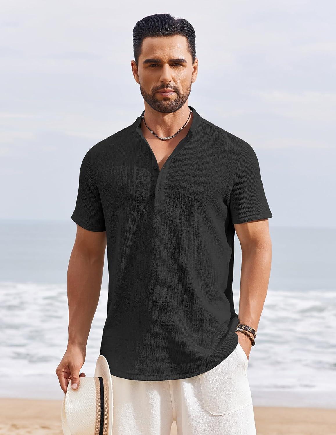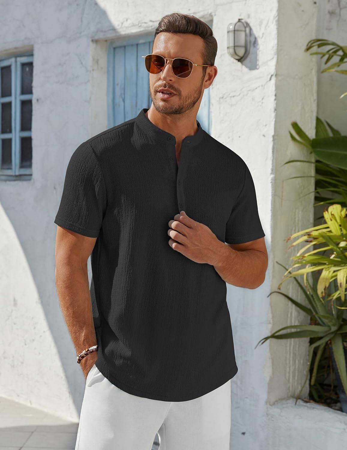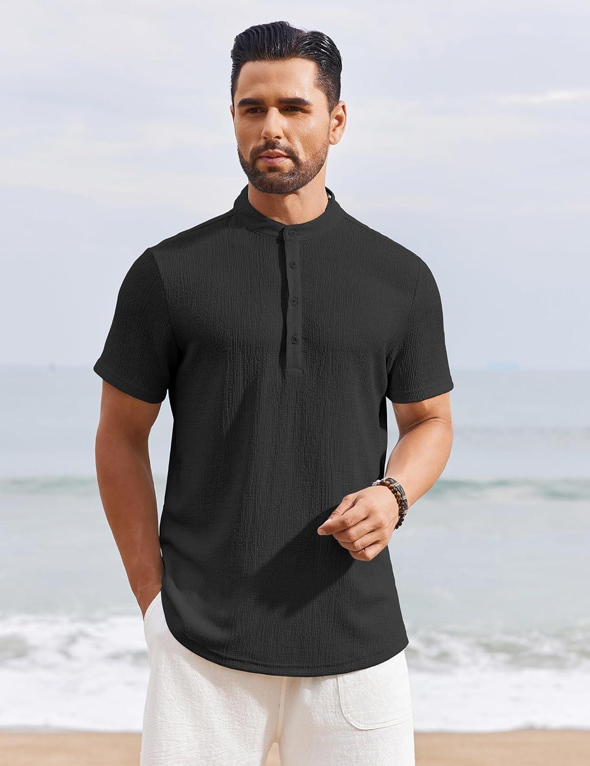 COOFANDY Men’s Henley Shirt Short Sleeve Stand Collar Summer Casual Beach Hippie T-Shirts(Black)