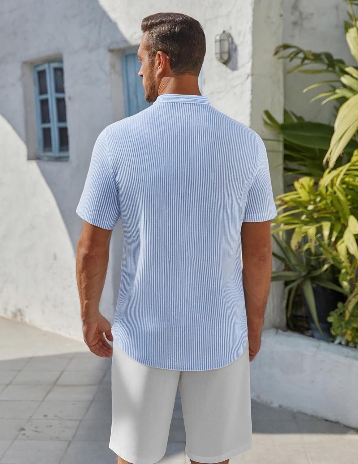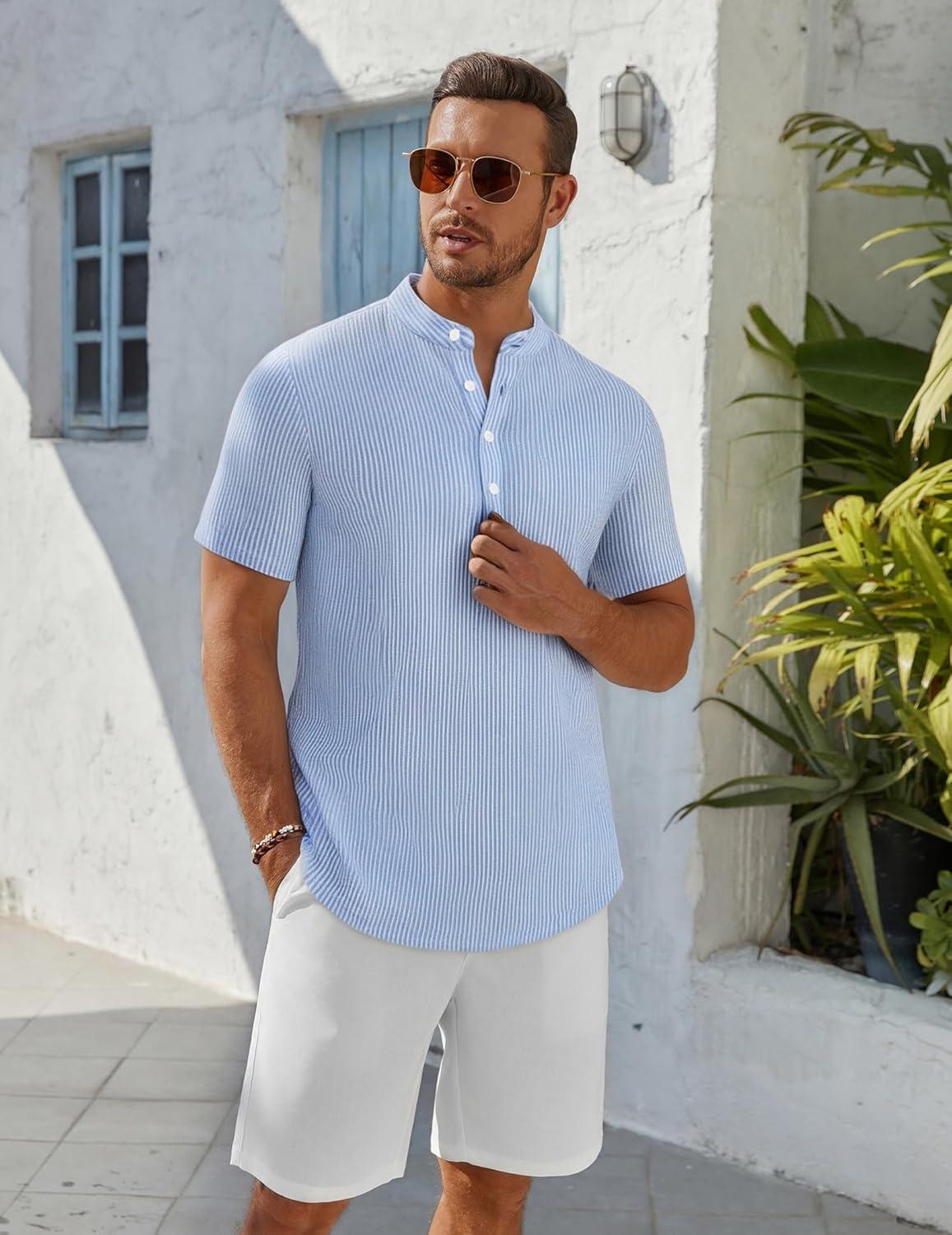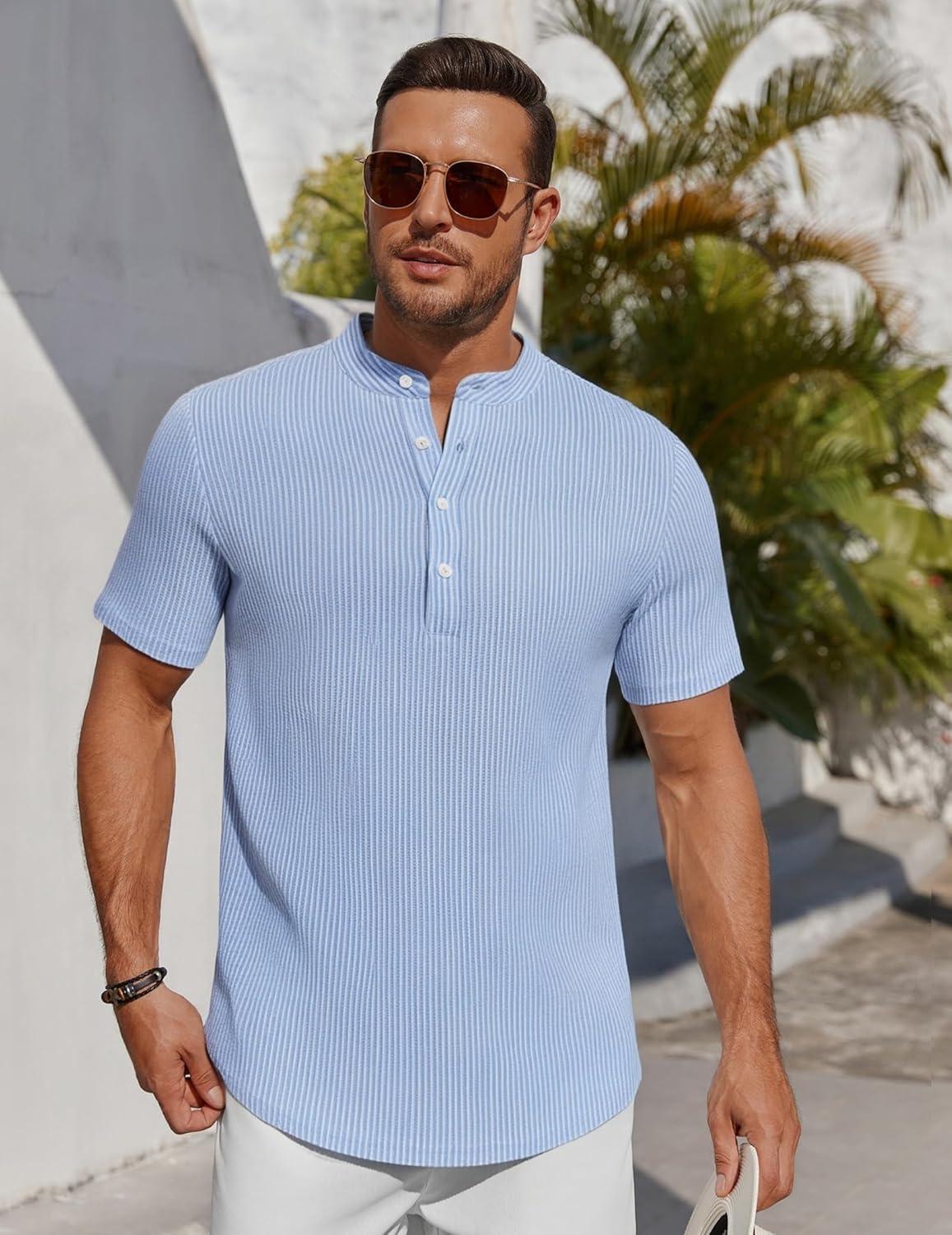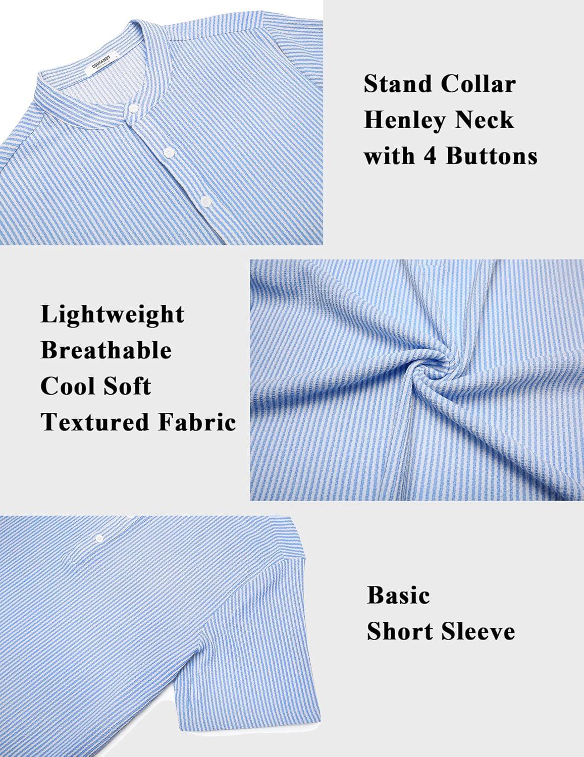 COOFANDY Men’s Henley Shirt Short Sleeve Stand Collar Summer Casual Beach Hippie T-Shirts(Striped Blue & White)