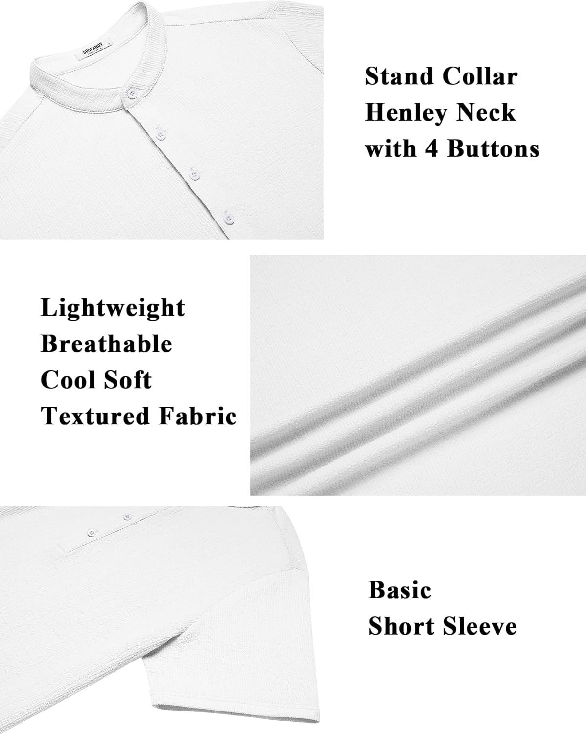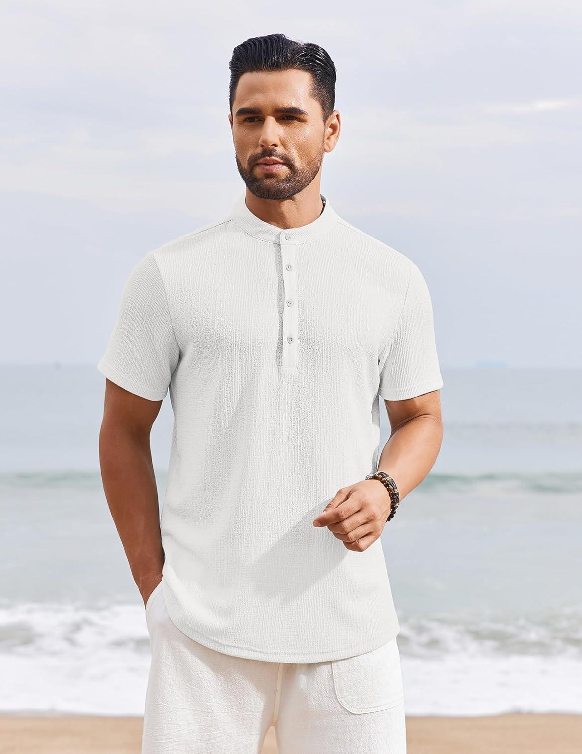COOFANDY Men’s Henley Shirt Short Sleeve Stand Collar Summer Casual Beach Hippie T-Shirts(White)