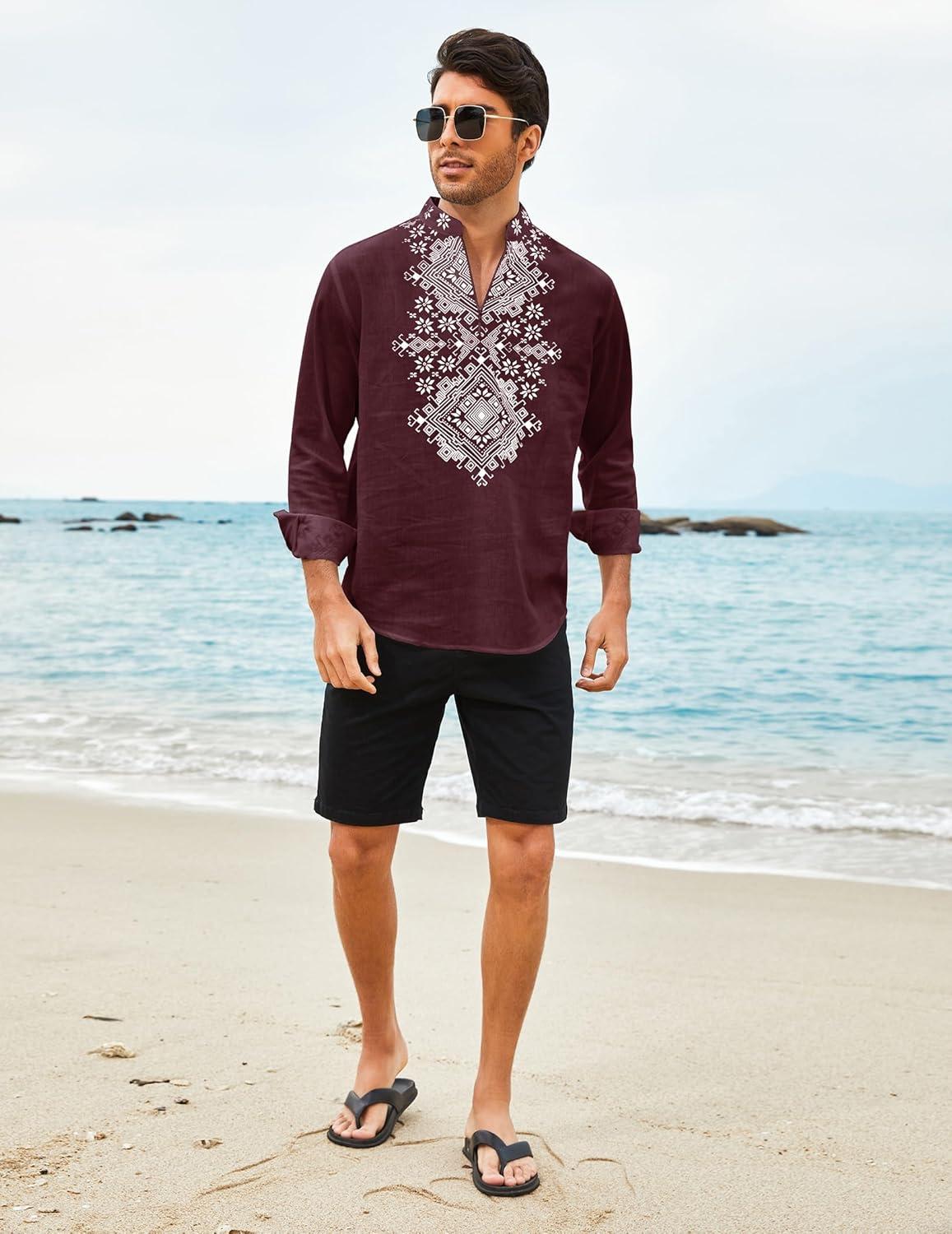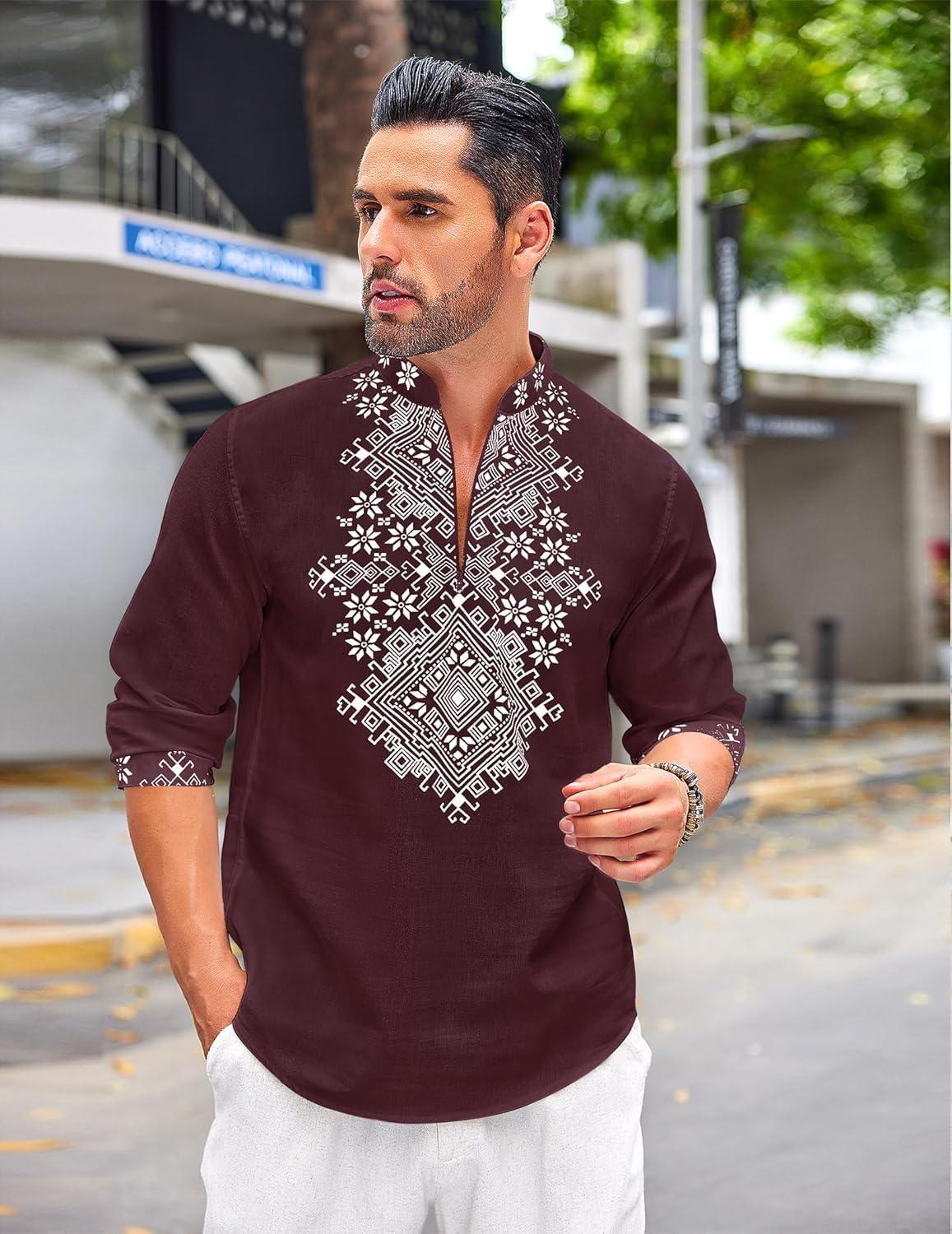 COOFANDY Men’s Henley Shirt Vyshyvanka Long Sleeve African Print Shirts Casual Zip Up Cotton Linen Beach Hippie Shirt(Dark Red)