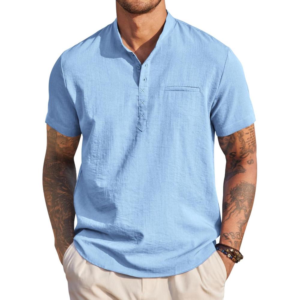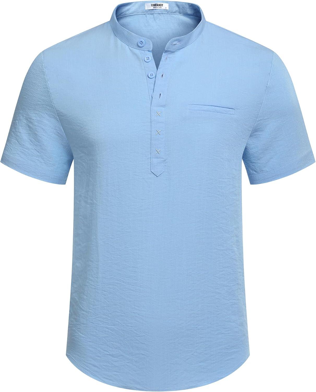 COOFANDY Men’s Henley Shirts Band Collar Short Sleeve T-Shirts Casual Summer Beach Shirt Hippie Fashion Hawaiian Shirt(Light Blue)