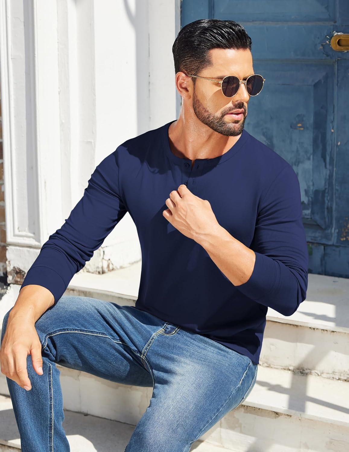 COOFANDY Mens Henley Shirts Cotton Long Sleeve V Neck Button Basic Tees Plain Casual Pullover(Navy Blue)