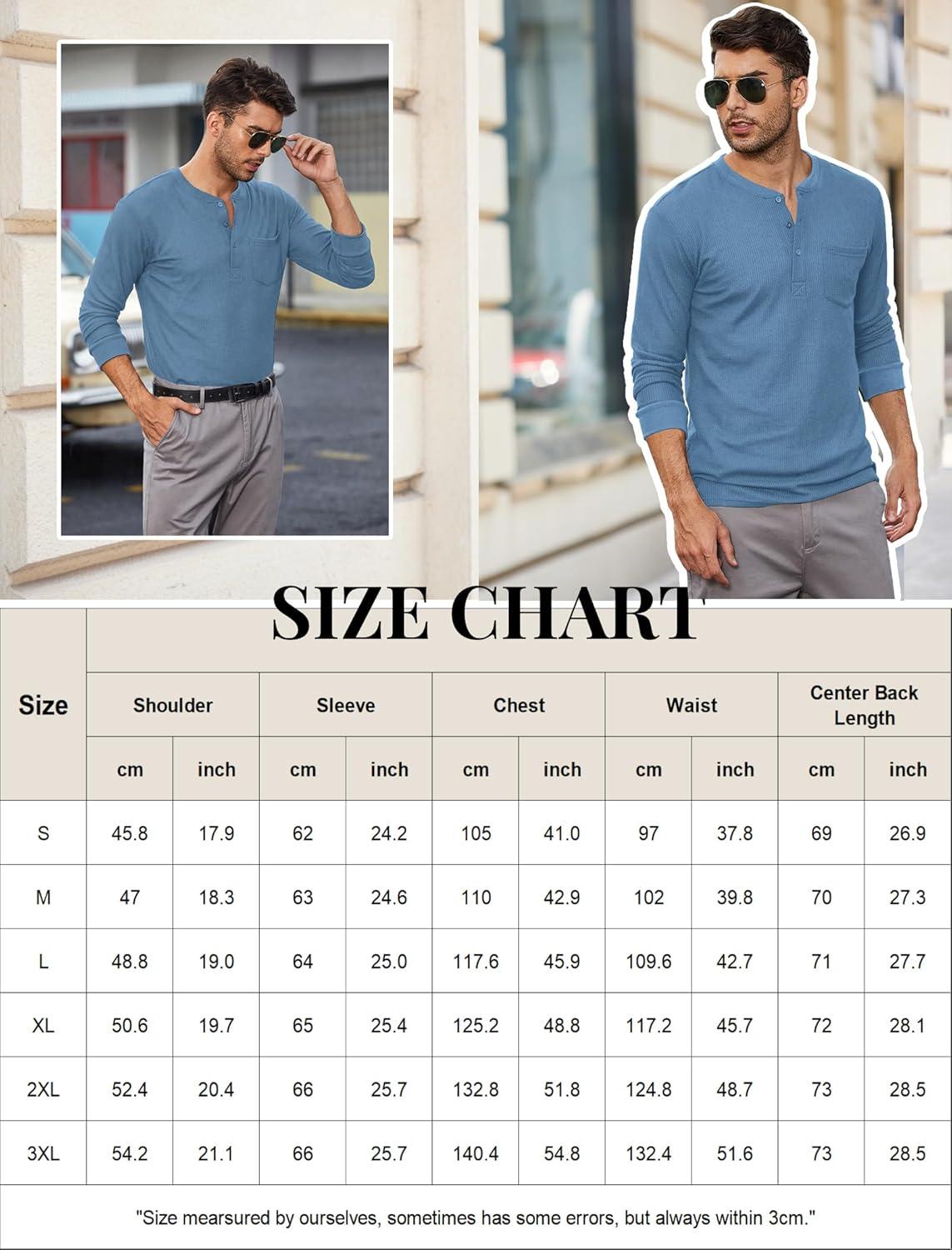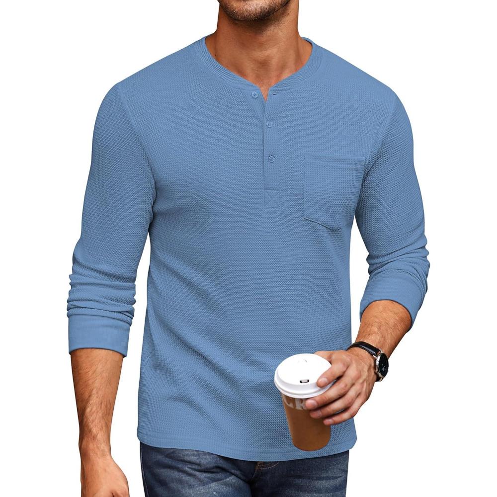 COOFANDY Men’s Henley Shirts Long Sleeve Basic Waffle Pique Pullover T-Shirt with Pocket(Lake Blue)
