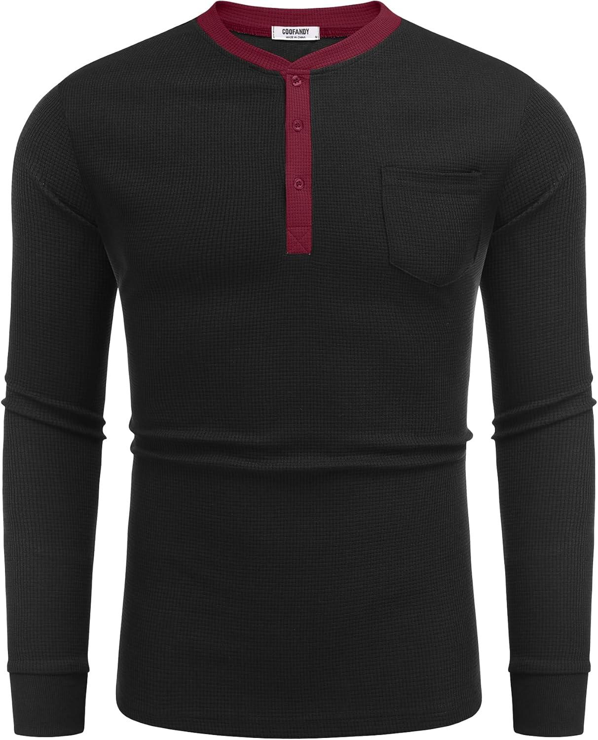 COOFANDY Men’s Henley Shirts Long Sleeve Basic Waffle Pique Pullover T-Shirt with Pocket(Pat: Black & Wine Red)