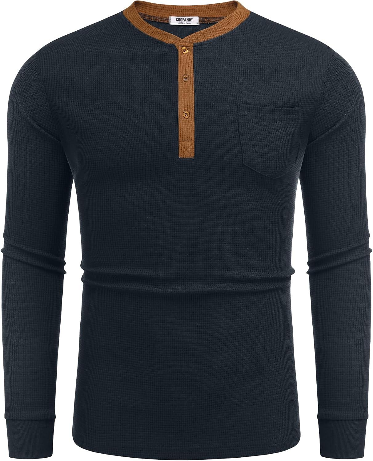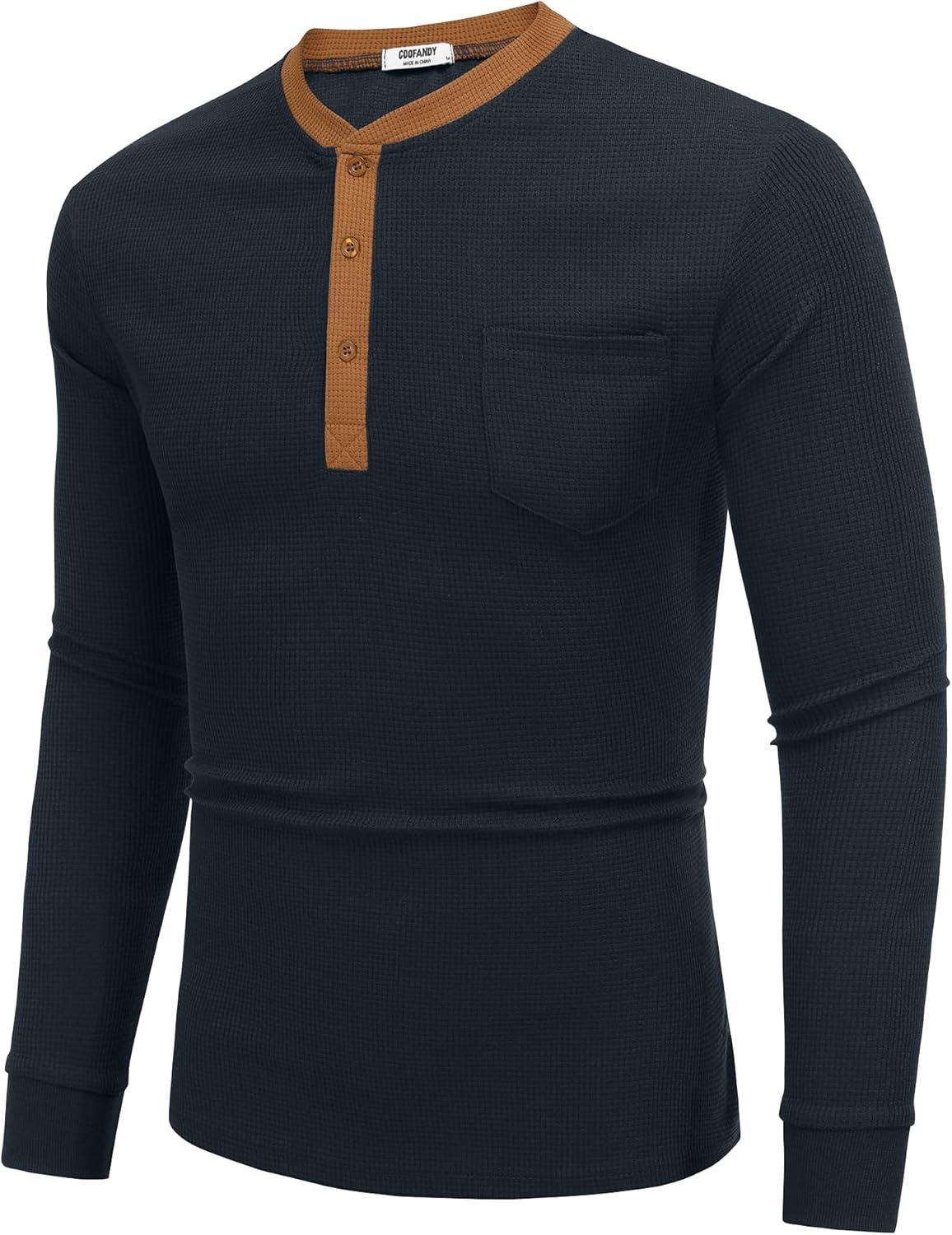 COOFANDY Men’s Henley Shirts Long Sleeve Basic Waffle Pique Pullover T-Shirt with Pocket(Pat: Navy & Light Brown)