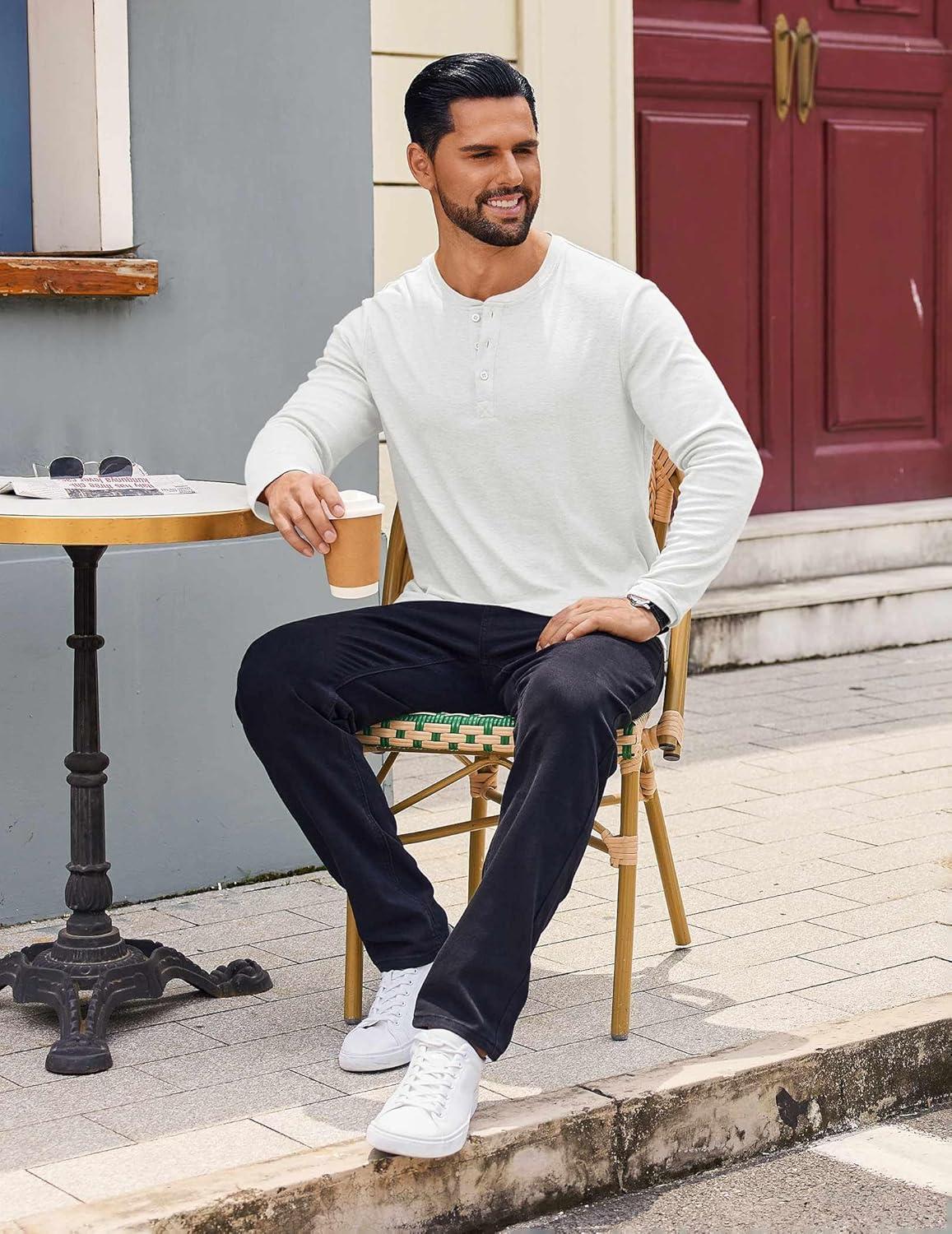 COOFANDY Mens Henley Shirts Long Sleeve Casual Pullover Shirt Fashion Button T-Shirt(White)