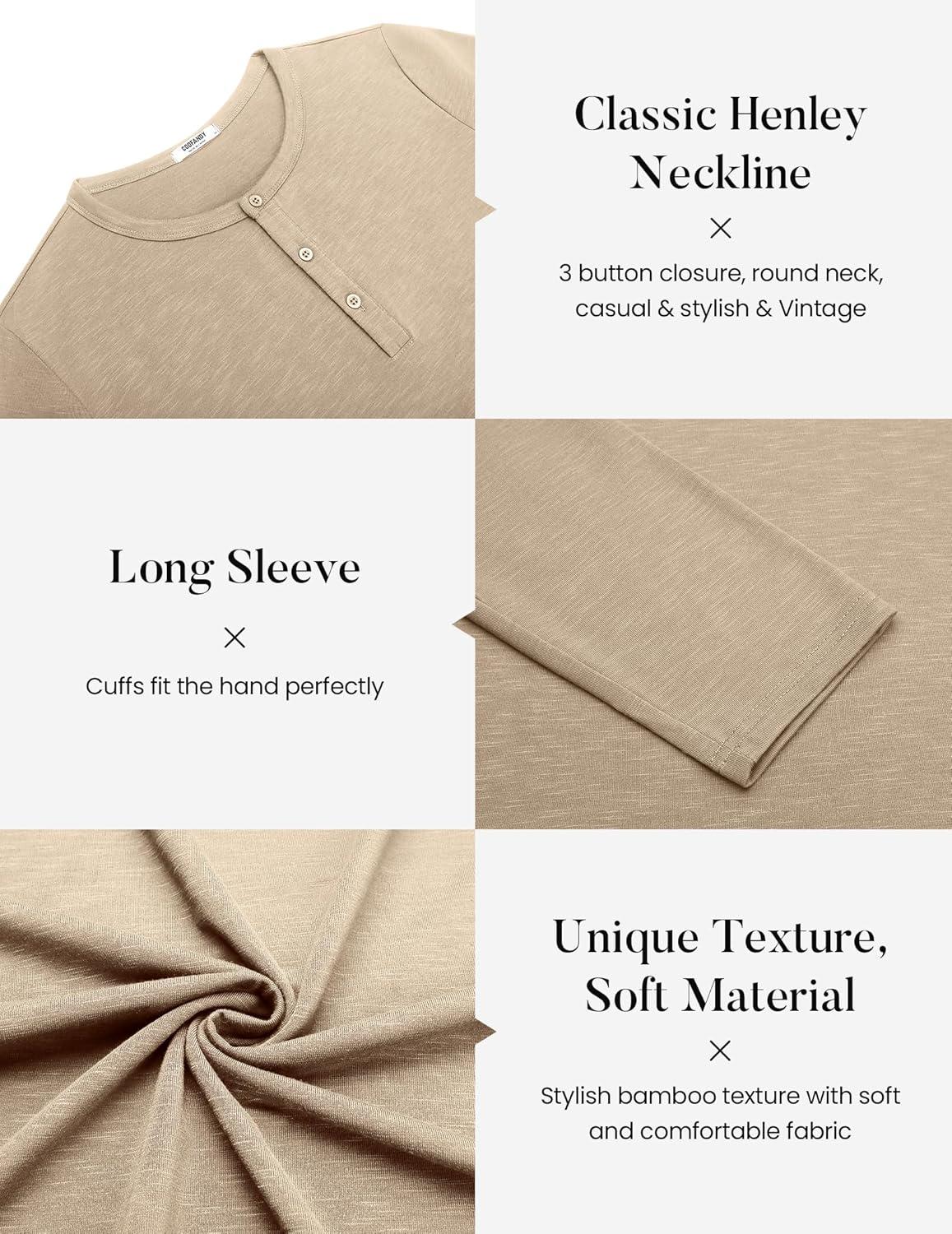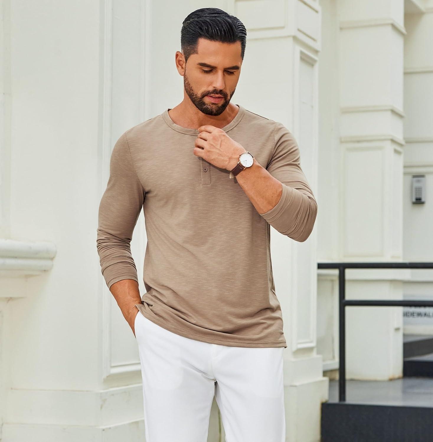 COOFANDY Men’s Henley Shirts Long Sleeve Casual Pullover T-Shirt Fashion Basic Button Shirts(Khaki)