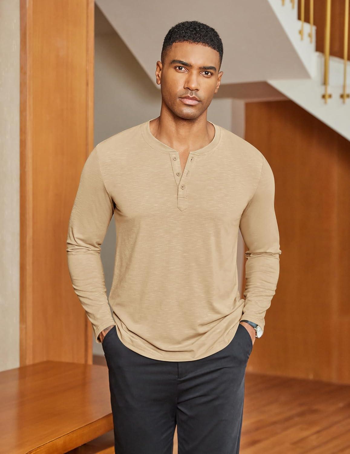 COOFANDY Men’s Henley Shirts Long Sleeve Lightweight Button T-Shirt Casual Basic Tee Top(Light Khaki)