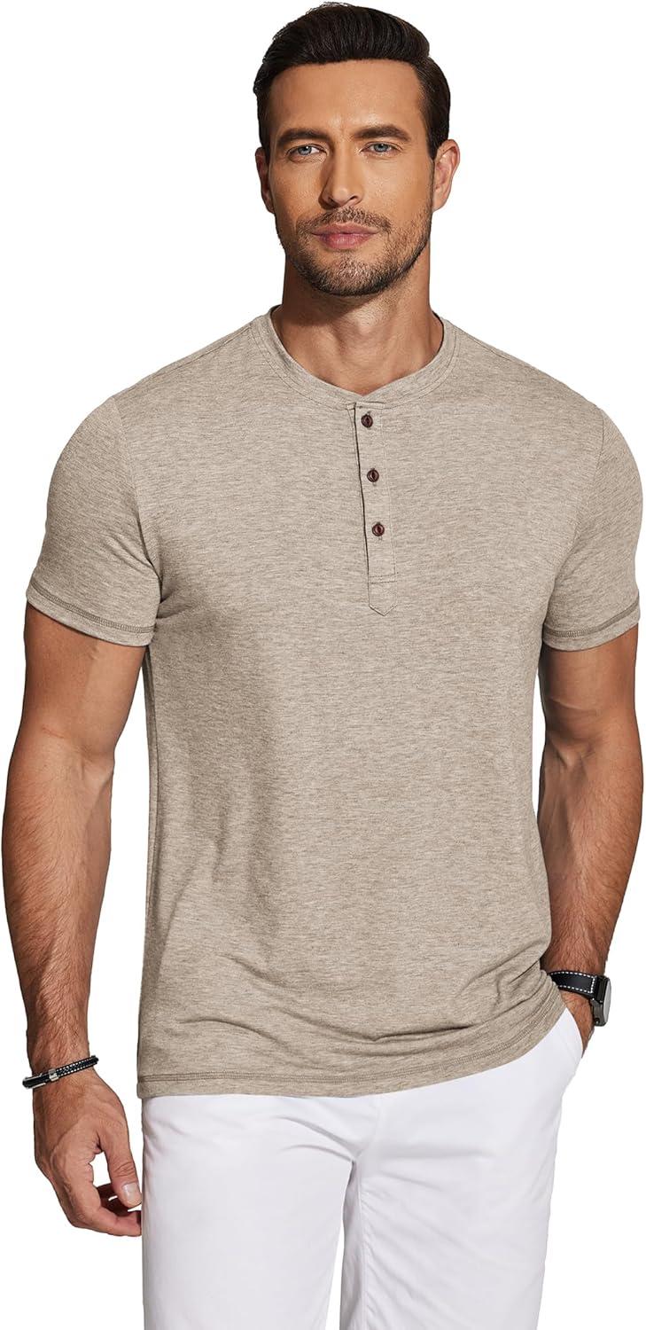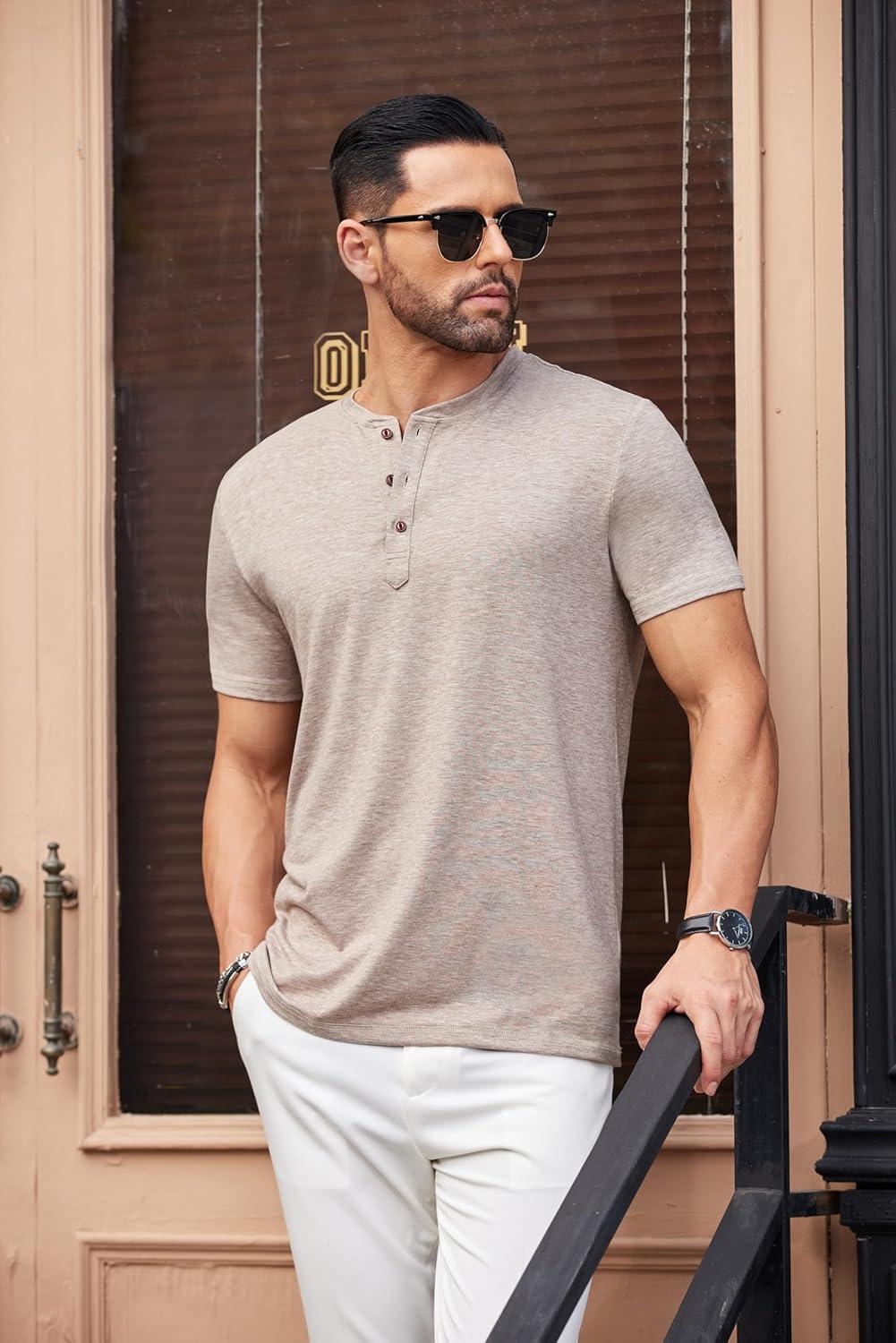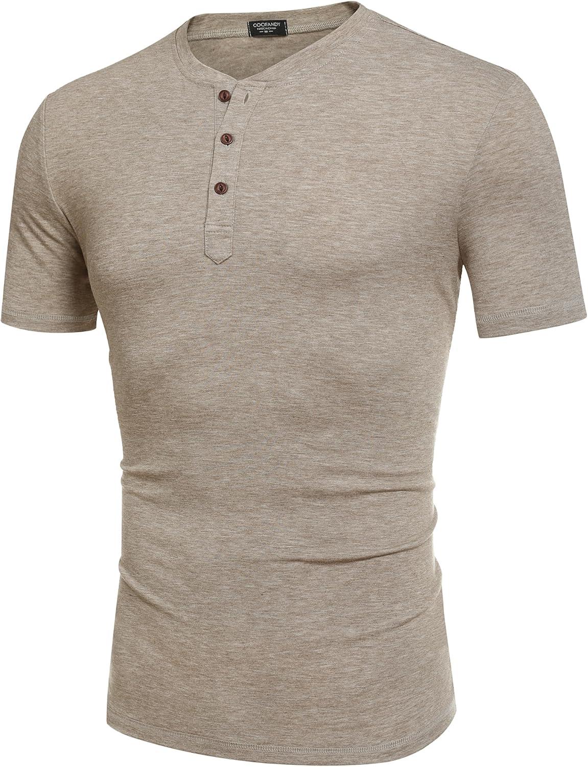 COOFANDY Men’s Henley Shirts Short Sleeve Casual Basic Tee Summer Button Henley Soild T Shirts(Khaki)